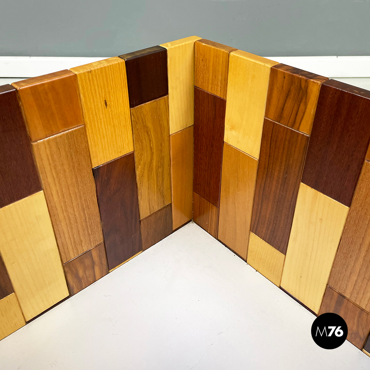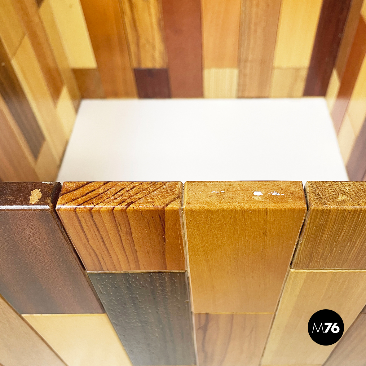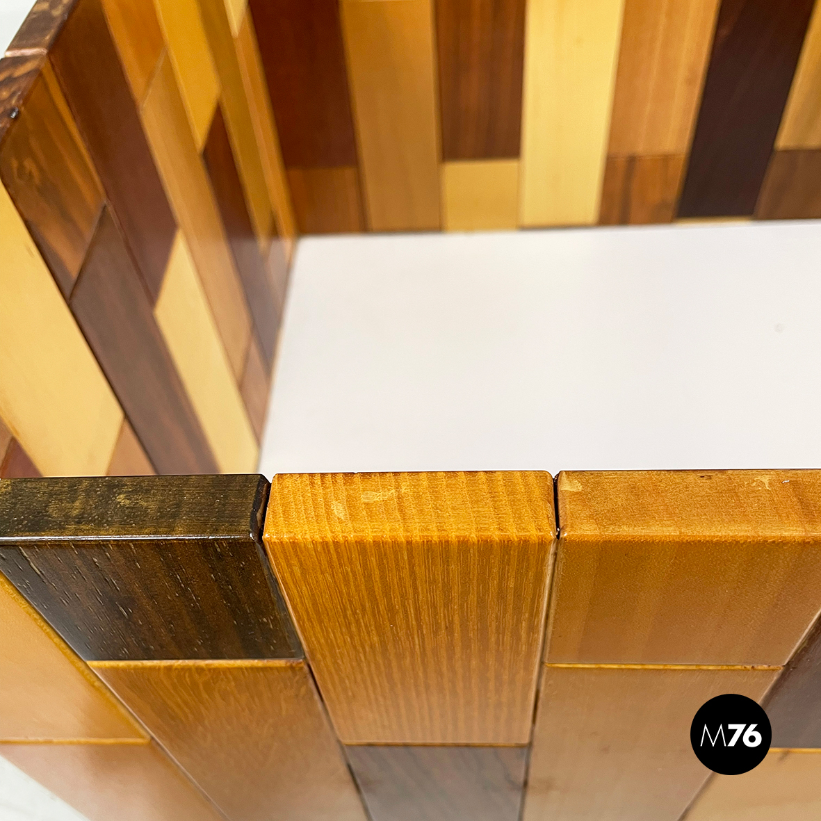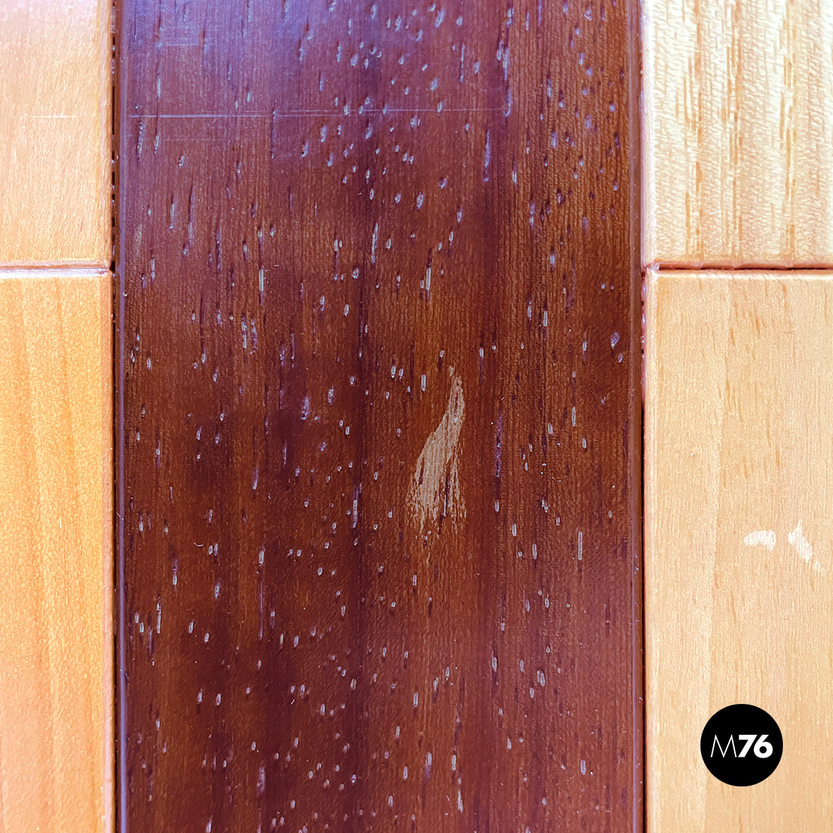 Coppia di fioriere a base quadrata con struttura in listelli di legno di differenti colori. La base è bianca. Sotto presenta quattro ruote nere.