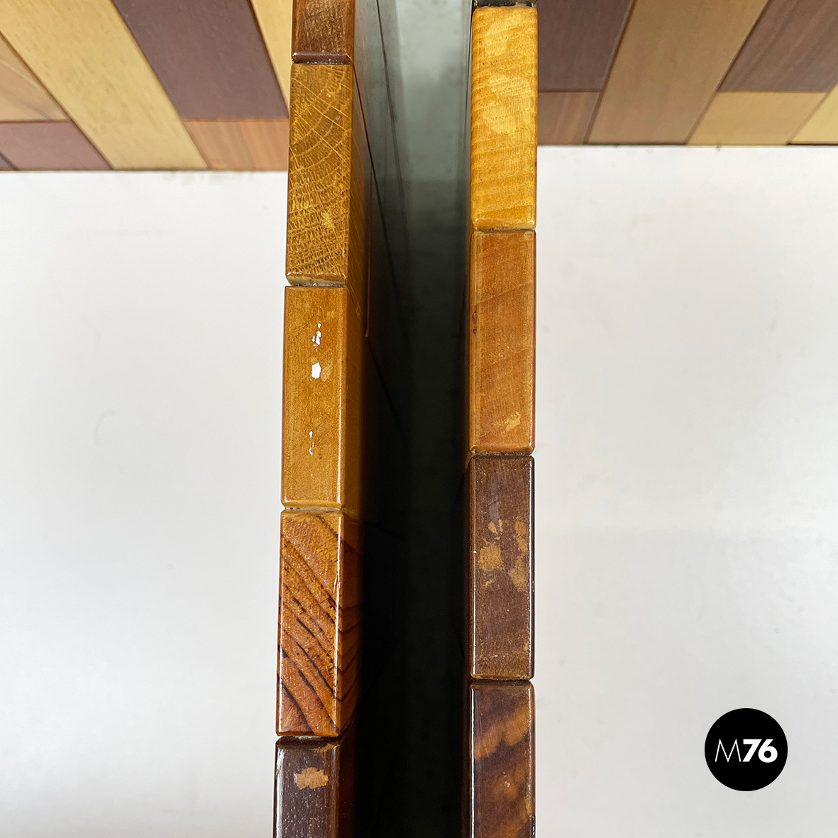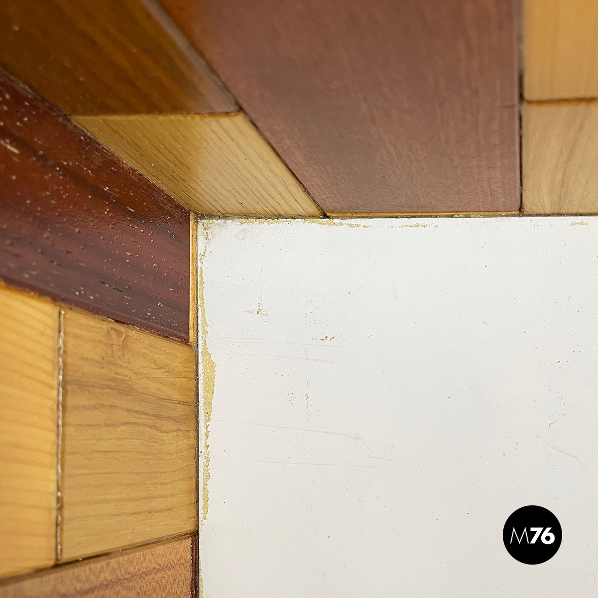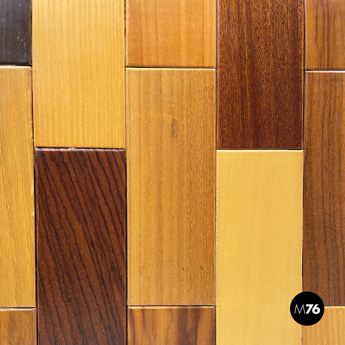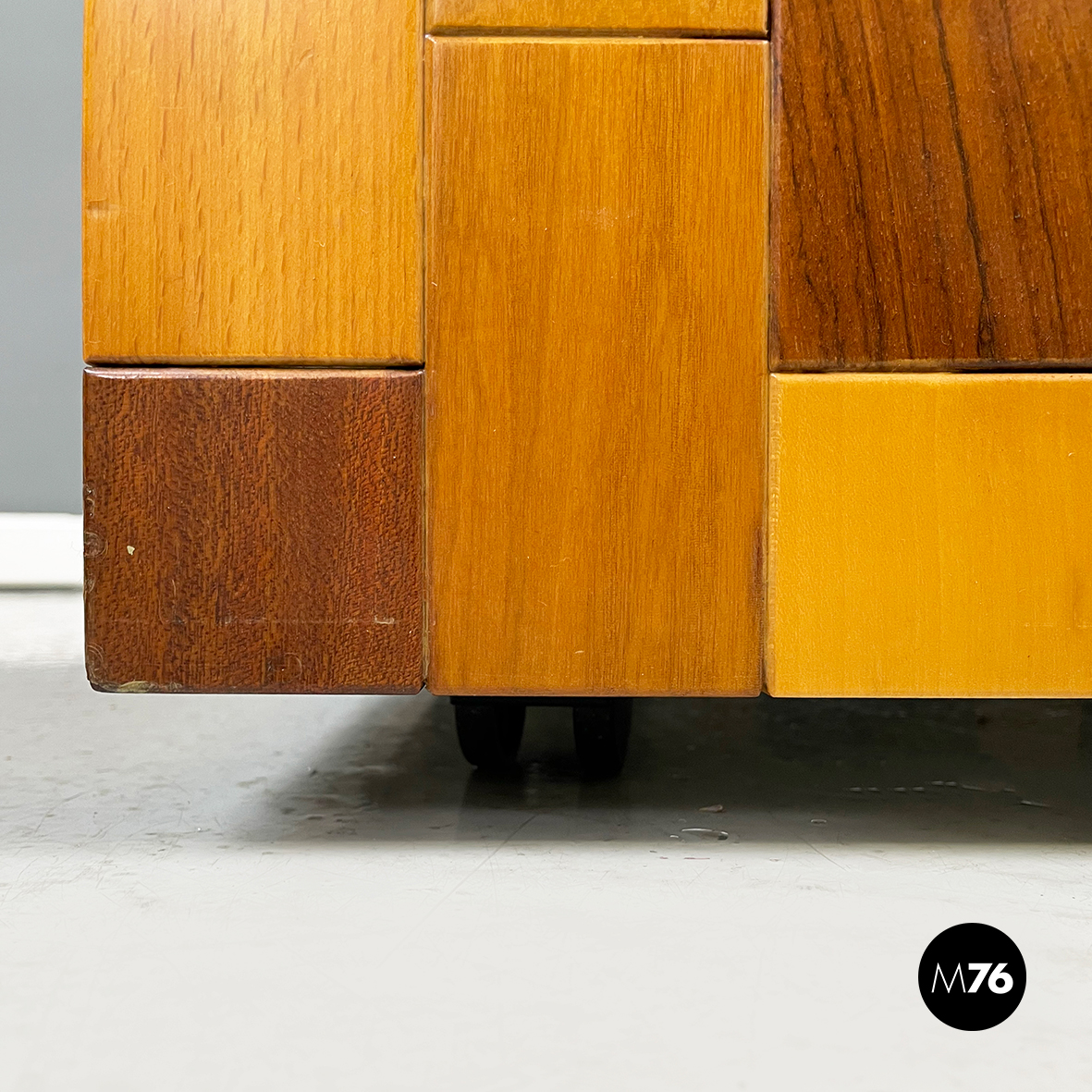 Coppia di fioriere a base quadrata con struttura in listelli di legno di differenti colori. La base è bianca. Sotto presenta quattro ruote nere.