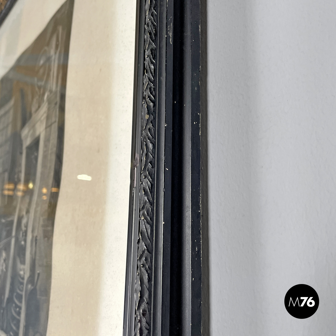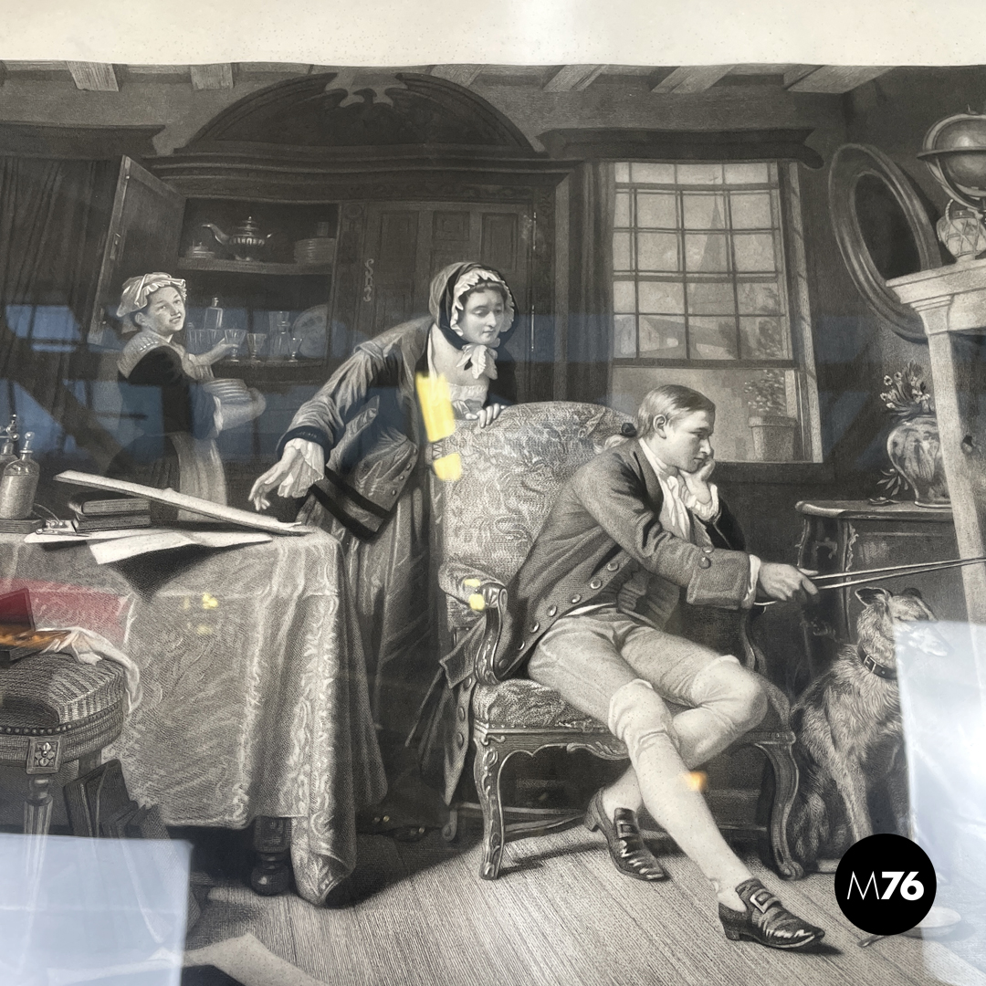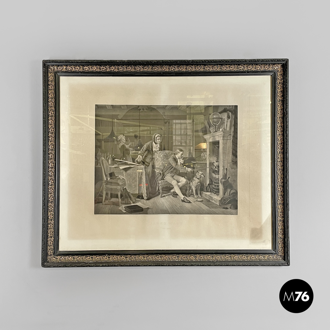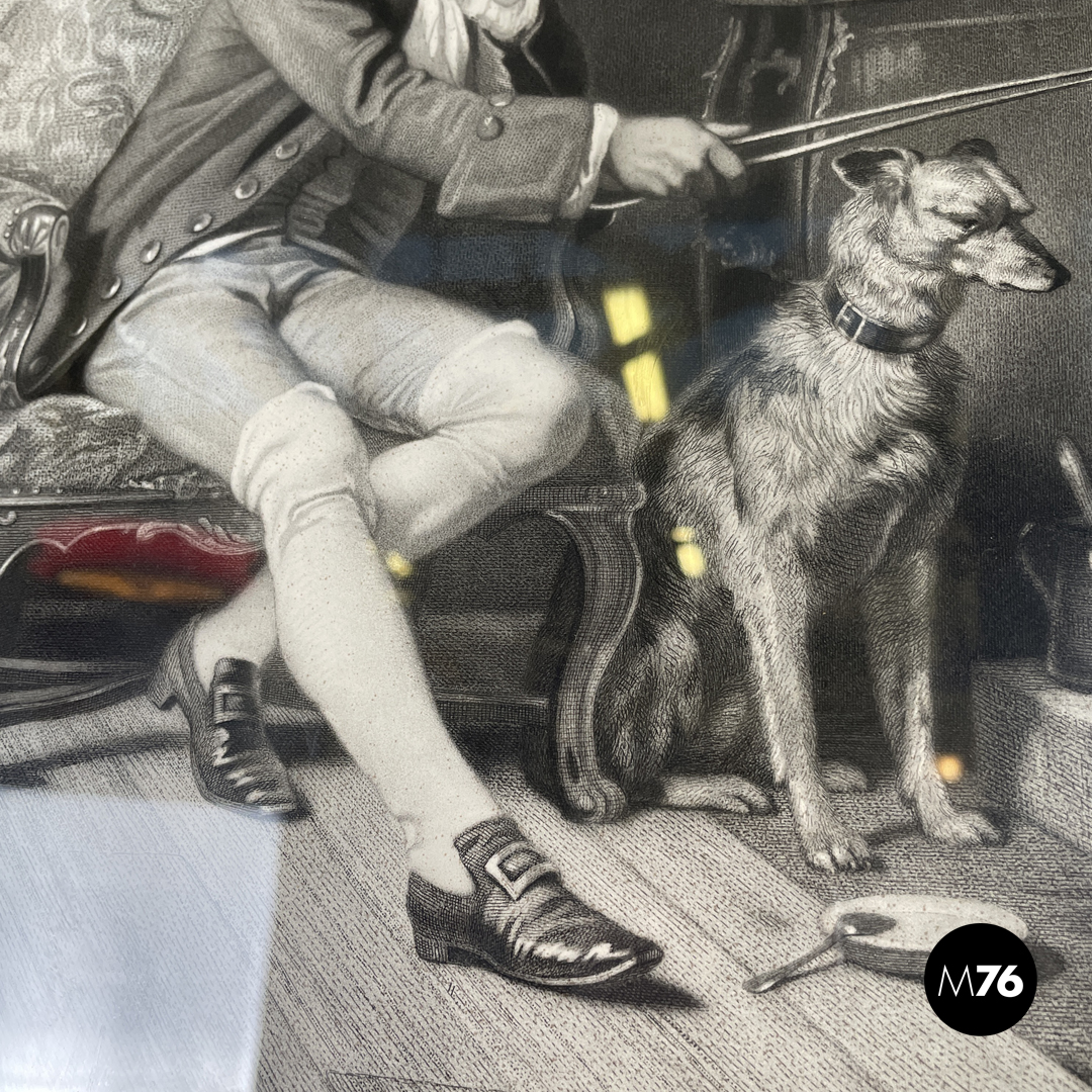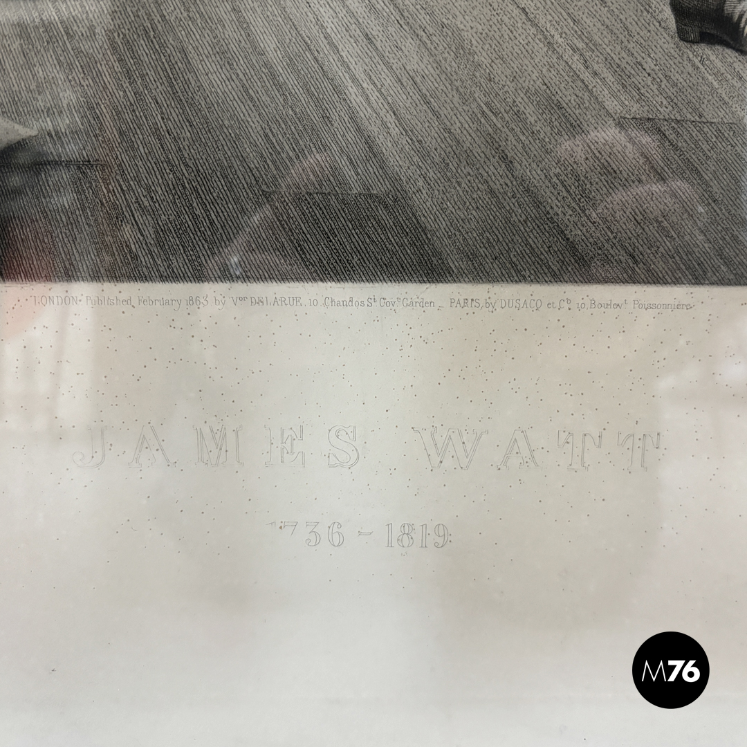 Incisione calcografica ad acquaforte con cornice. La stampa rappresenta lo scienziato James Watt nel suo studio vicino al camino, in compagnia di un cane e di due figure femminili. Al centro, sotto la composizione si trova la scritta “James Watt 1736-1819”, presenti inoltre i nomi e i luoghi della pubblicazione. La cornice rettangolare del quadro è in legno nero arricchita nella parte frontale da una lastra in metallo scolpita con decorazioni floreali dorate.