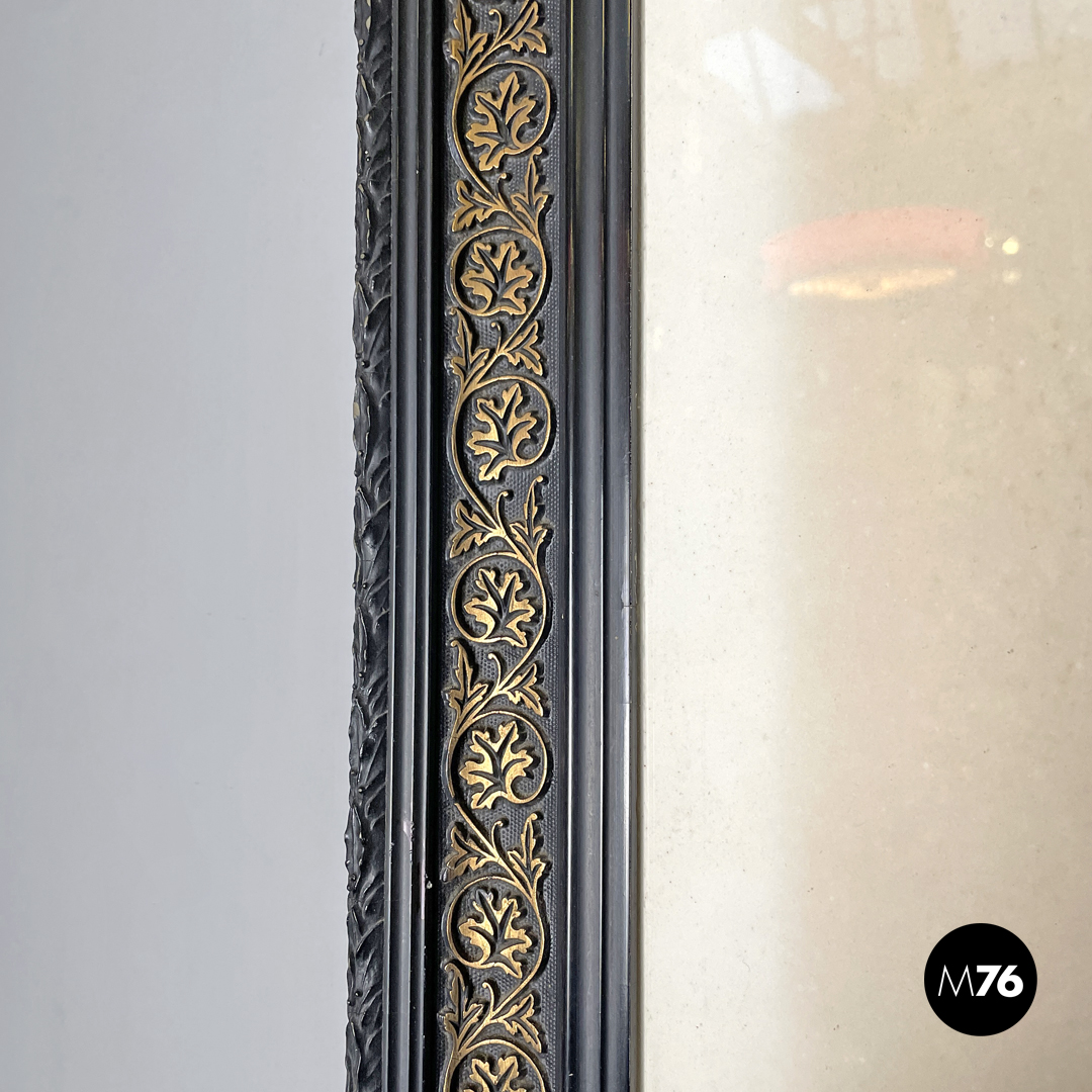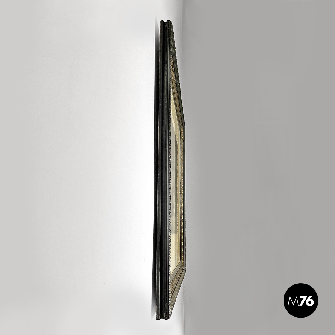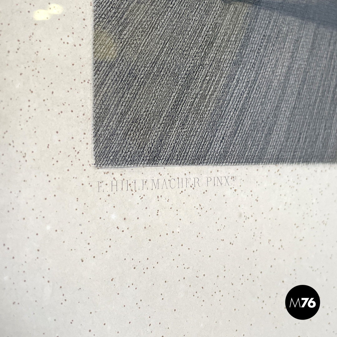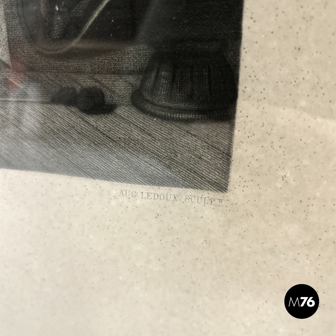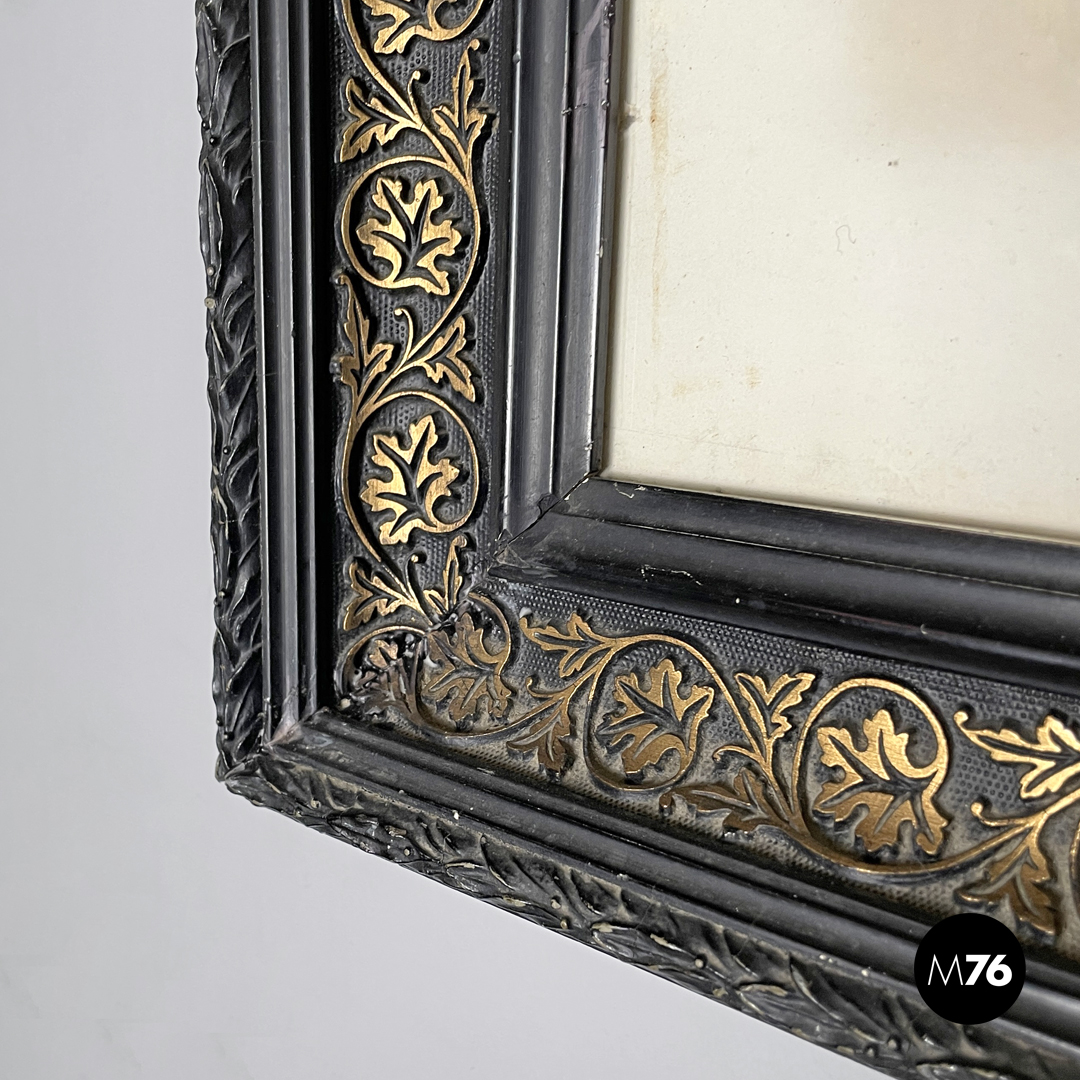 Incisione calcografica ad acquaforte con cornice. La stampa rappresenta lo scienziato James Watt nel suo studio vicino al camino, in compagnia di un cane e di due figure femminili. Al centro, sotto la composizione si trova la scritta “James Watt 1736-1819”, presenti inoltre i nomi e i luoghi della pubblicazione. La cornice rettangolare del quadro è in legno nero arricchita nella parte frontale da una lastra in metallo scolpita con decorazioni floreali dorate.