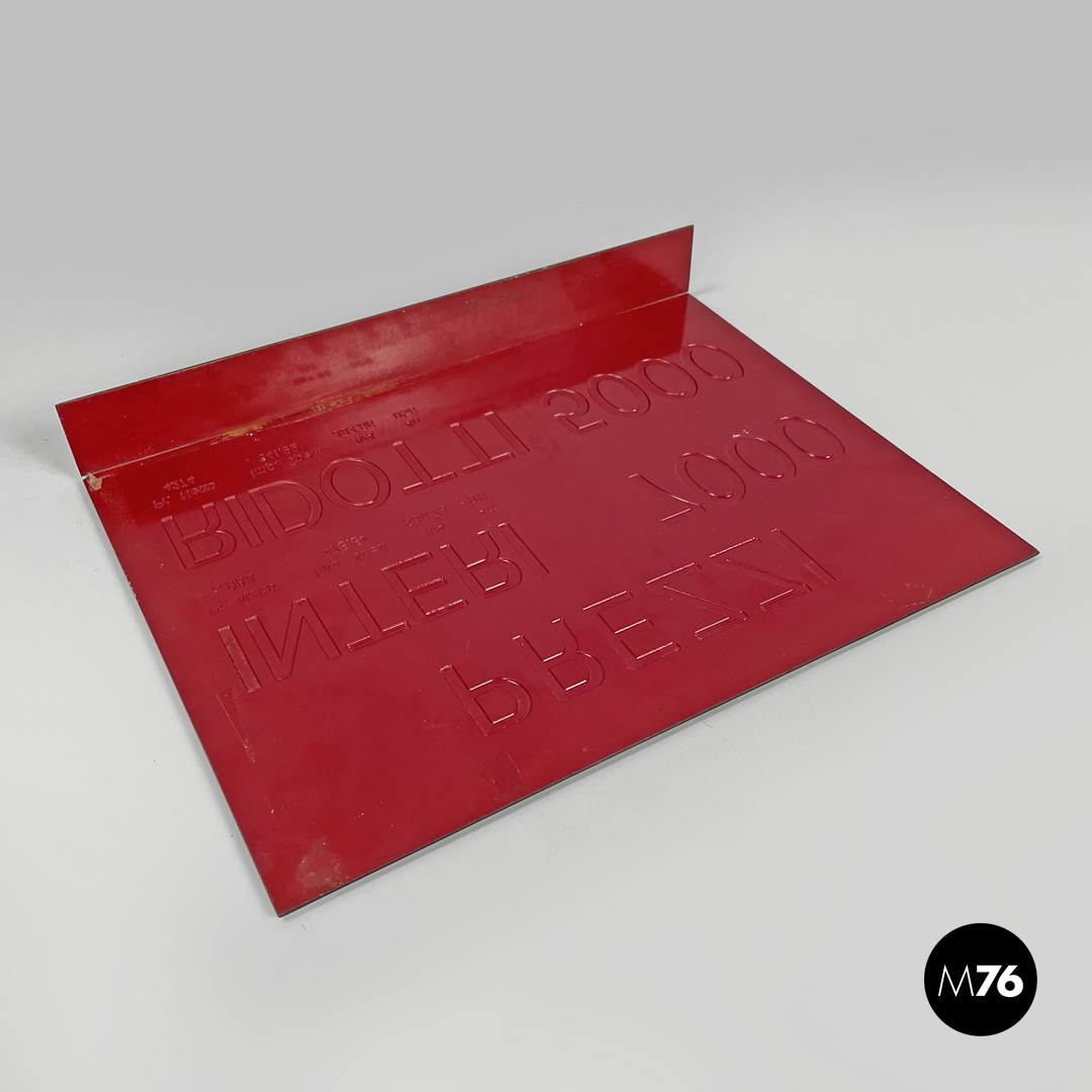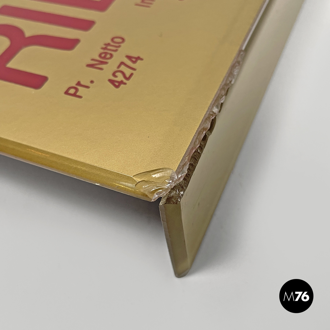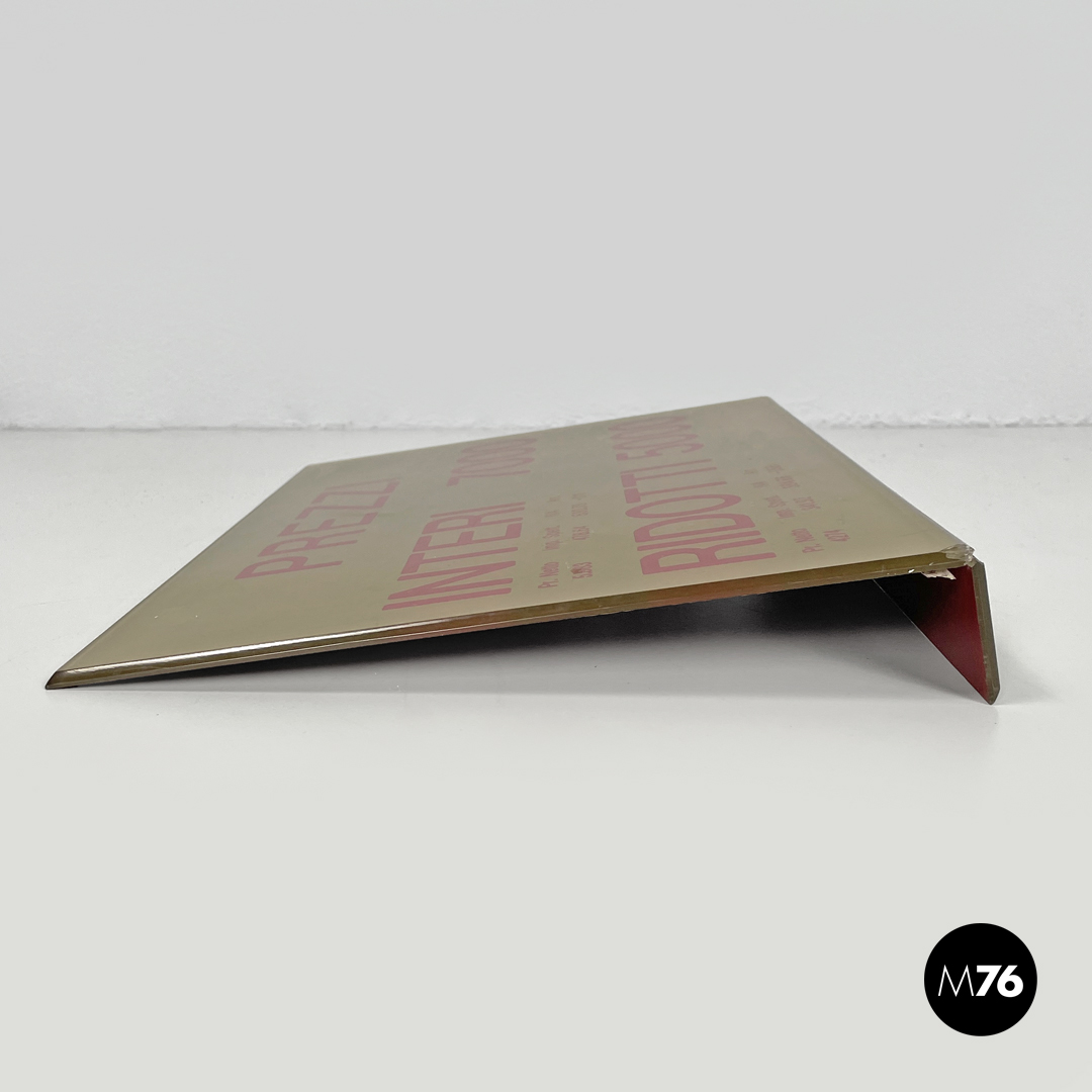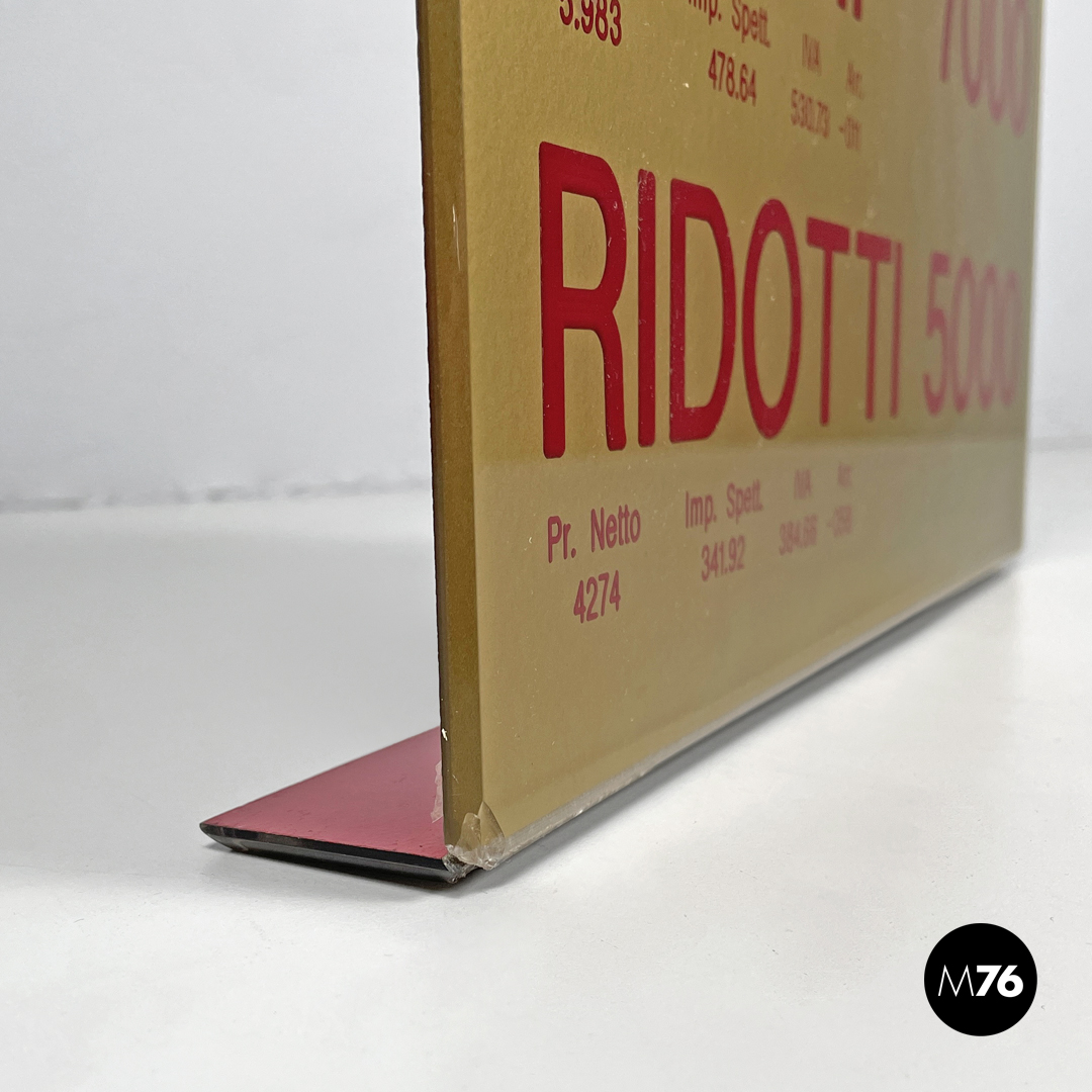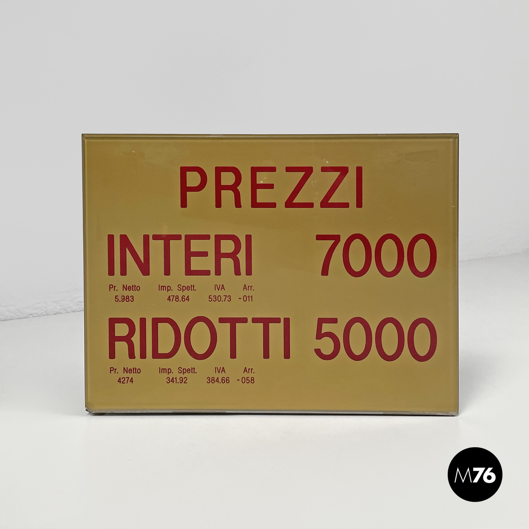 Insegna prezzario cinema o teatro in plastica dorata. Sulla parte frontale sono presentile scritte “Prezzi Interi 7000 Ridotti 5000” in rosso. Il retro del cartello è in plastica rossa.