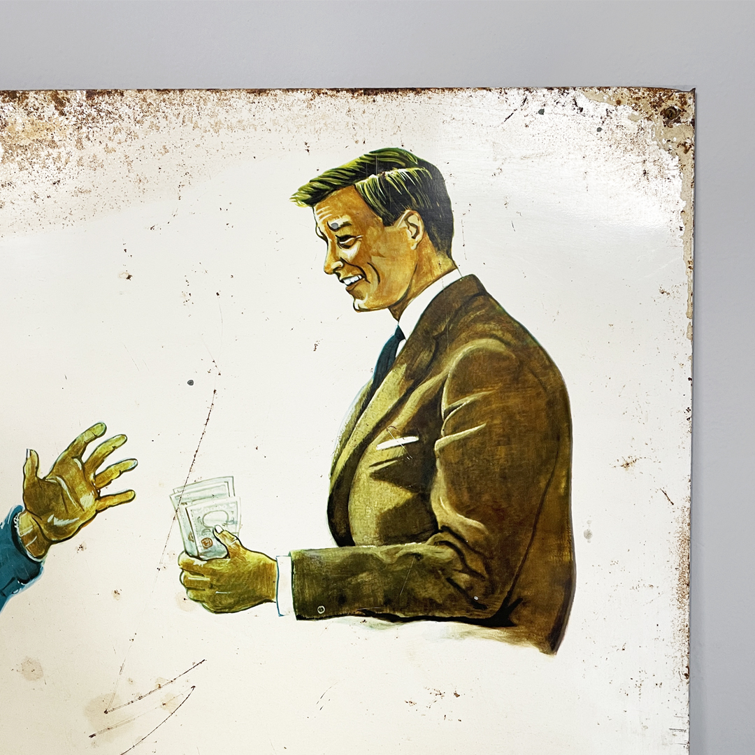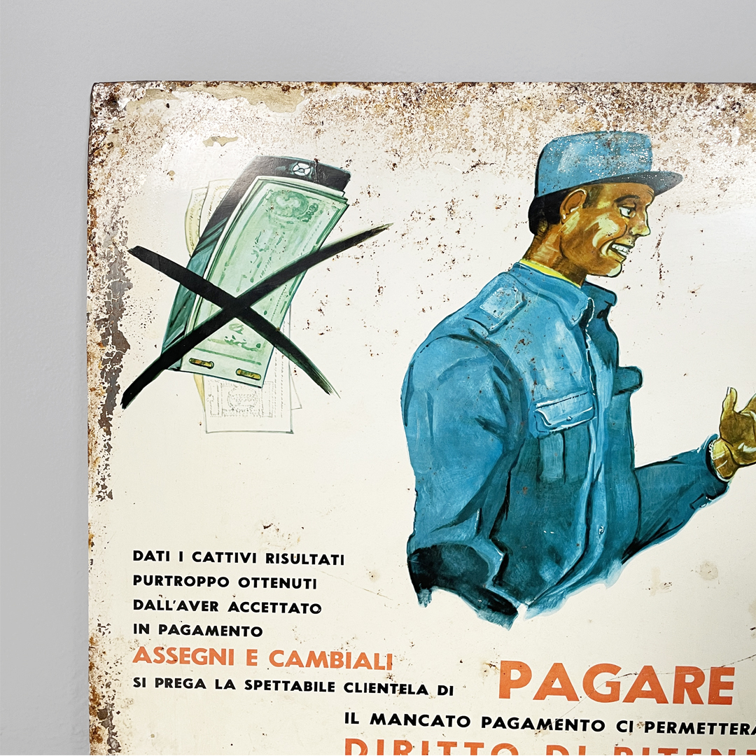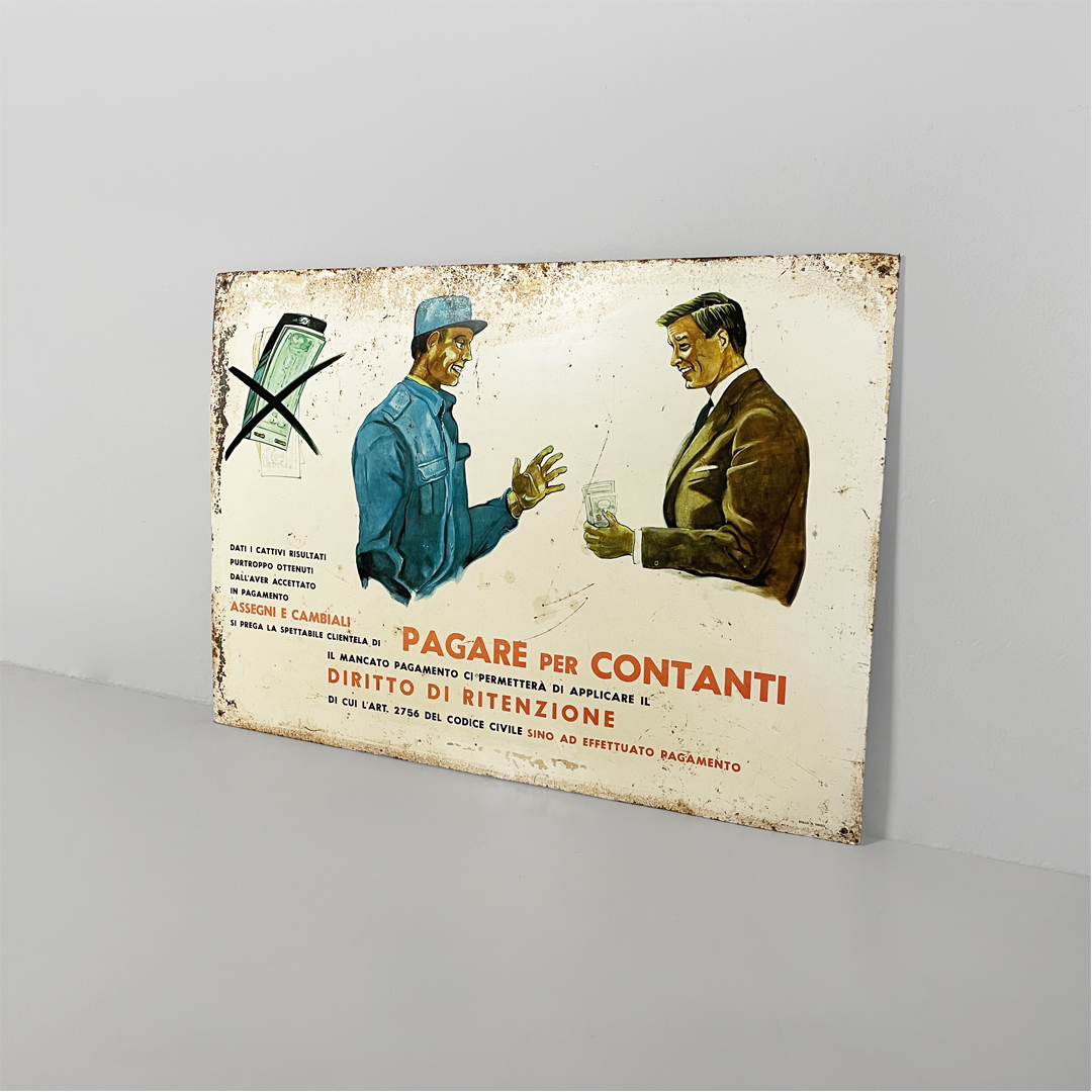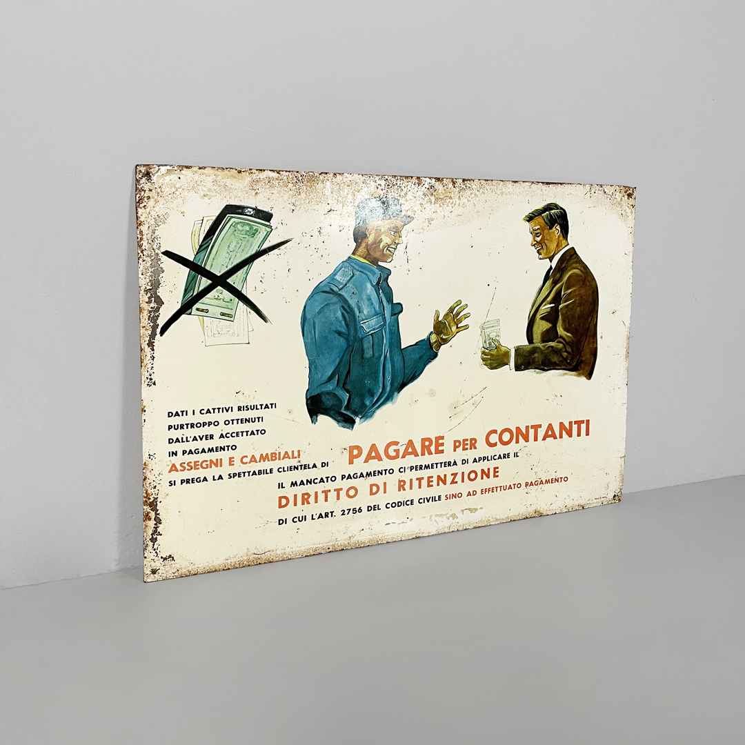 Insegna in metallo. L’illustrazione mostra due uomini: uno in tuta da lavoro, l’altro in abito elegante che porge del denaro contante. A sinistra c’è un disegno di assegni e cambiali barrati con una grande “X” nera, a indicare che non sono accettati pagamenti non in contanti. Infine troviamo un avvertenza che il mancato pagamento comporta l’applicazione del diritto di ritenzione secondo il Codice Civile.