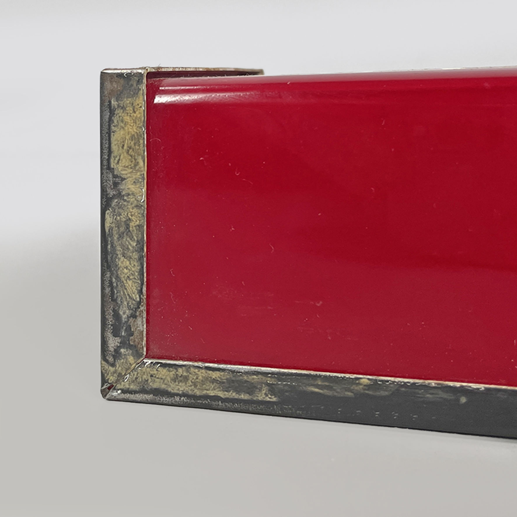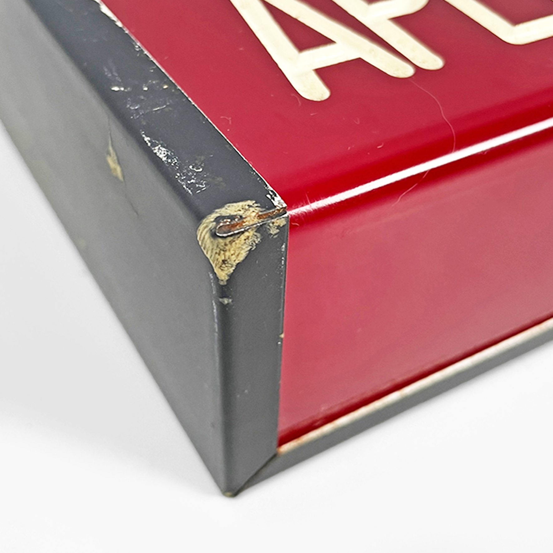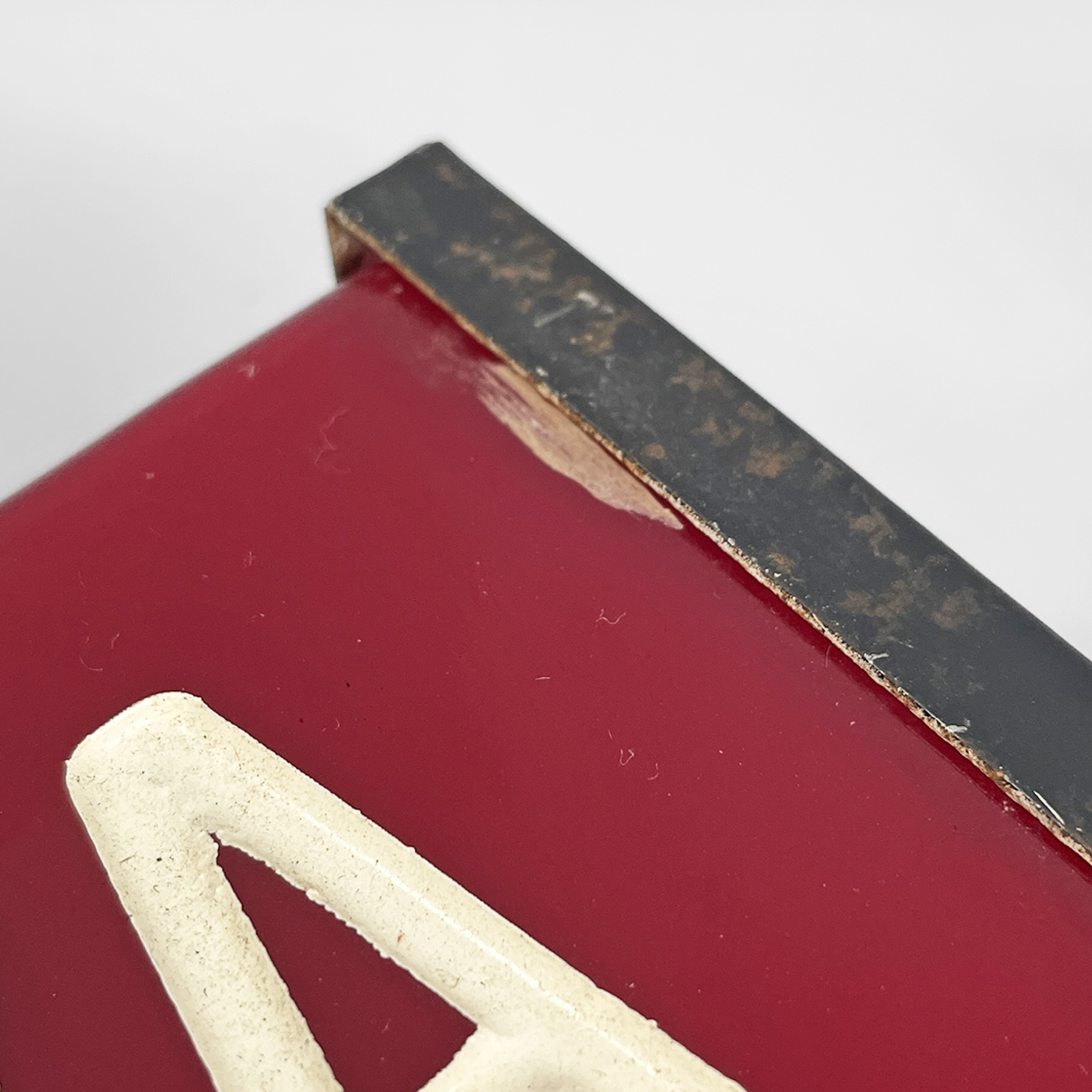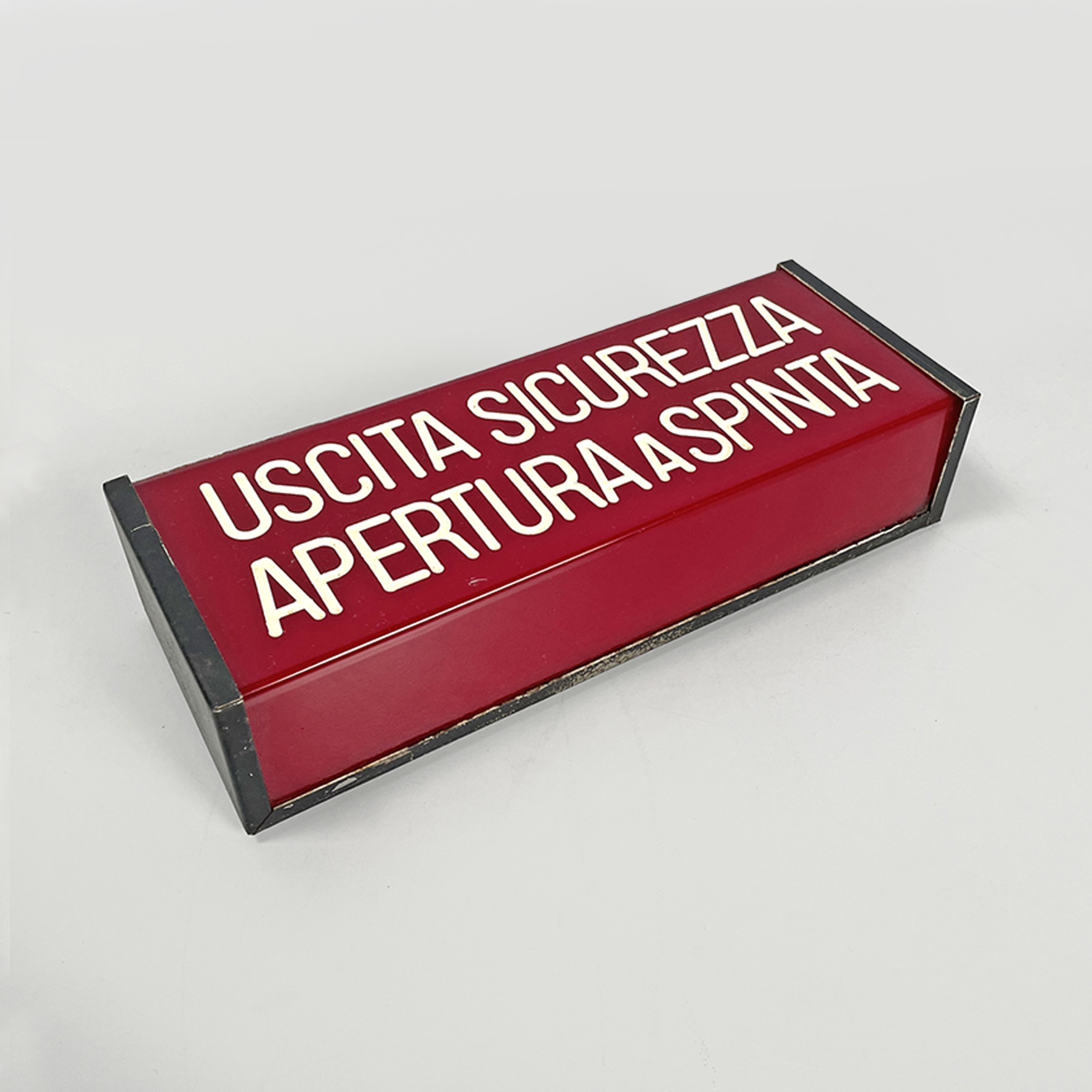 Rectangular cinema or theater sign. The front structure is made of red plastic with engraved white writing bearing the words “Uscita Sicurezza Apertura a Spinta”. The back is made of black painted metal.