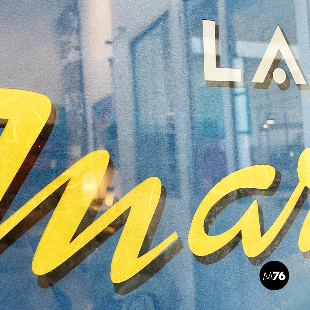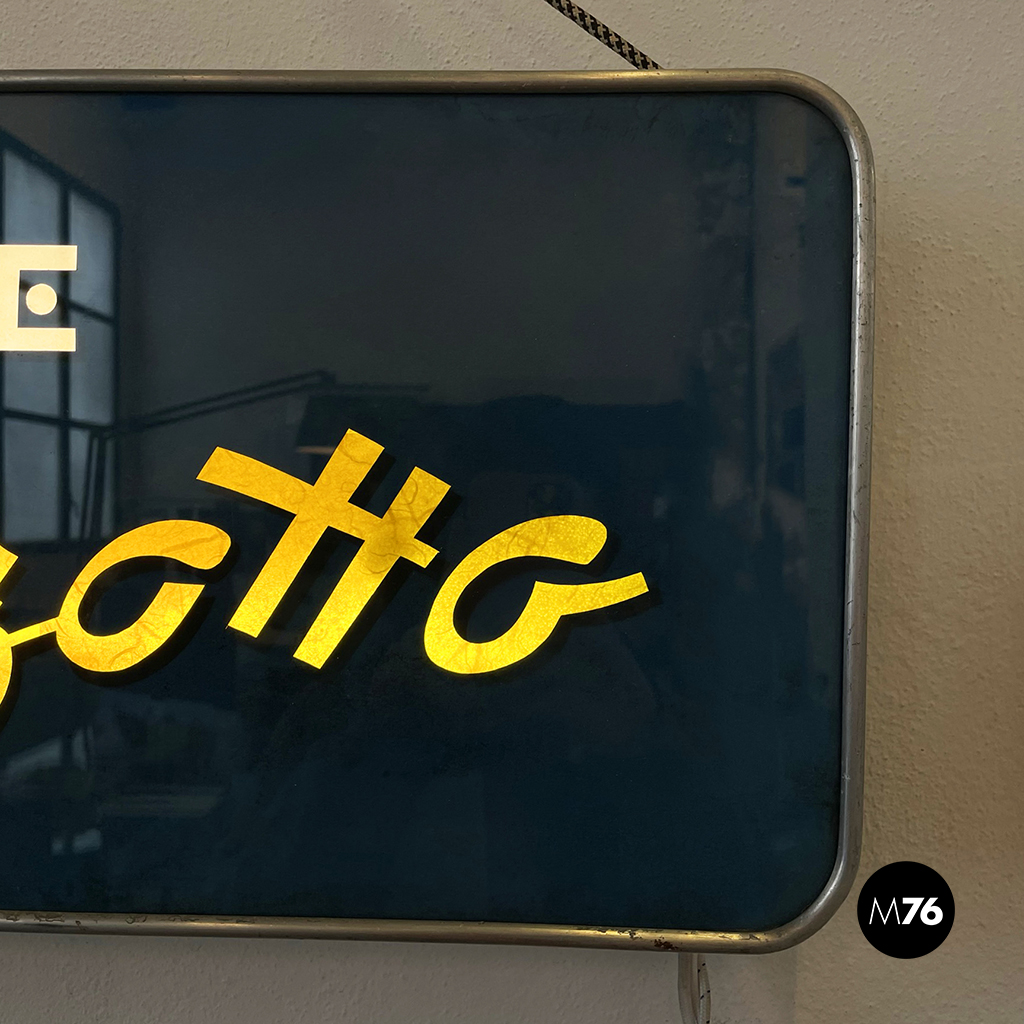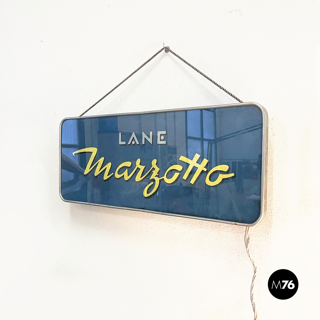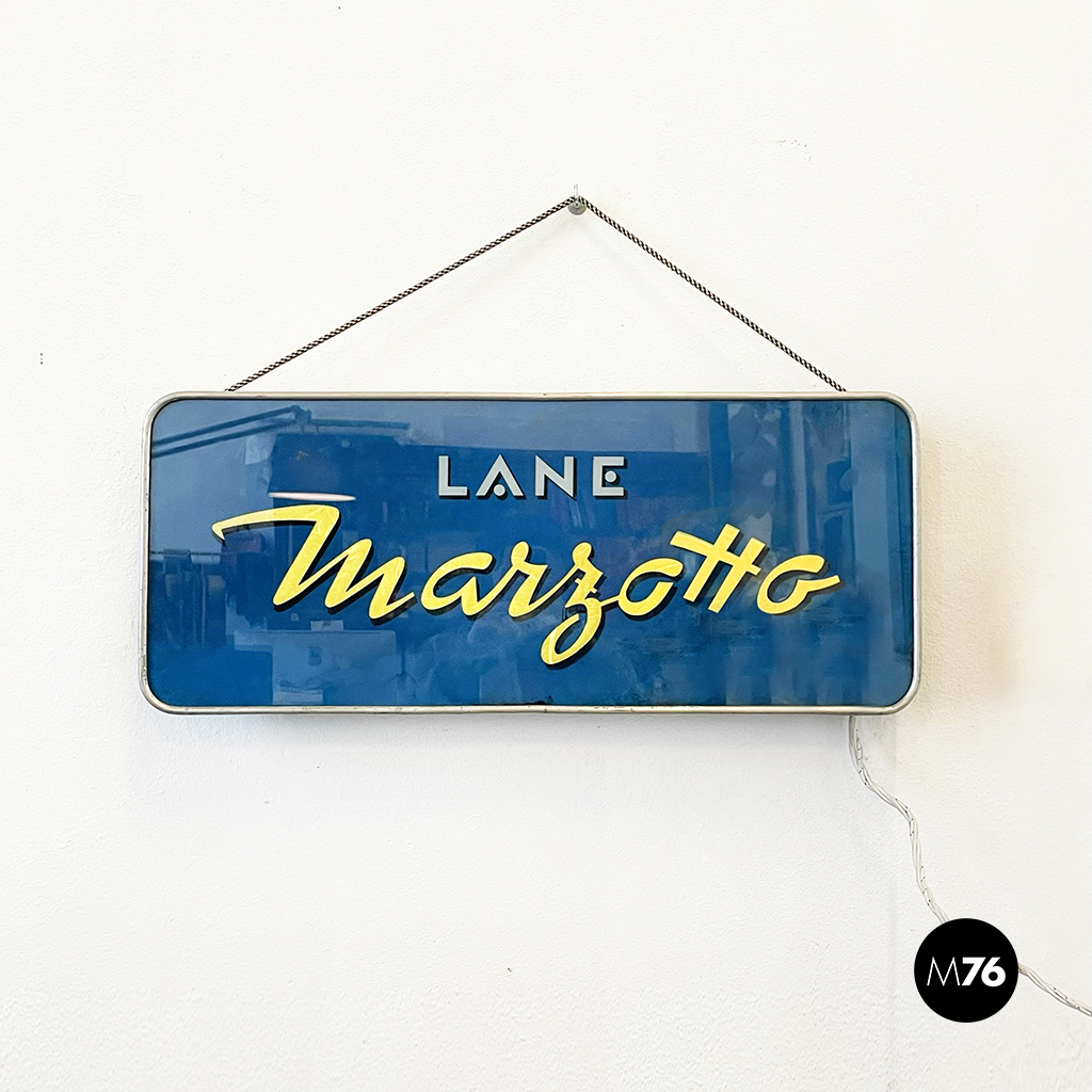 Insegna luminosa da parete di forma rettangolare con angoli arrotondati. Sul pannello centrale in plastica è presente la scritta Lane Marzotto in grigio e giallo su sfondo blu, la quale è retro illuminata. La struttura è in metallo. Sul retro è presente una corda per poterla appendere.