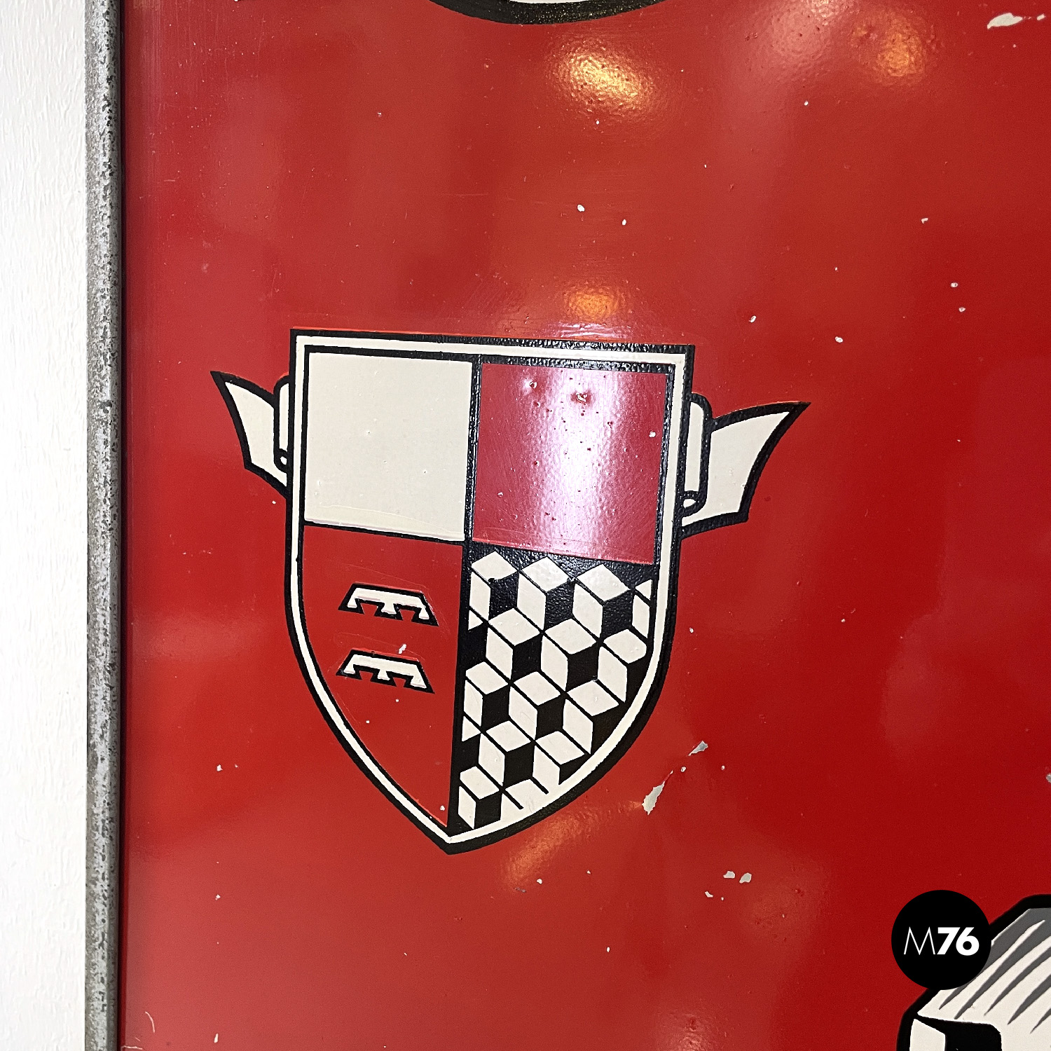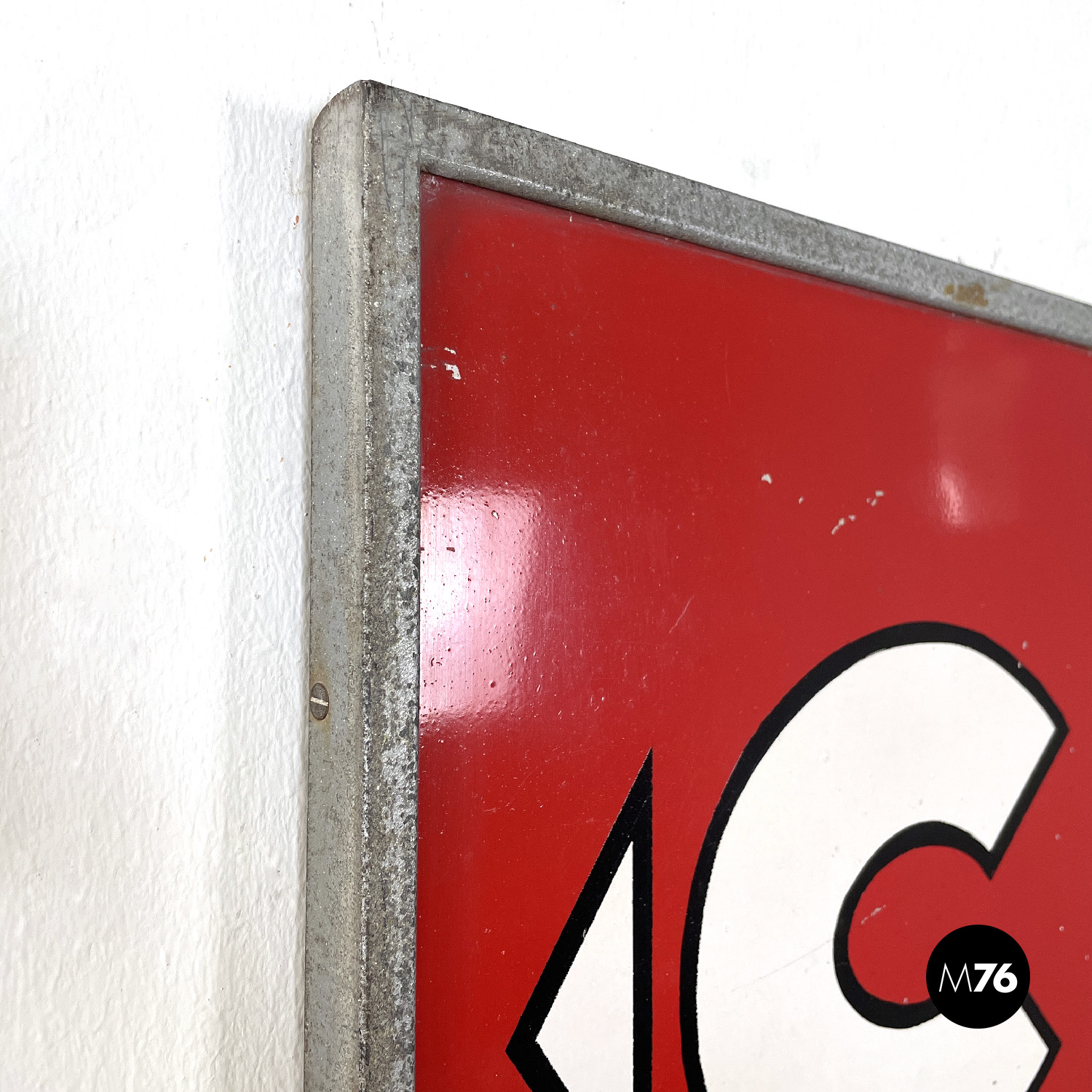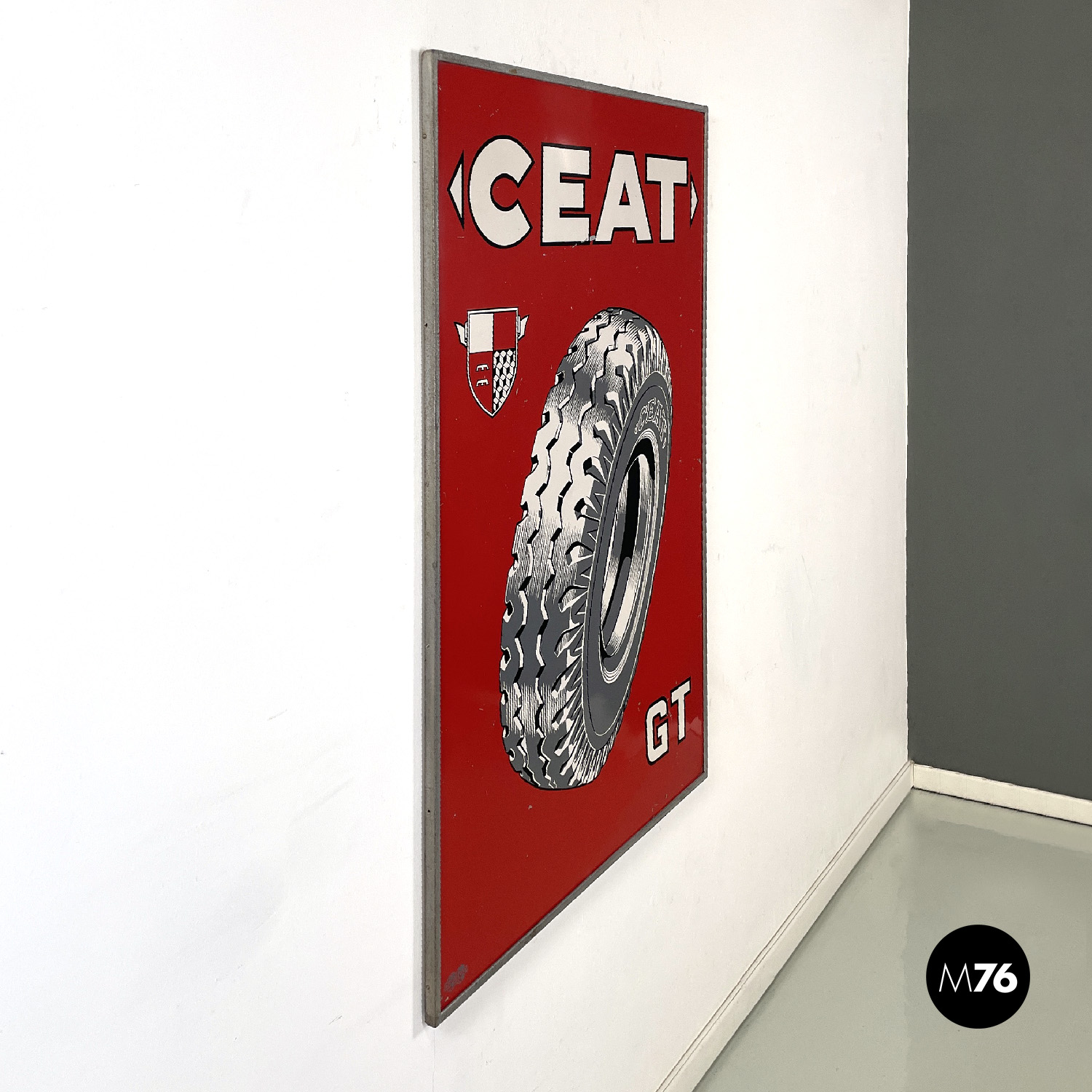 Insegna o cartellone pubblicitario rettangolare in alluminio. Presenta una grafica pubblicitaria della “Ceat”, noto brand di gomme, con sfondo rosso acceso, una gomma stilizzata grigia bianca e nera e il nome del brand bianco con bordo nero.