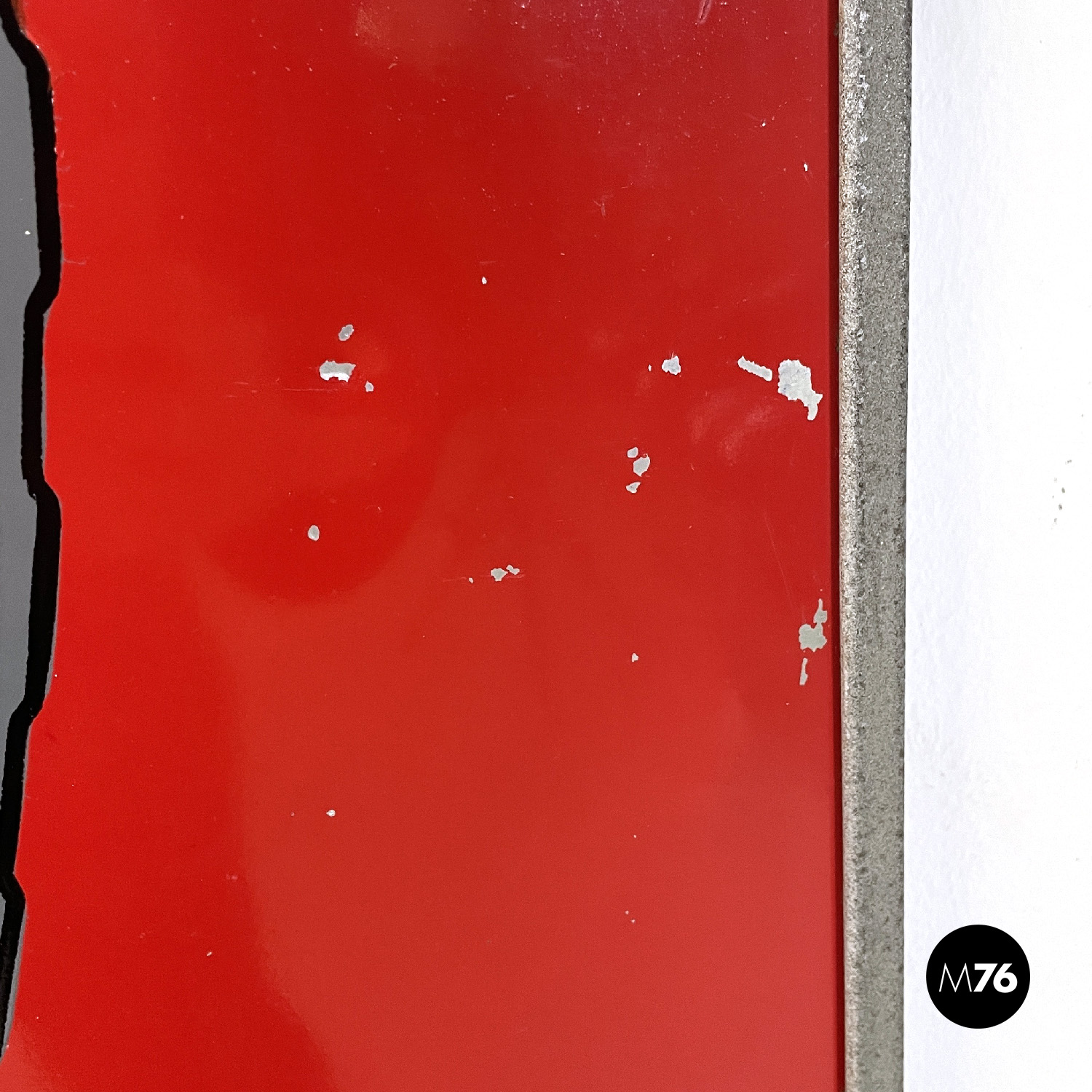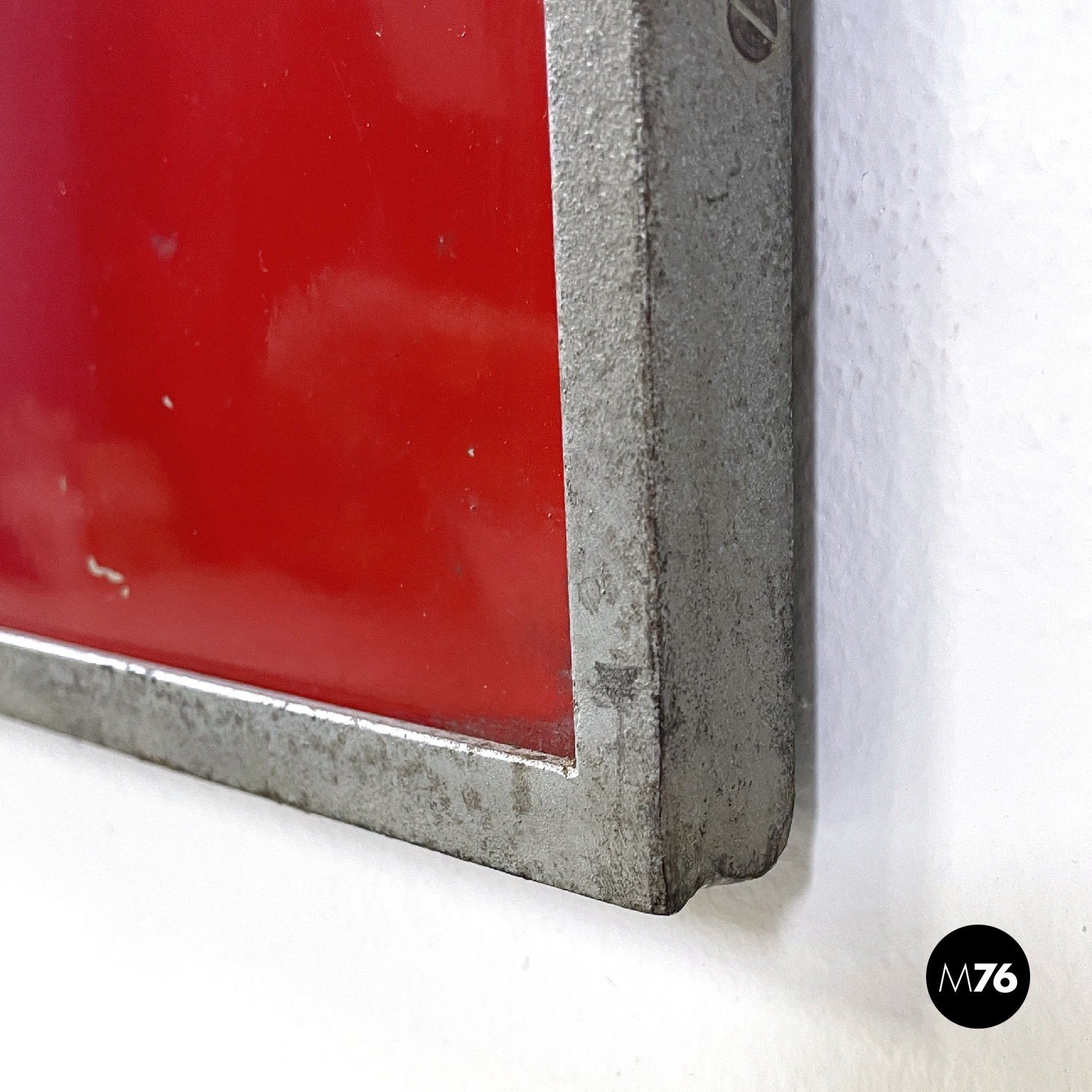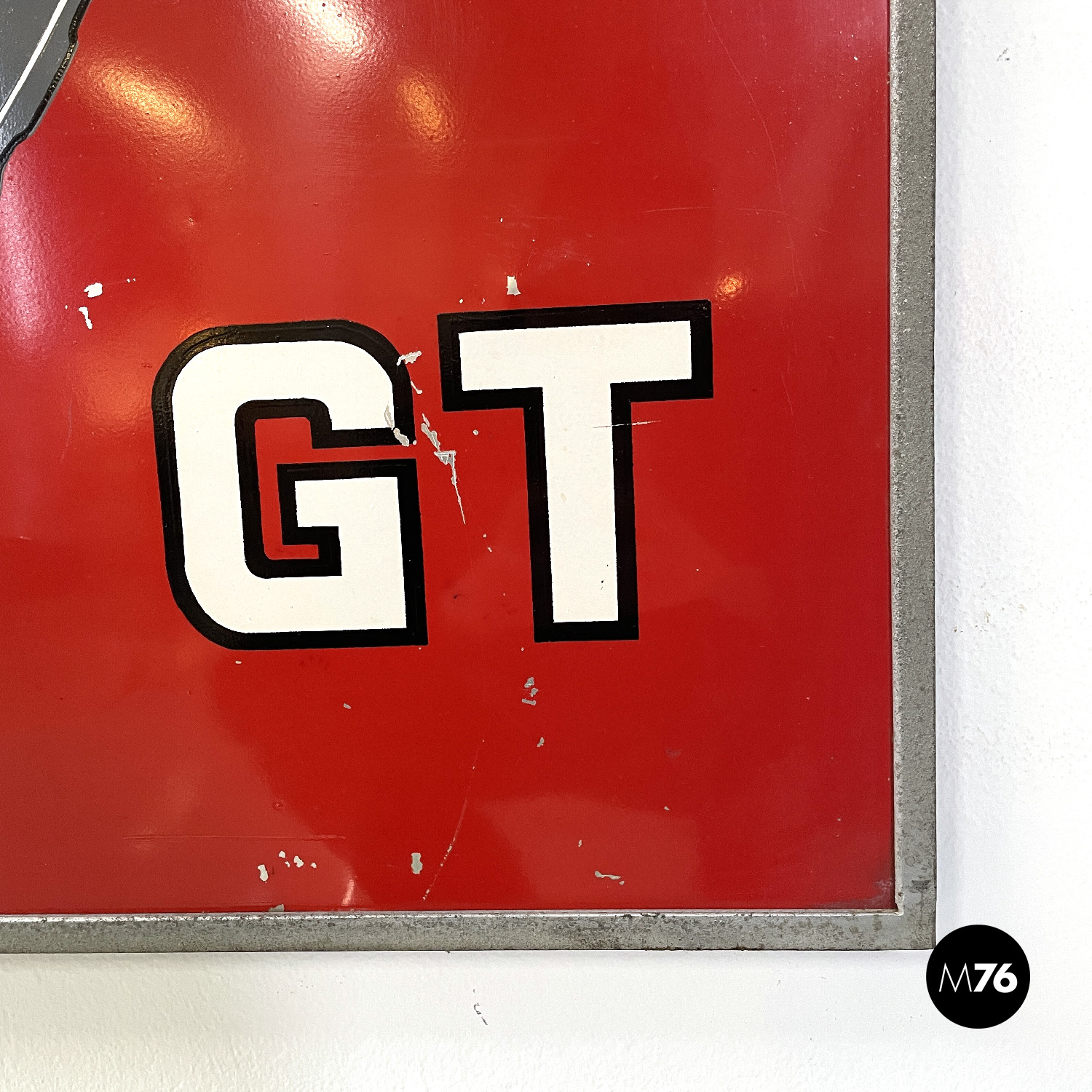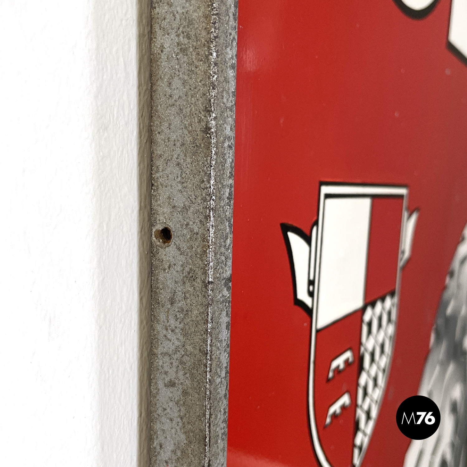 Insegna o cartellone pubblicitario rettangolare in alluminio. Presenta una grafica pubblicitaria della “Ceat”, noto brand di gomme, con sfondo rosso acceso, una gomma stilizzata grigia bianca e nera e il nome del brand bianco con bordo nero.