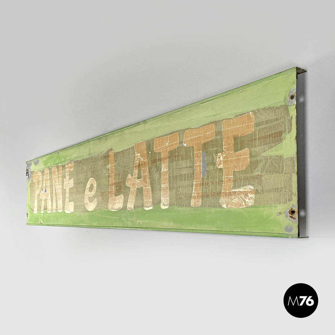 Insegna da parete rettangolare allungata in lamiera di metallo. La struttura è verniciata di verde pisello chiaro ed ha le scritte “Pane e Latte” in bianco.