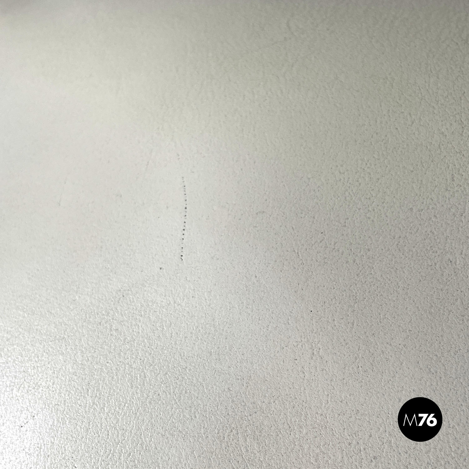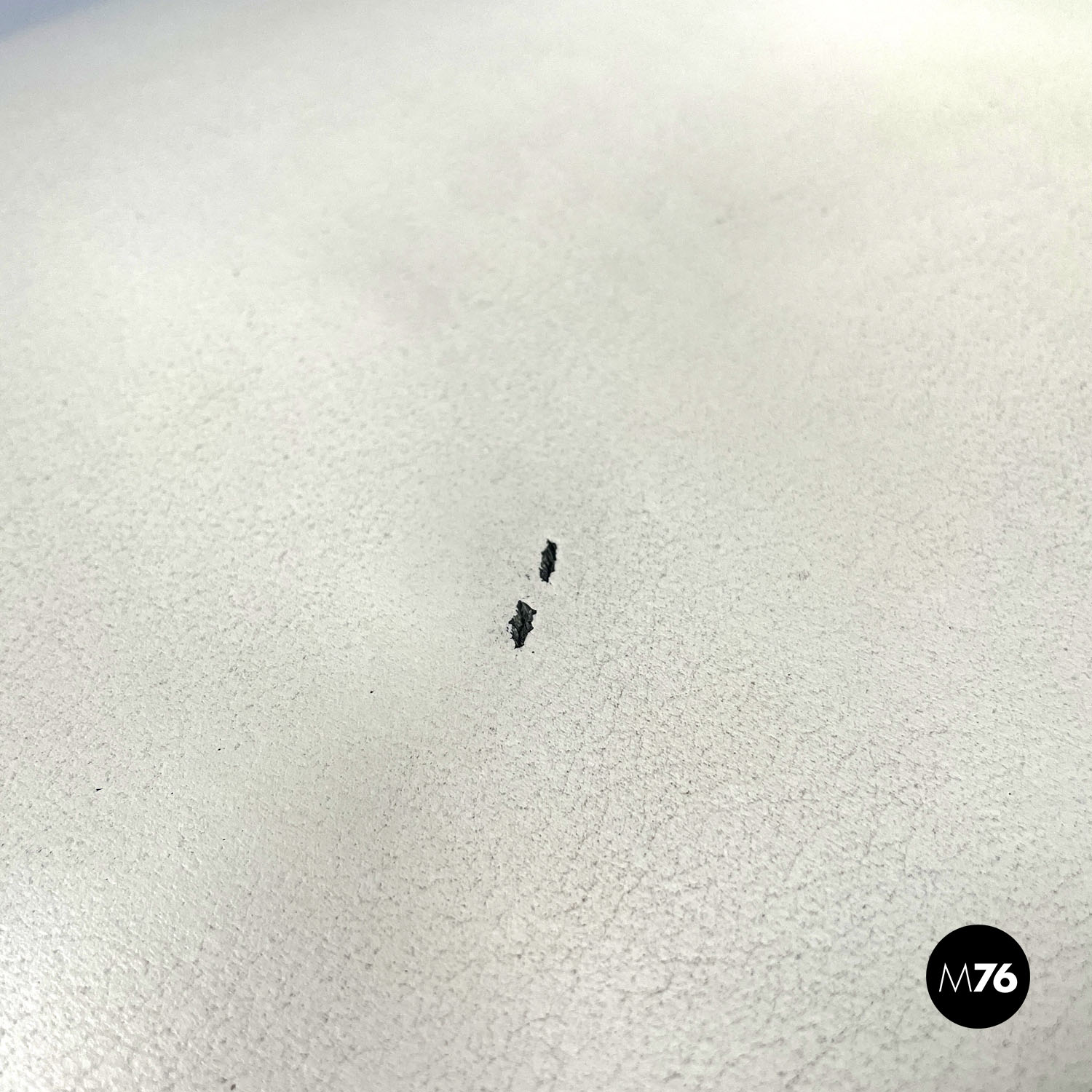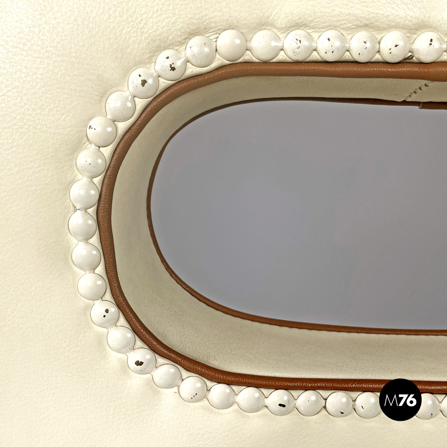 Buone condizioni, con qualche mancanza della pelle della seduta e della pittura bianca sulle borchie e generici segni dell’uso e del tempo.