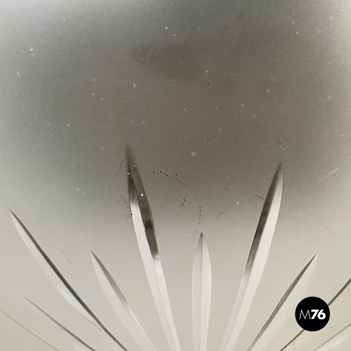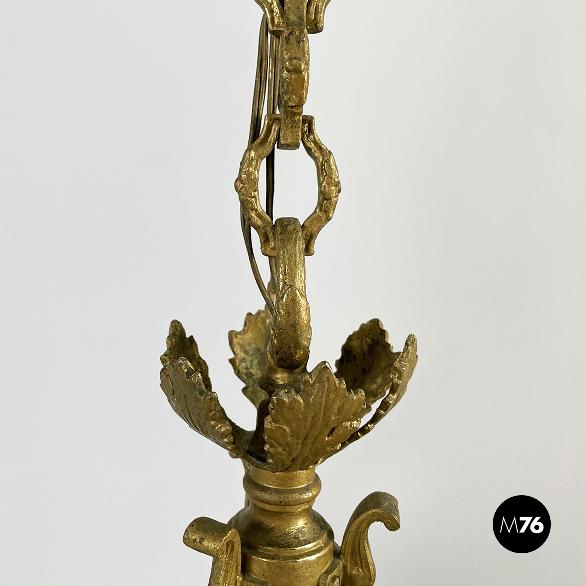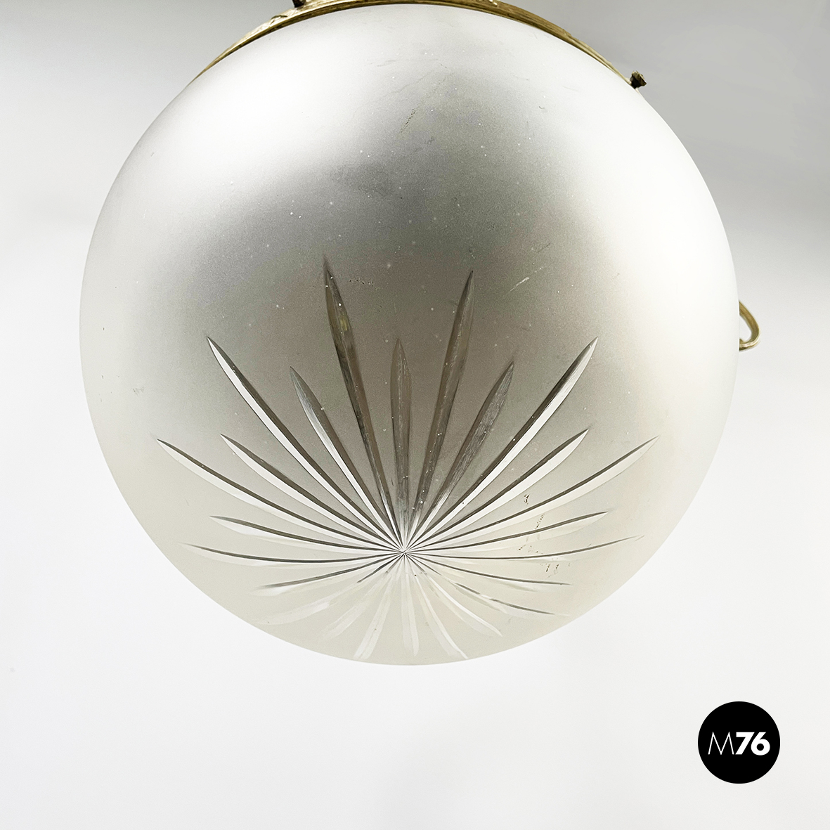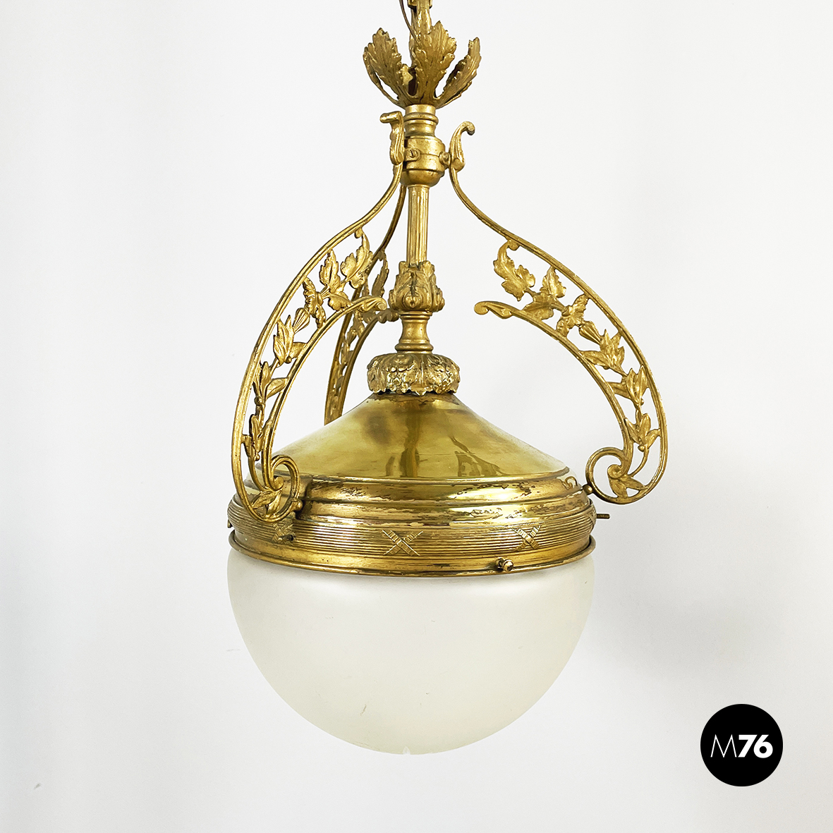 Lampadario con diffusore a semisfera decorato in vetro satinato stampato. La struttura in ottone con decori floreali si collega all’attacco al soffitto attraverso una catene in ottone. L’attacco a soffitto in ottone lavorato. Liberty.