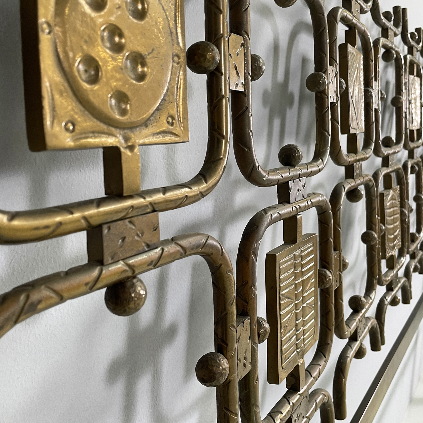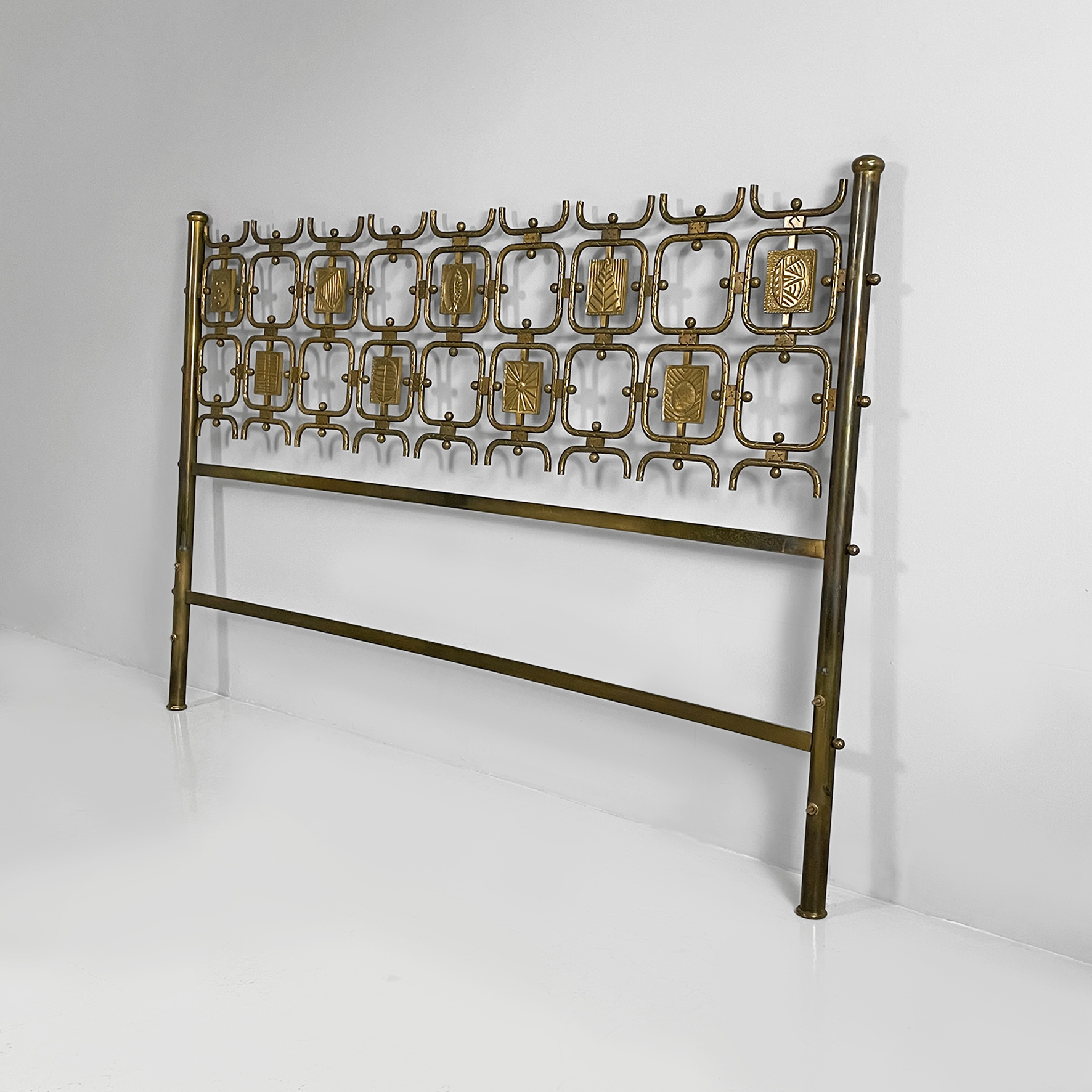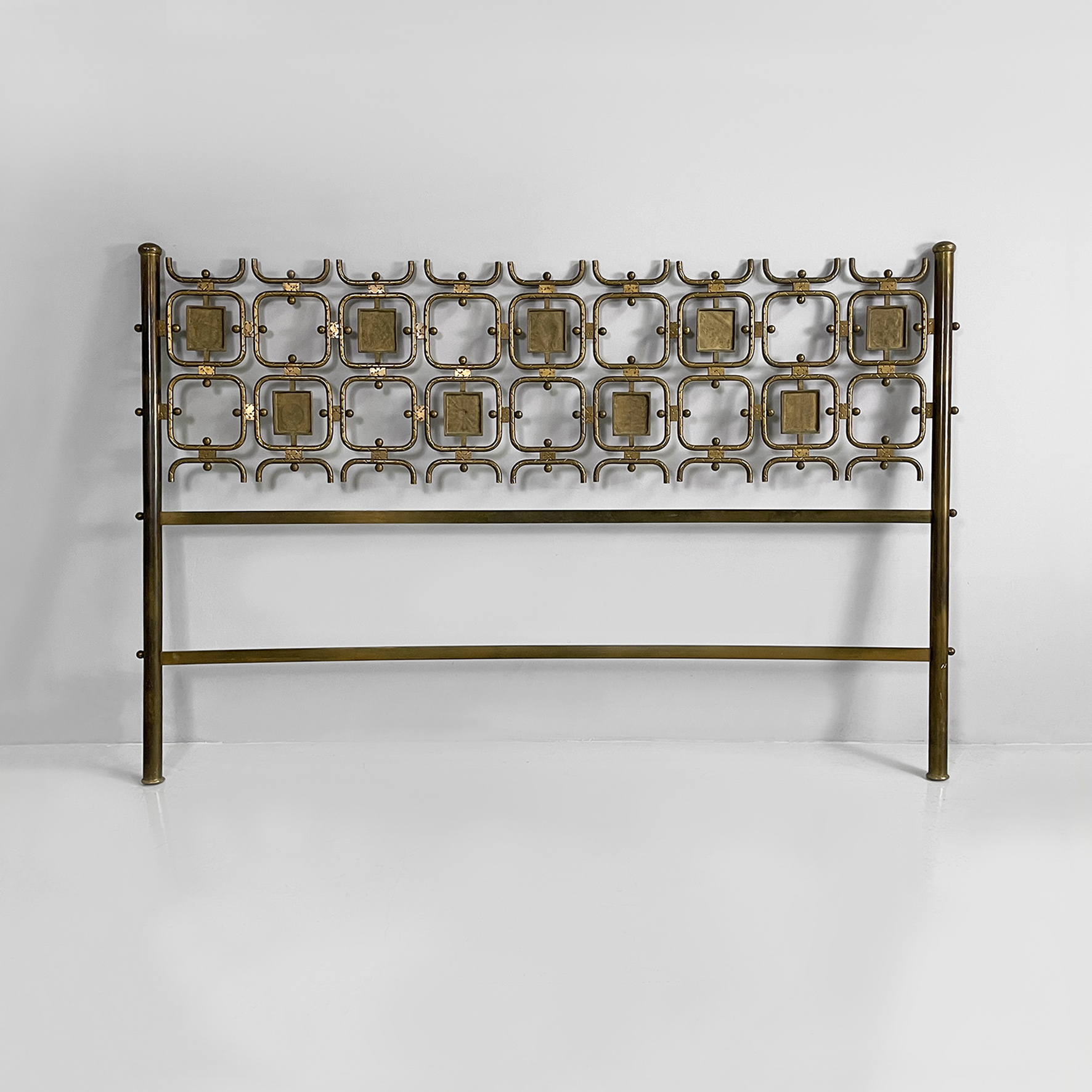 Testata per un letto matrimoniale, con struttura in ottone massiccio martellato, composta da una serie di elementi geometrici ad incastro, sempre in ottone.