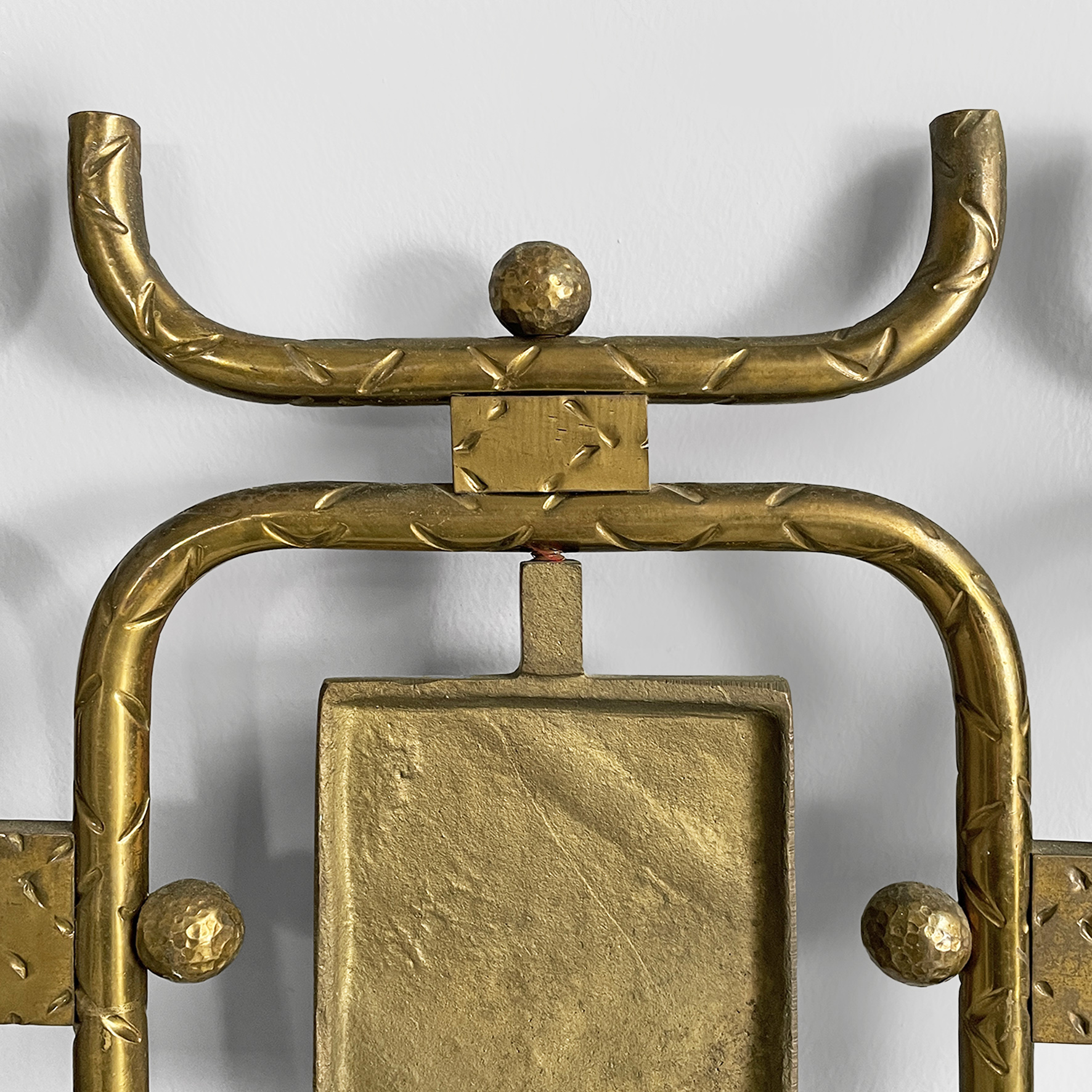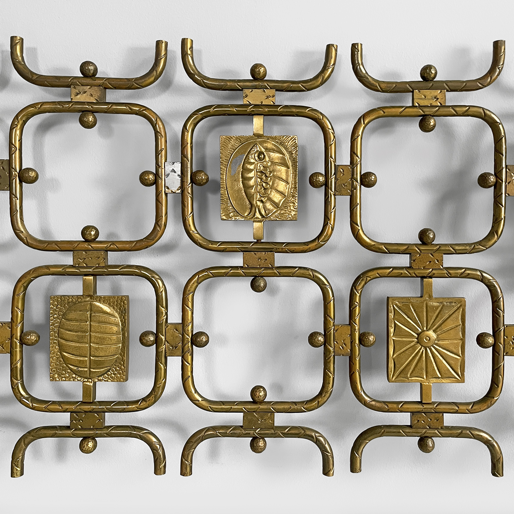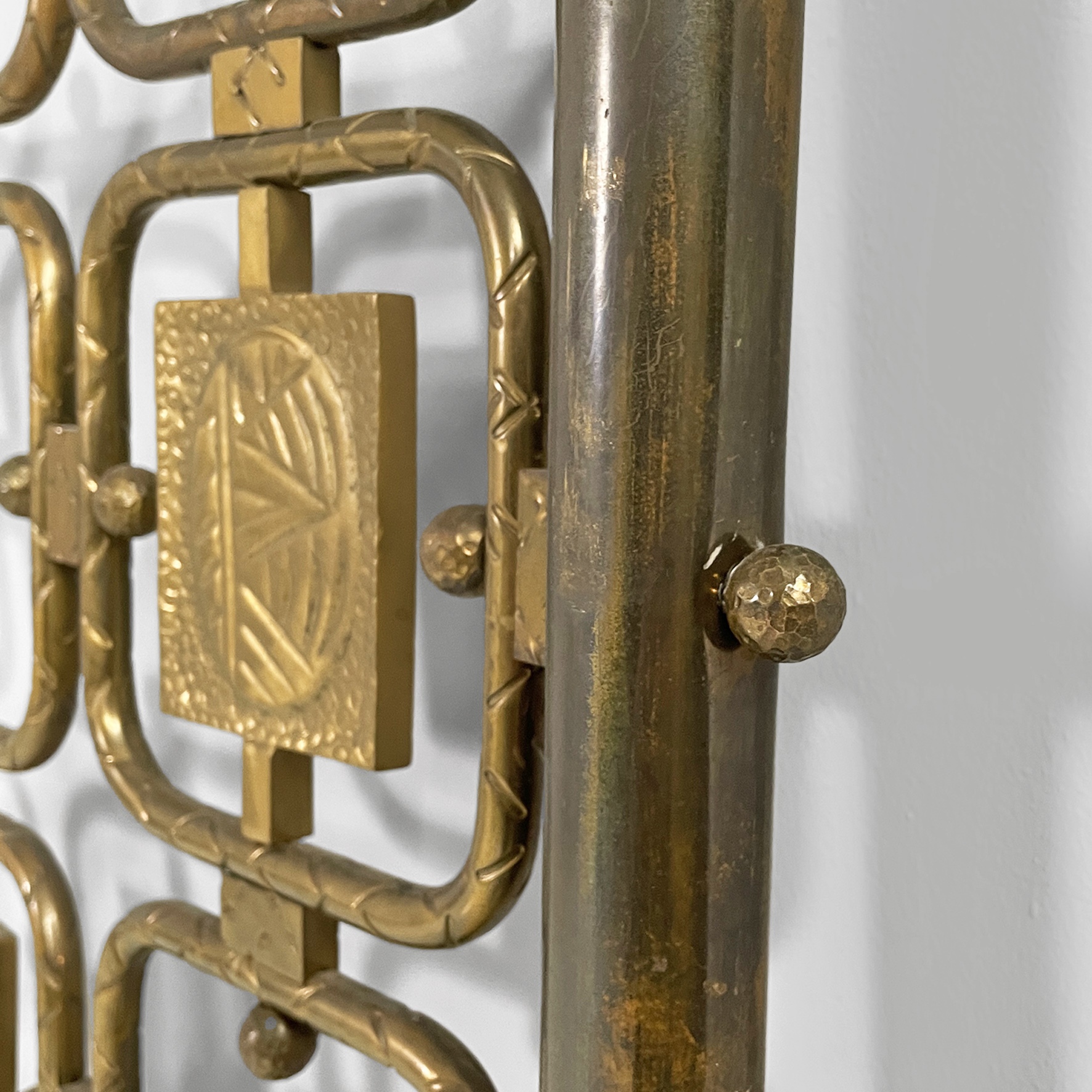 Testata per un letto matrimoniale, con struttura in ottone massiccio martellato, composta da una serie di elementi geometrici ad incastro, sempre in ottone.