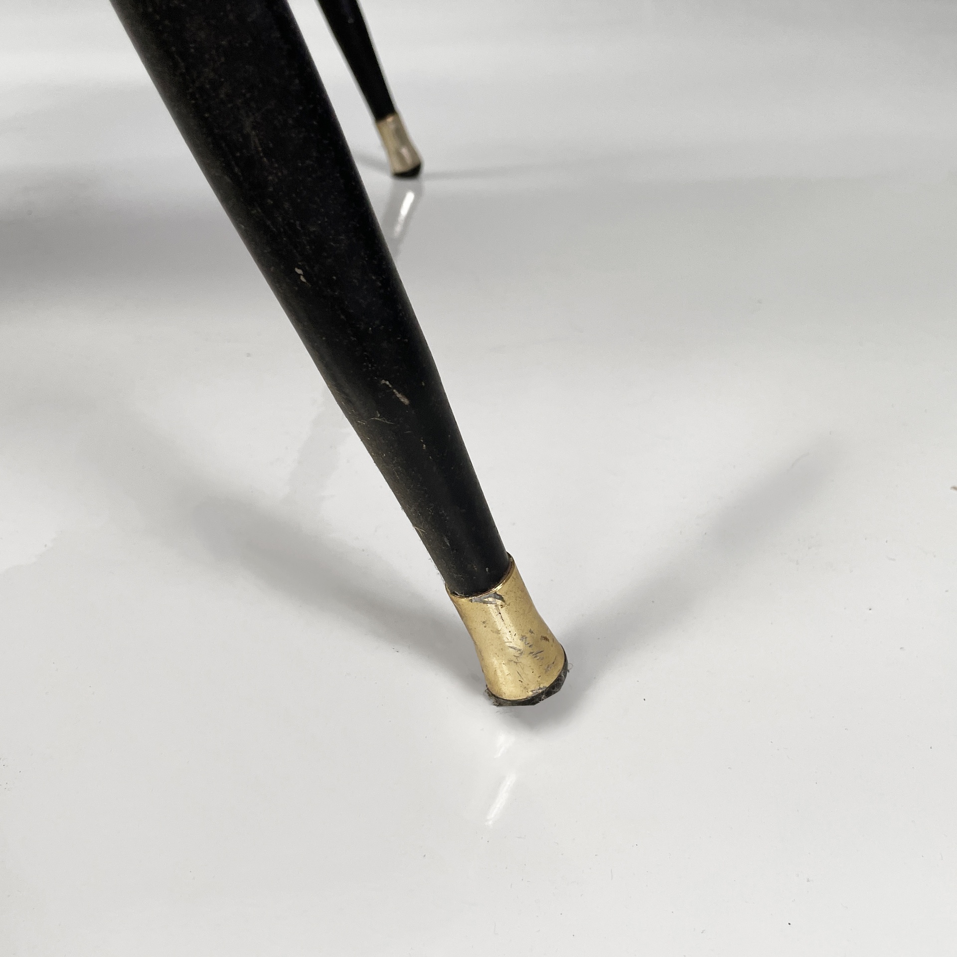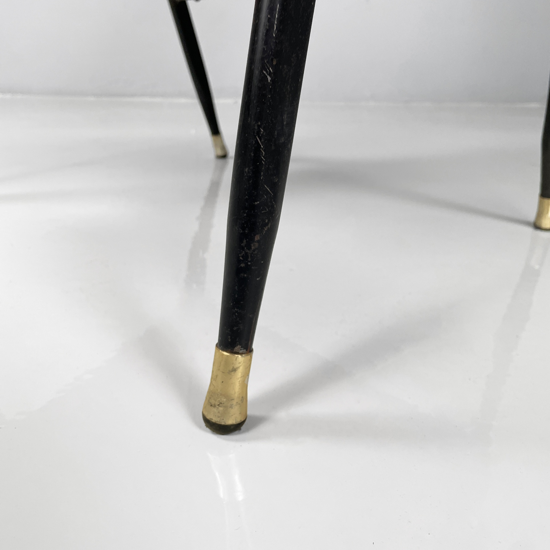 Condizioni discrete. La finta pelle presenta segni sparsi, soprattutto sui braccioli e nella parte superiore dello schienale. Il metallo nero e l’ottone presentano numerosi segni e mancanze di colore.
