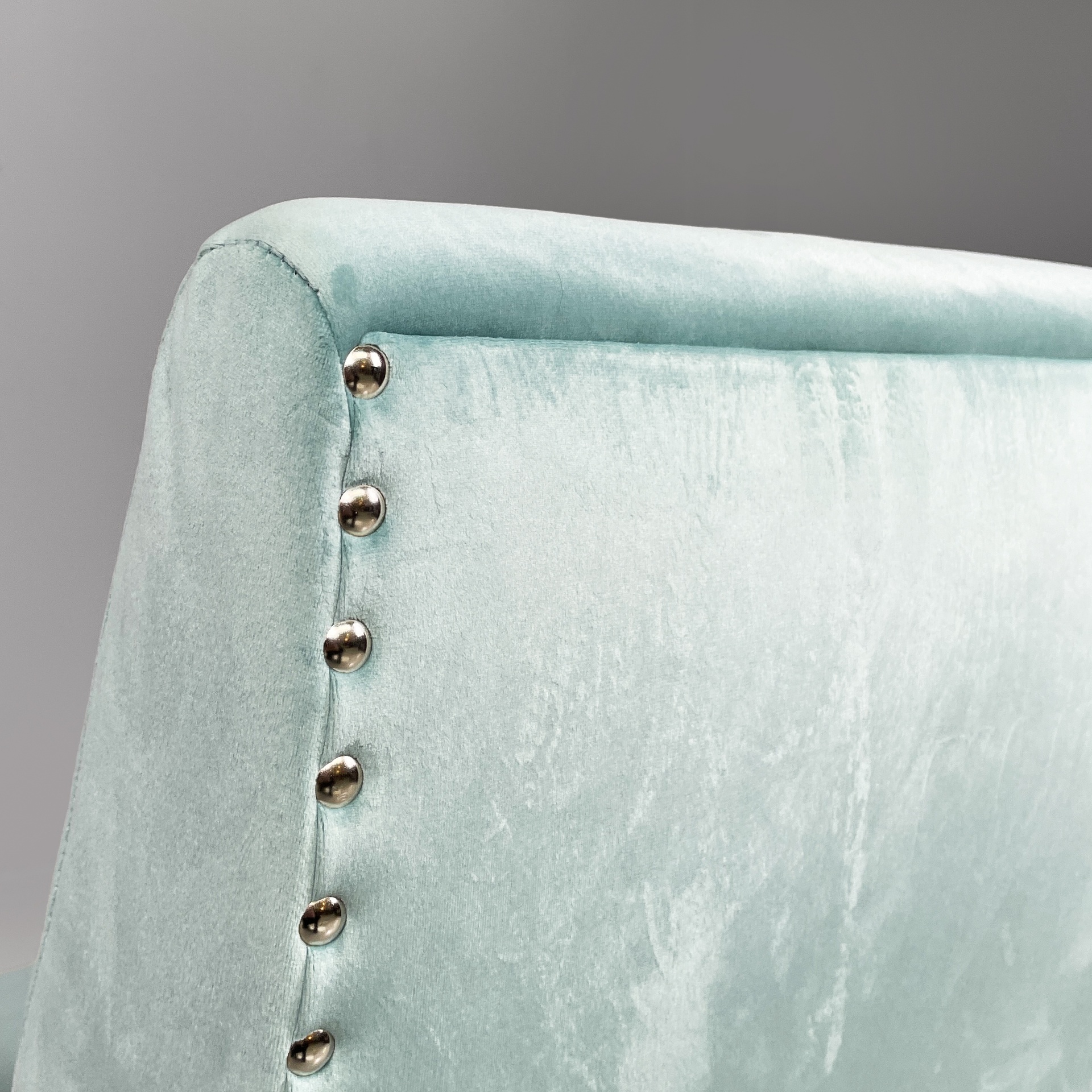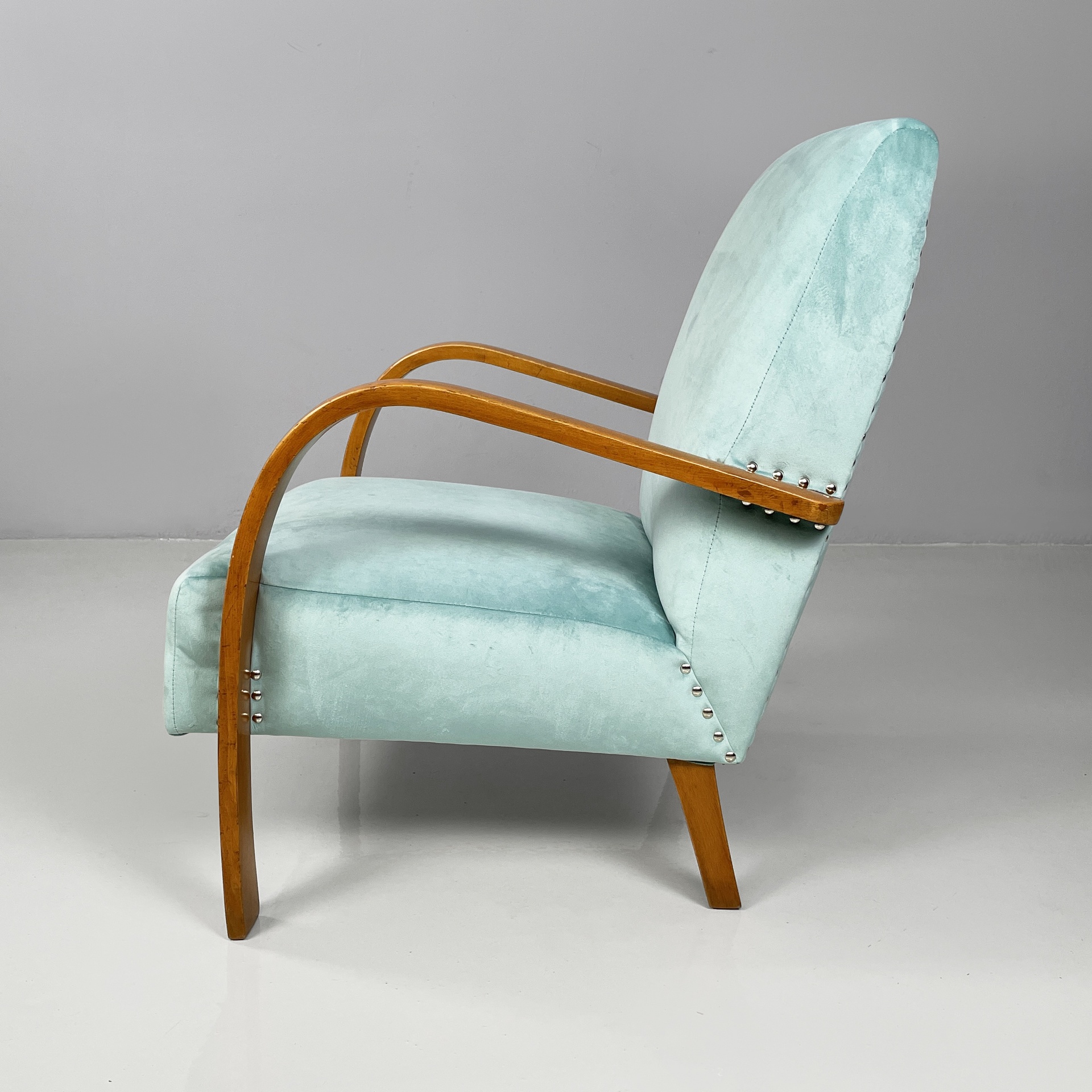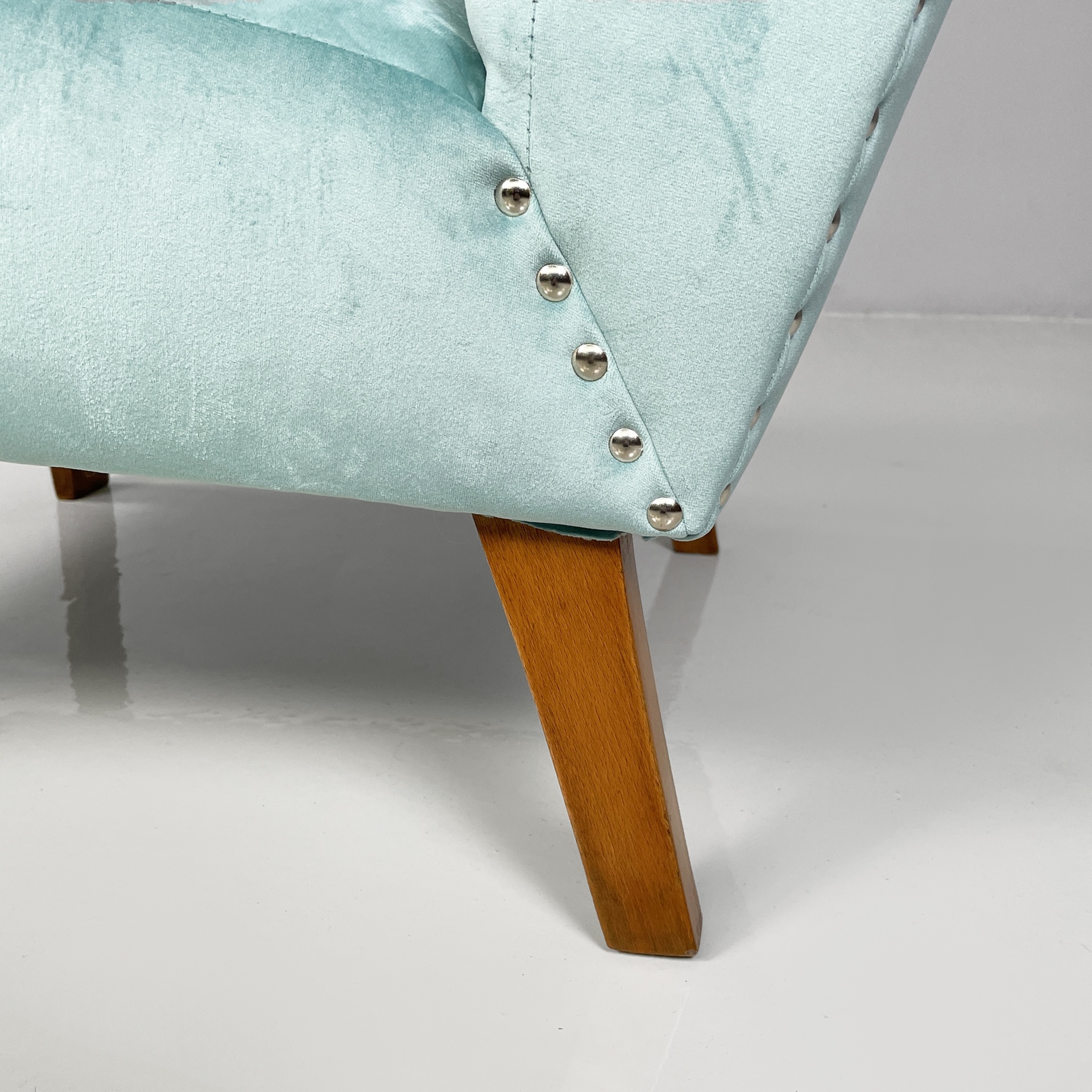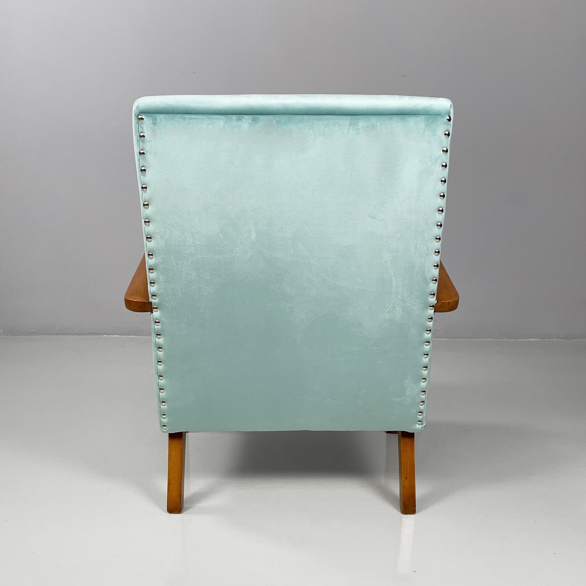 Coppia di poltrone con seduta e schienale squadrati, imbottiti e rivestiti in velluto azzurro brillante con borchie tonde in metallo. I braccioli sono in legno curvato. Zampe a sezione squadrata in legno.