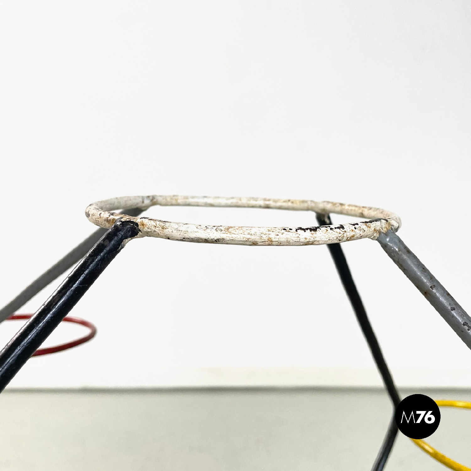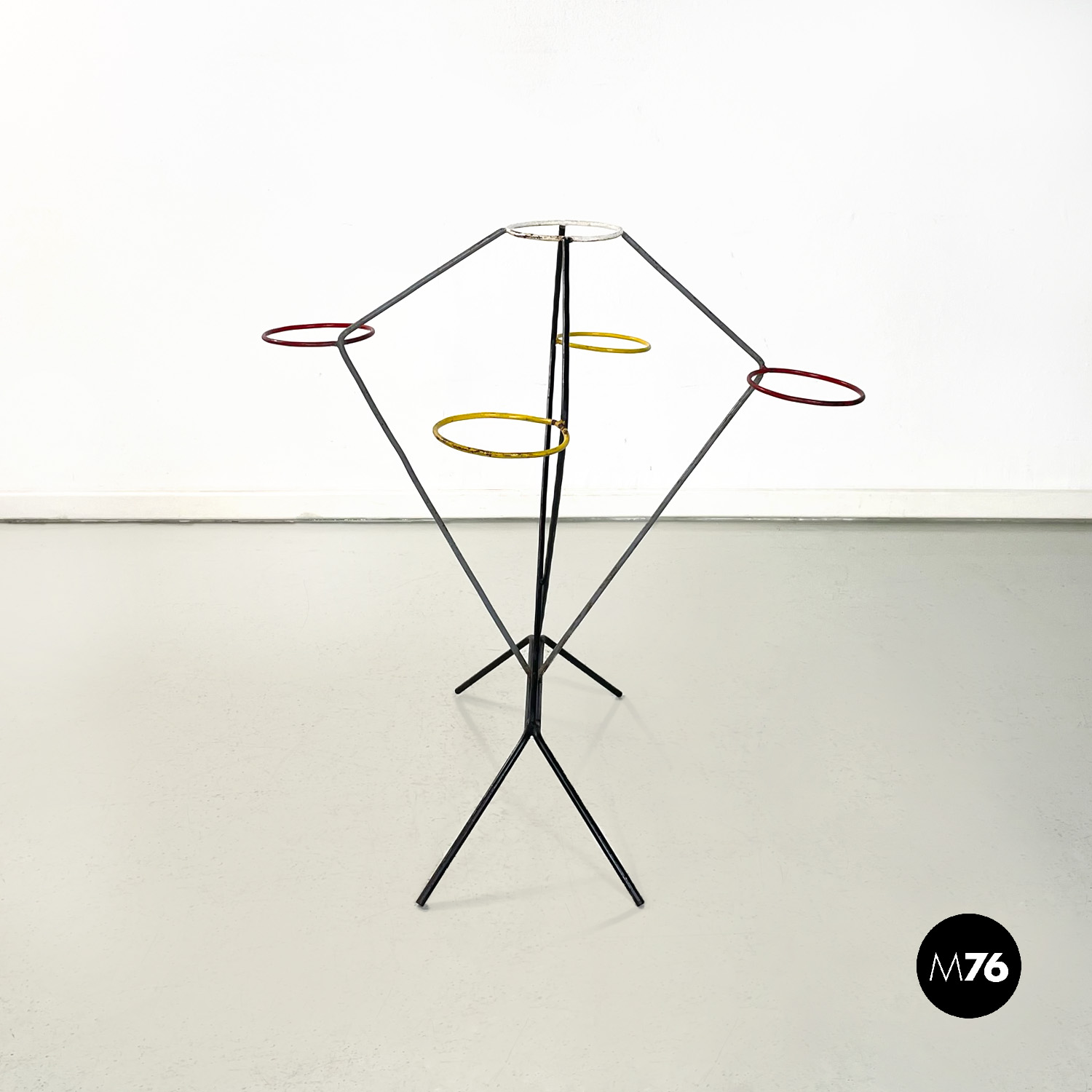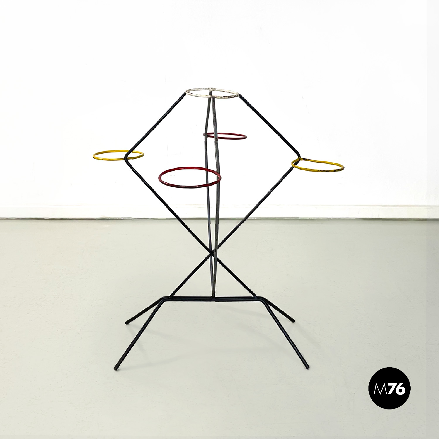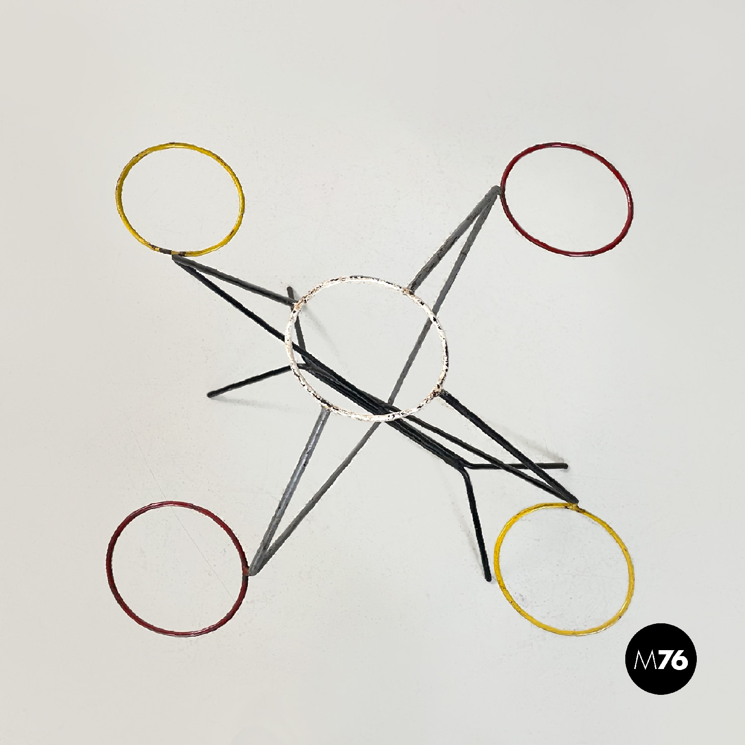 Portafiori da terra a base quadrata in tondino di ferro. La struttura è data da quattro bracci che partono dalla base, sviluppandosi in verticale. I bracci si incrociano a formare un incastro geometrico, vanno a formare un triangolo dove agli estremi si trovano quattro cerchi di 13 cm interni dove è possibile inserire i vasi. I bracci si riuniscono poi nella parte alta nel cerchio più in alto.