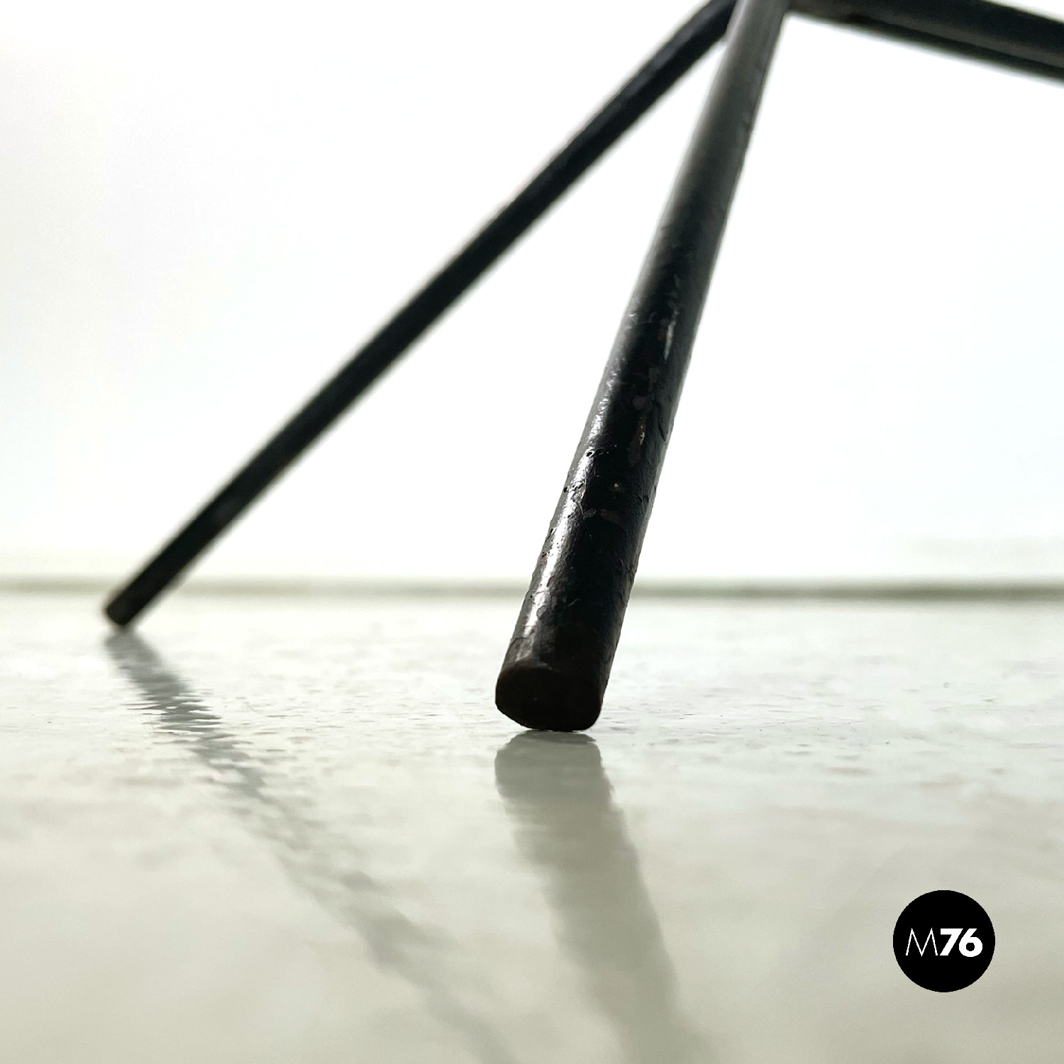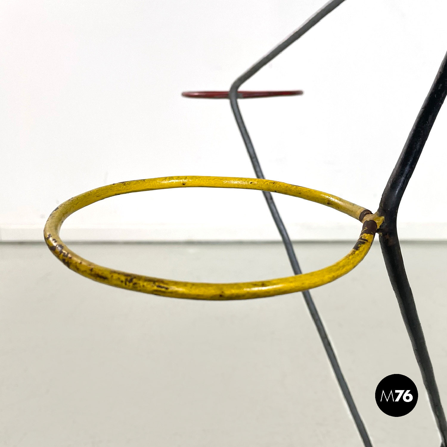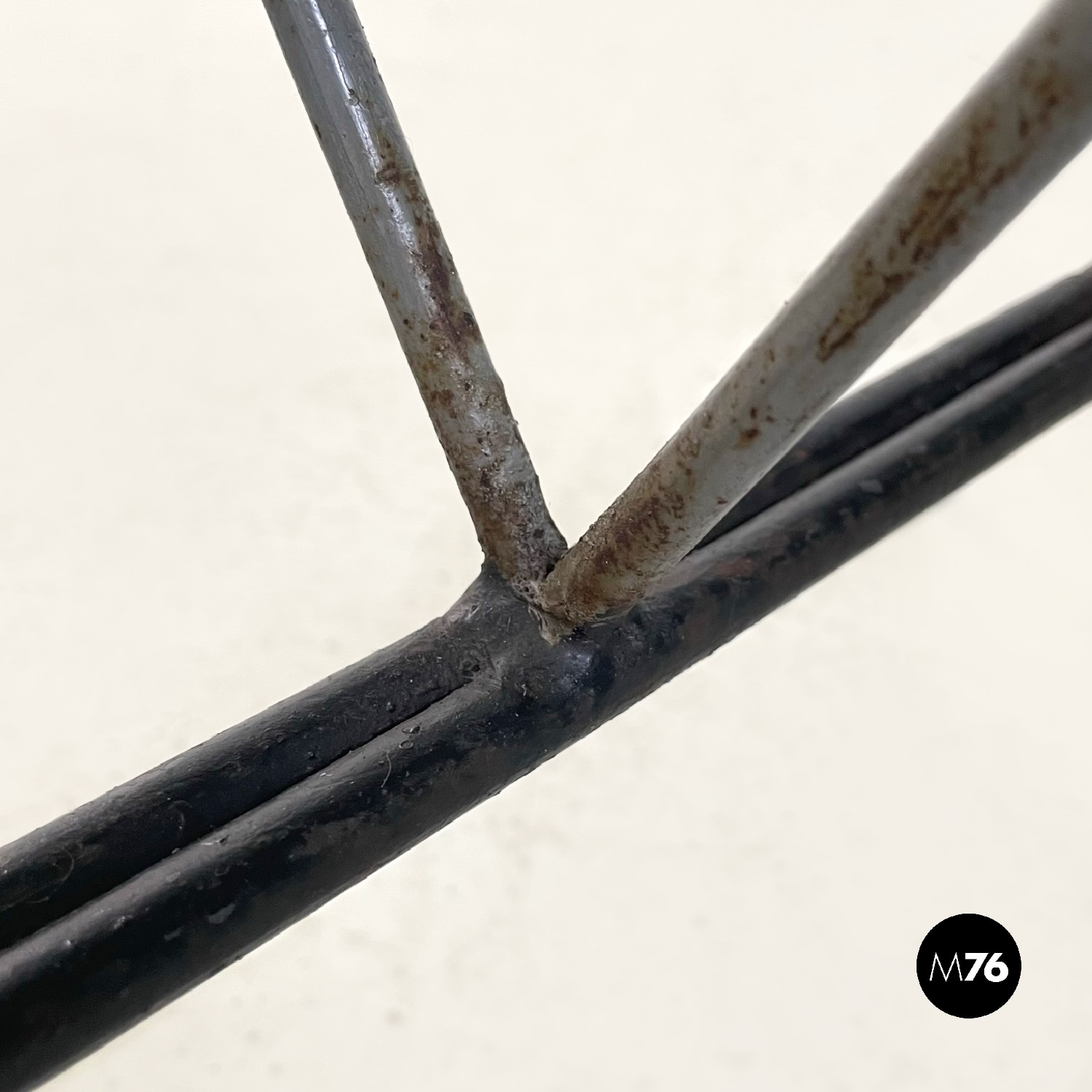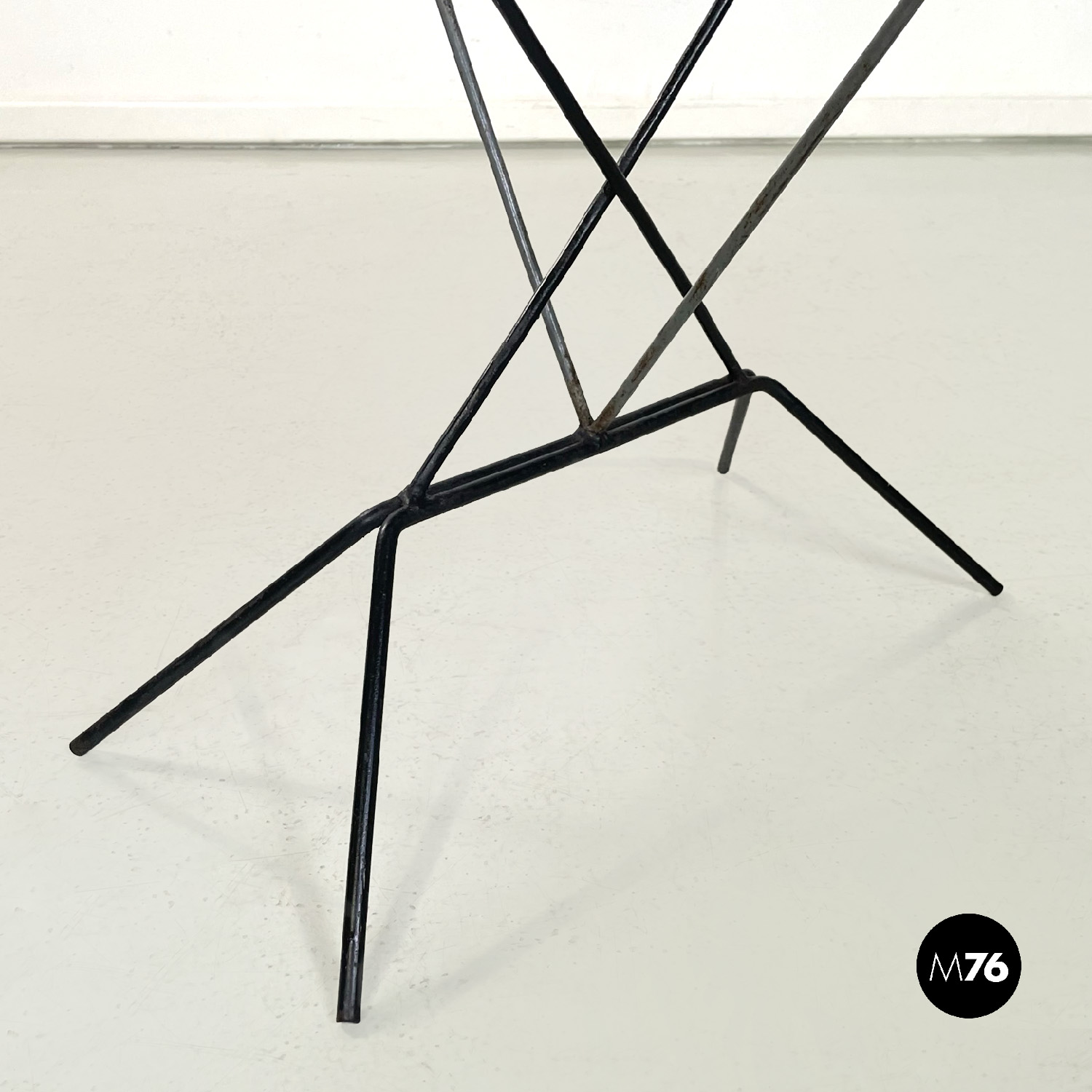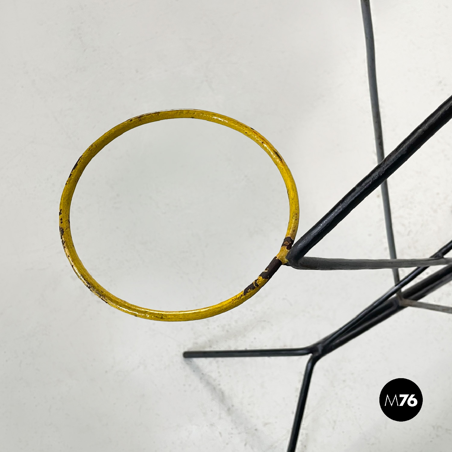 Portafiori da terra a base quadrata in tondino di ferro. La struttura è data da quattro bracci che partono dalla base, sviluppandosi in verticale. I bracci si incrociano a formare un incastro geometrico, vanno a formare un triangolo dove agli estremi si trovano quattro cerchi di 13 cm interni dove è possibile inserire i vasi. I bracci si riuniscono poi nella parte alta nel cerchio più in alto.