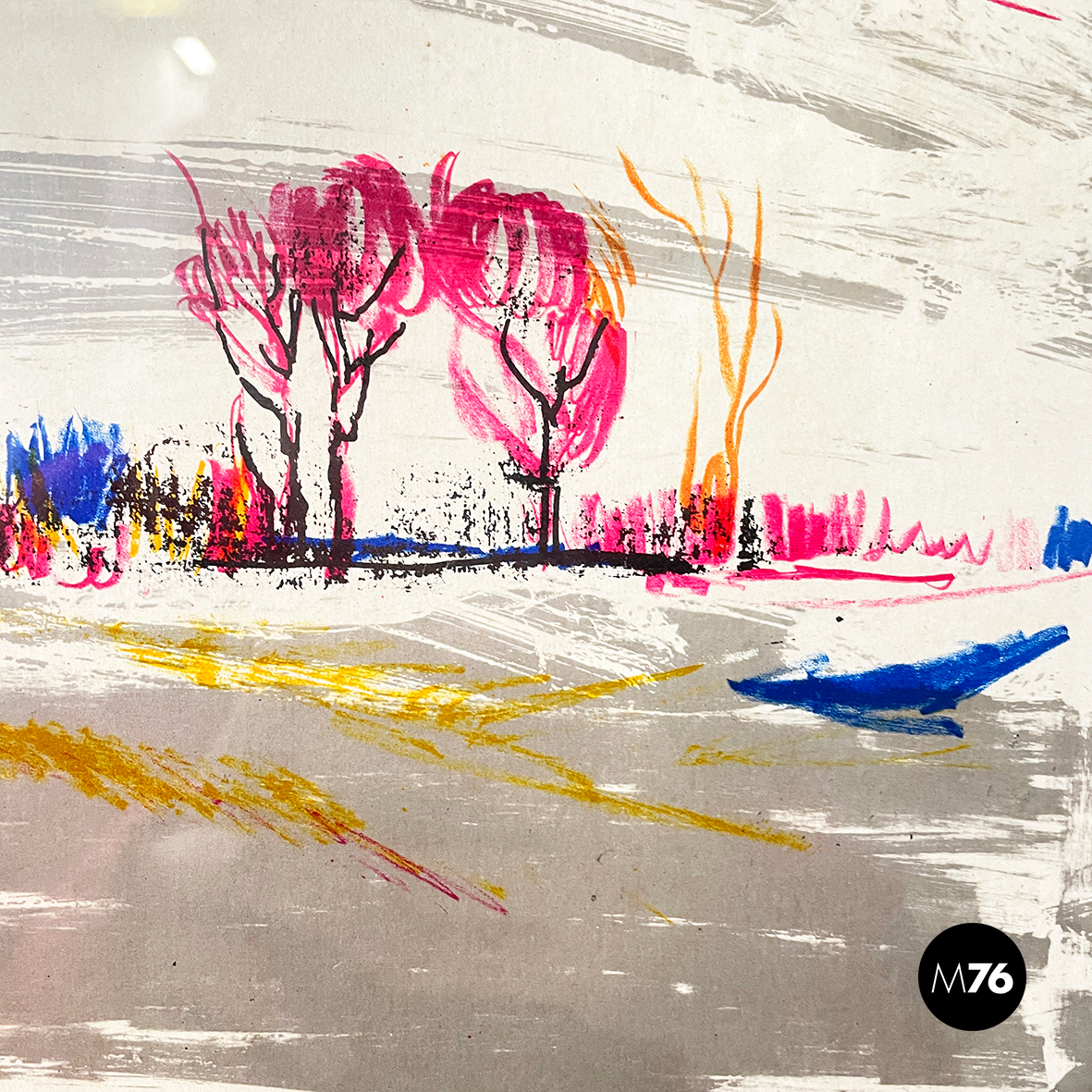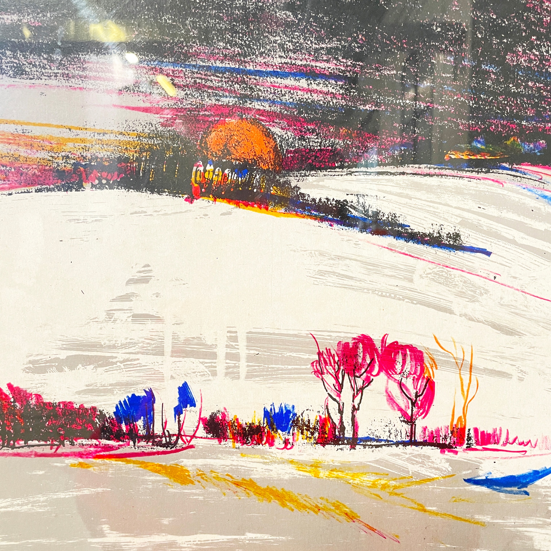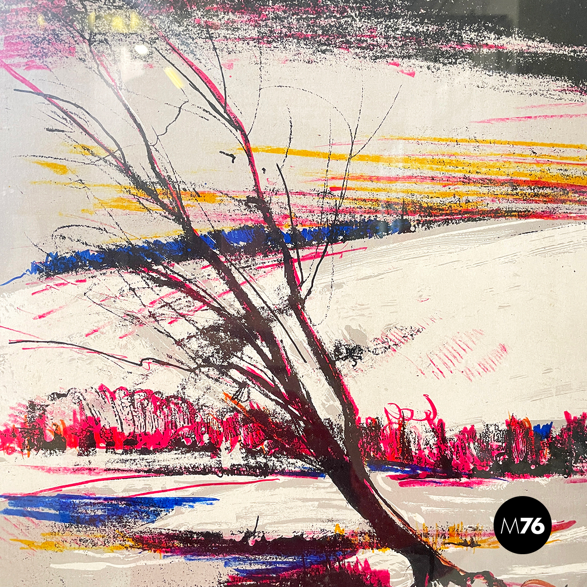 Stampa litografica su carta raffigurante un paesaggio invernale con pochi alberi al tramonto. I colori spaziano tra il giallo, il rosso magenta, il blu, il grigio e il nero. In cornice metallica.
