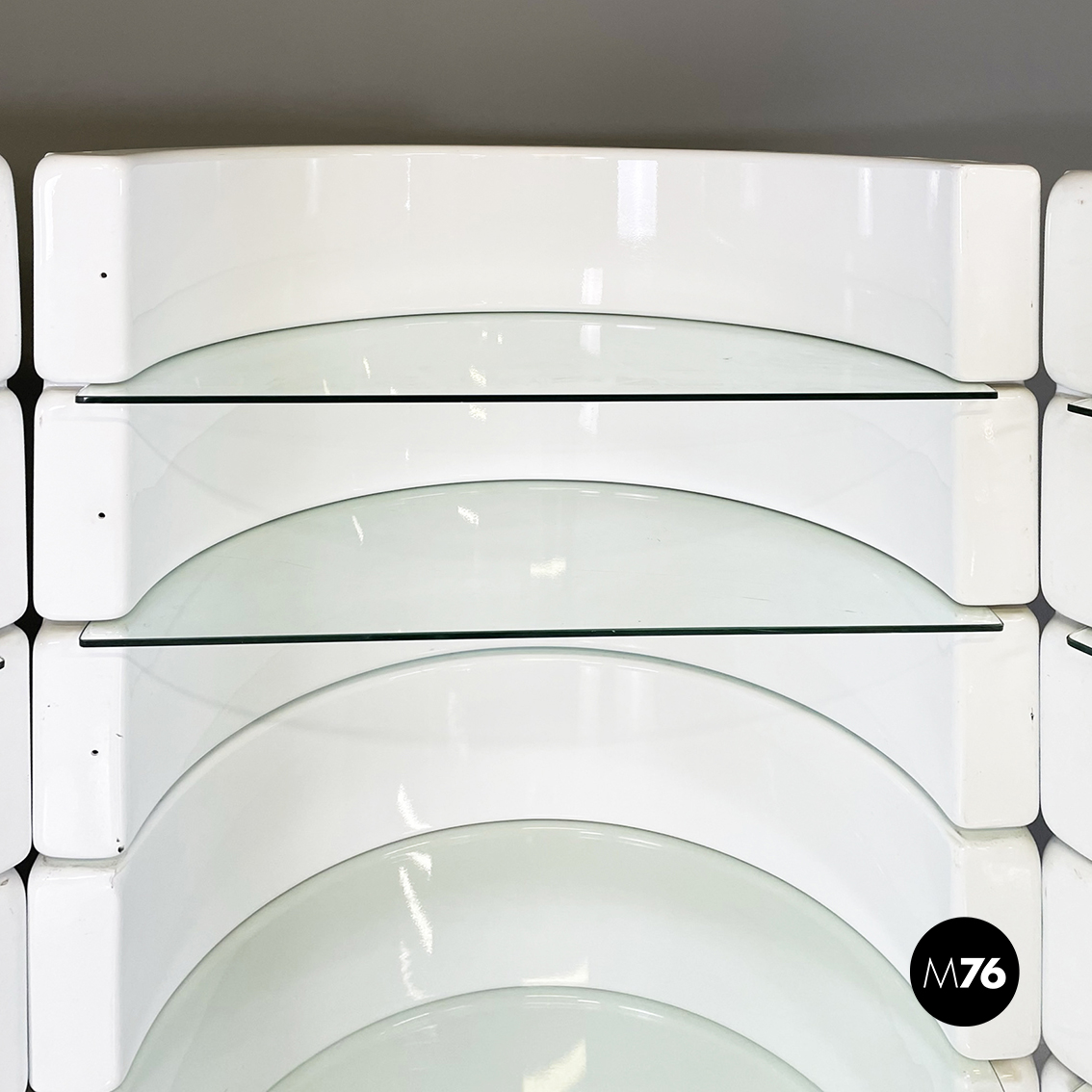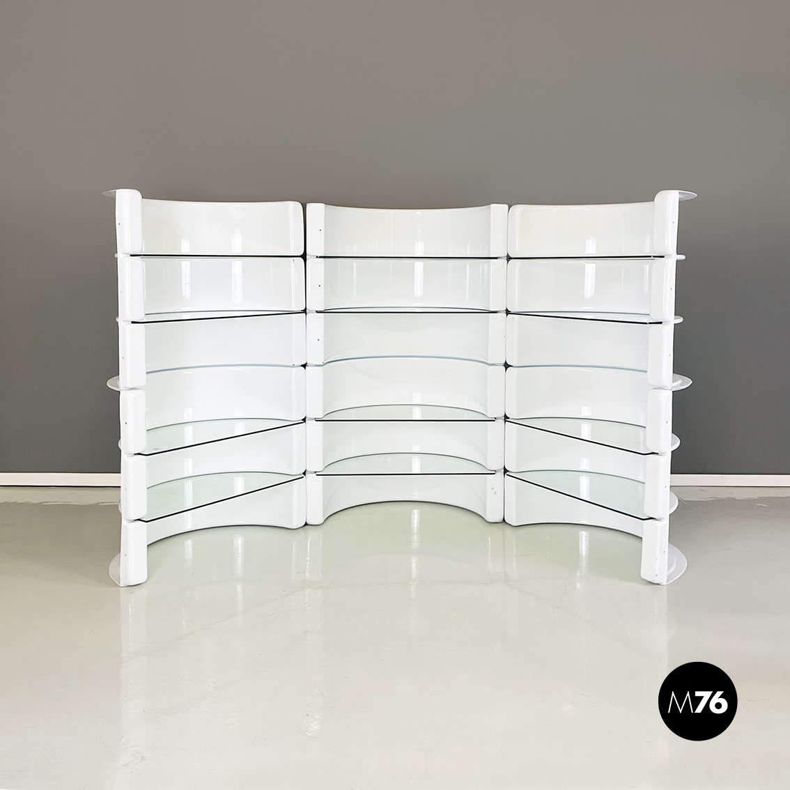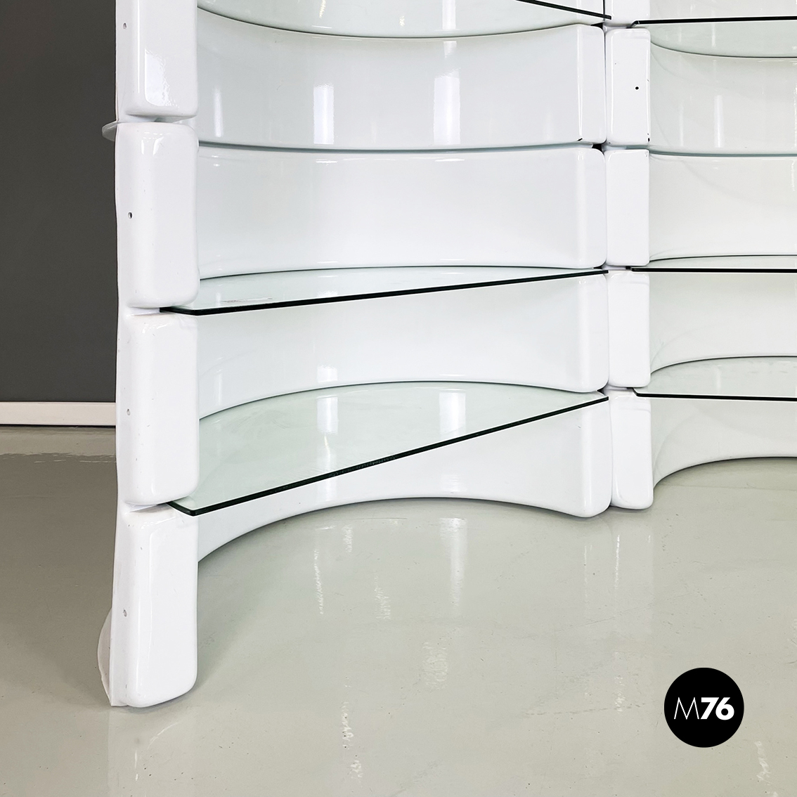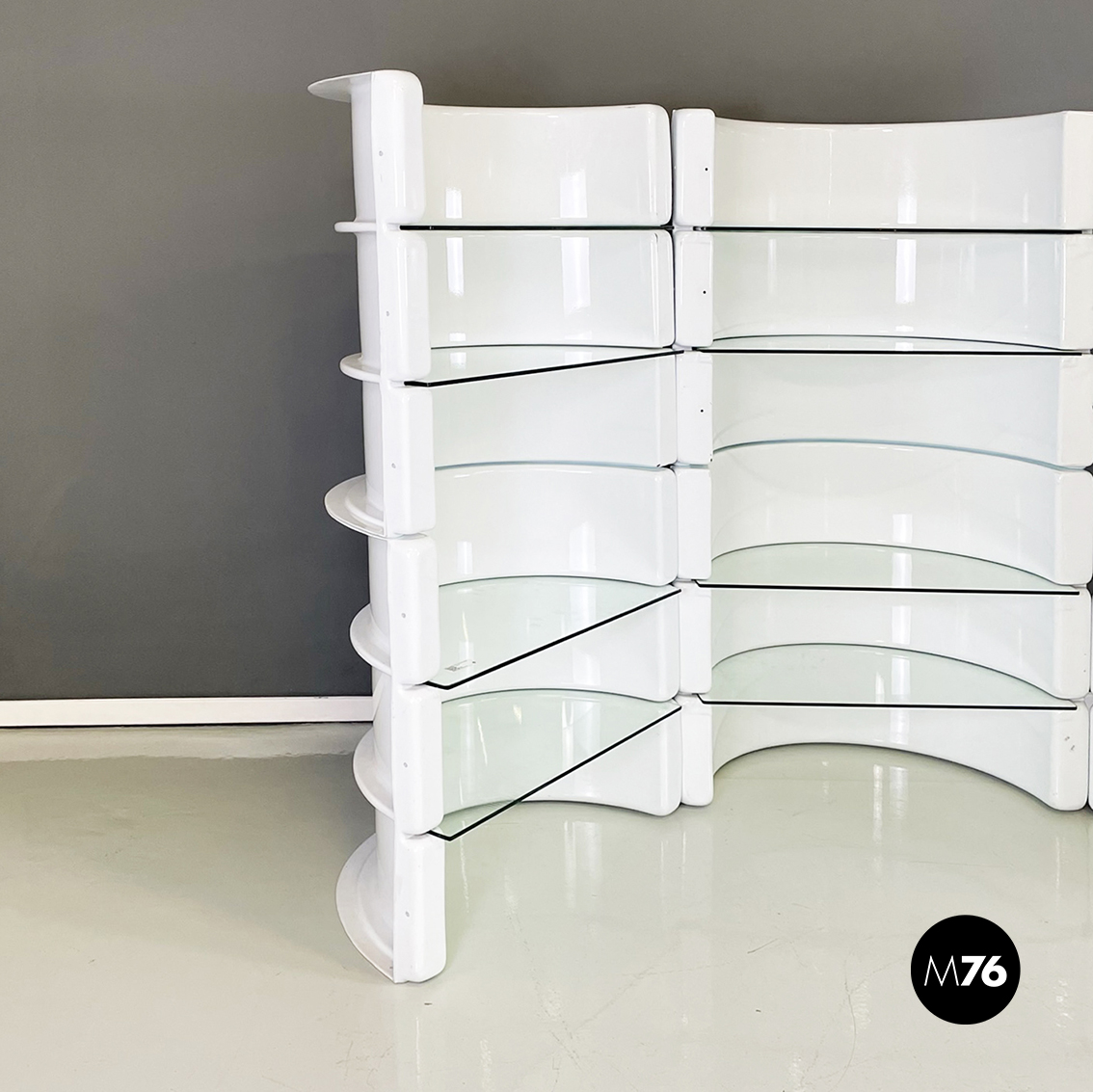 Libreria modulare e componibile con struttura a semi-cilindro in vetroresina bianca. La libreria è composta da sei moduli, posizionabili a piacere. Ogni modulo presenta due scanalature dove è possibile inserire i piani a mezzaluna in vetro color acquamarina.