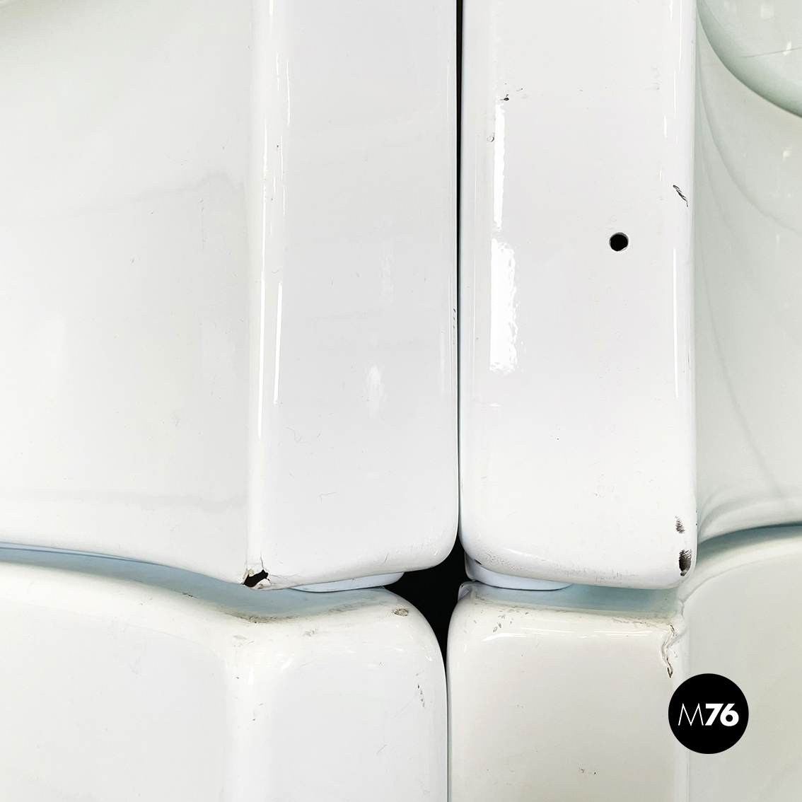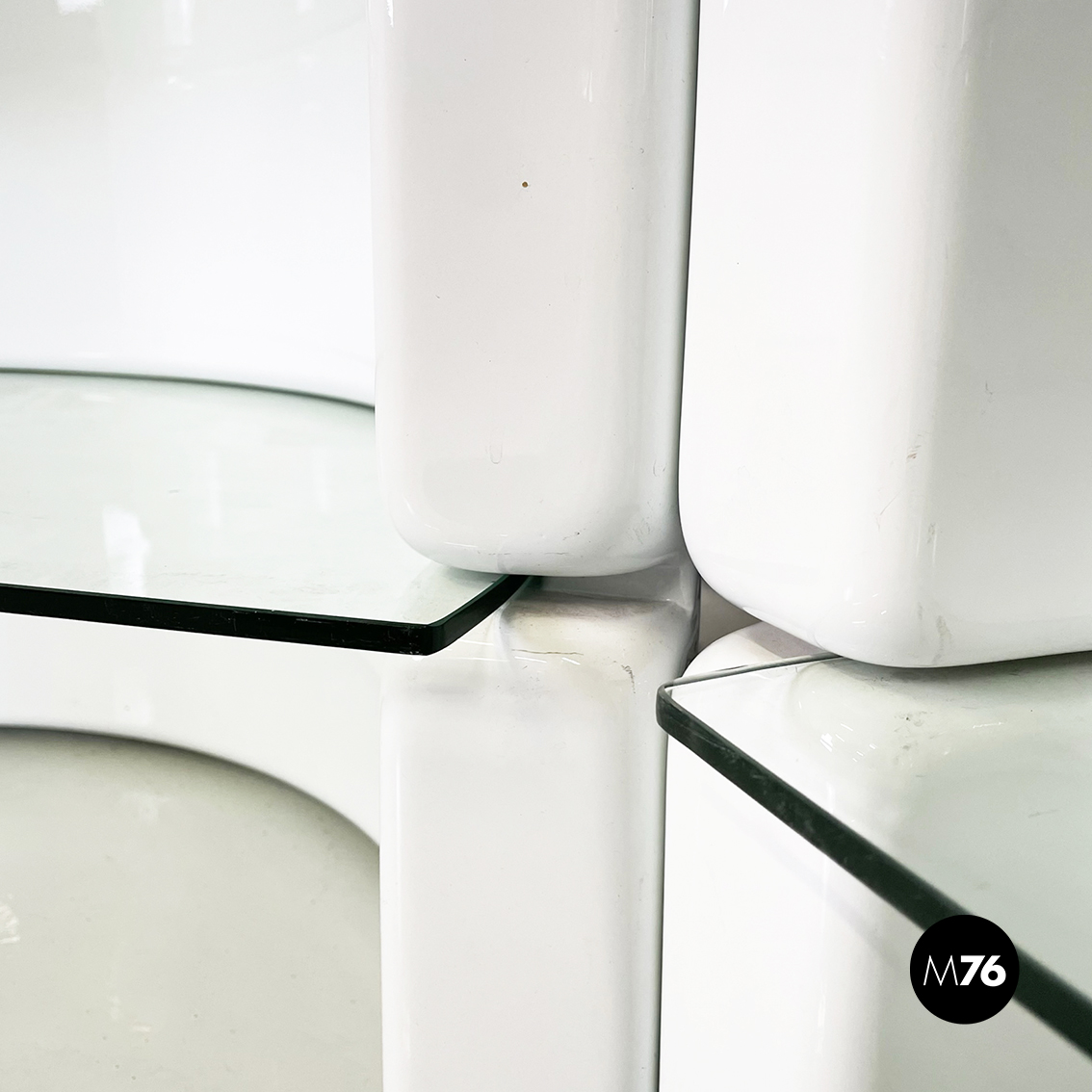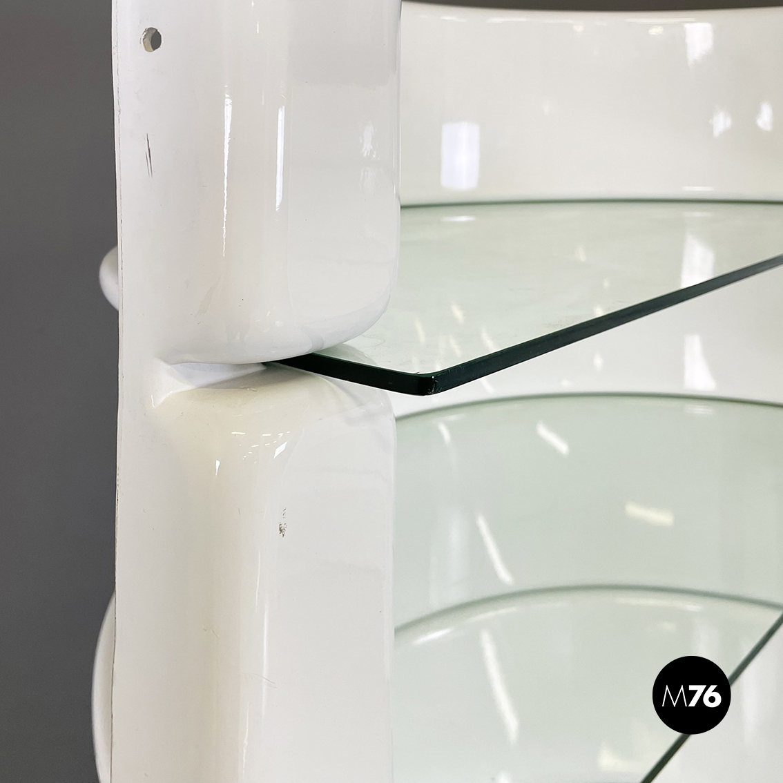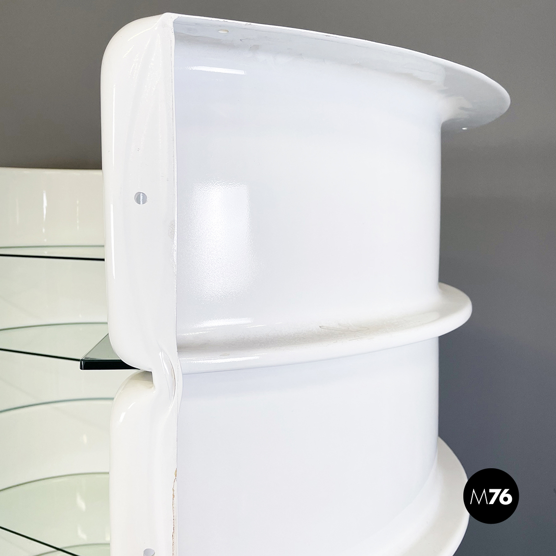 Libreria modulare e componibile con struttura a semi-cilindro in vetroresina bianca. La libreria è composta da sei moduli, posizionabili a piacere. Ogni modulo presenta due scanalature dove è possibile inserire i piani a mezzaluna in vetro color acquamarina.