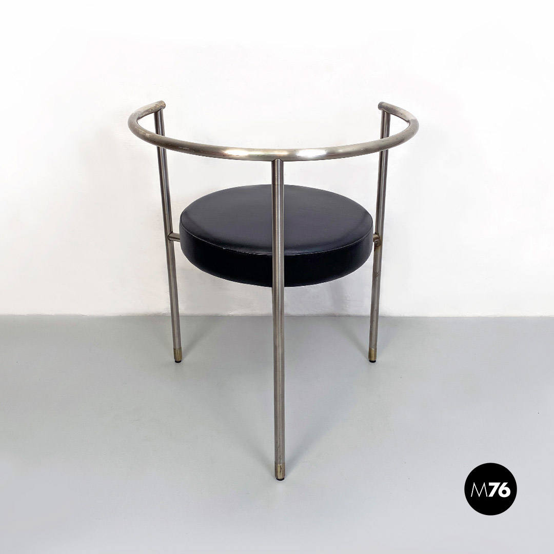 Sedia o poltrona di piccole dimensioni con seduta tonda in sky nero e schienale in tondino di acciaio satinato con forma a pozzetto, a tre zampe.