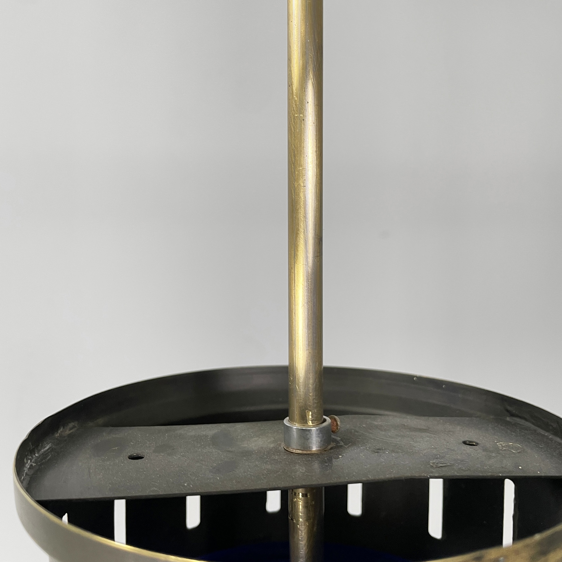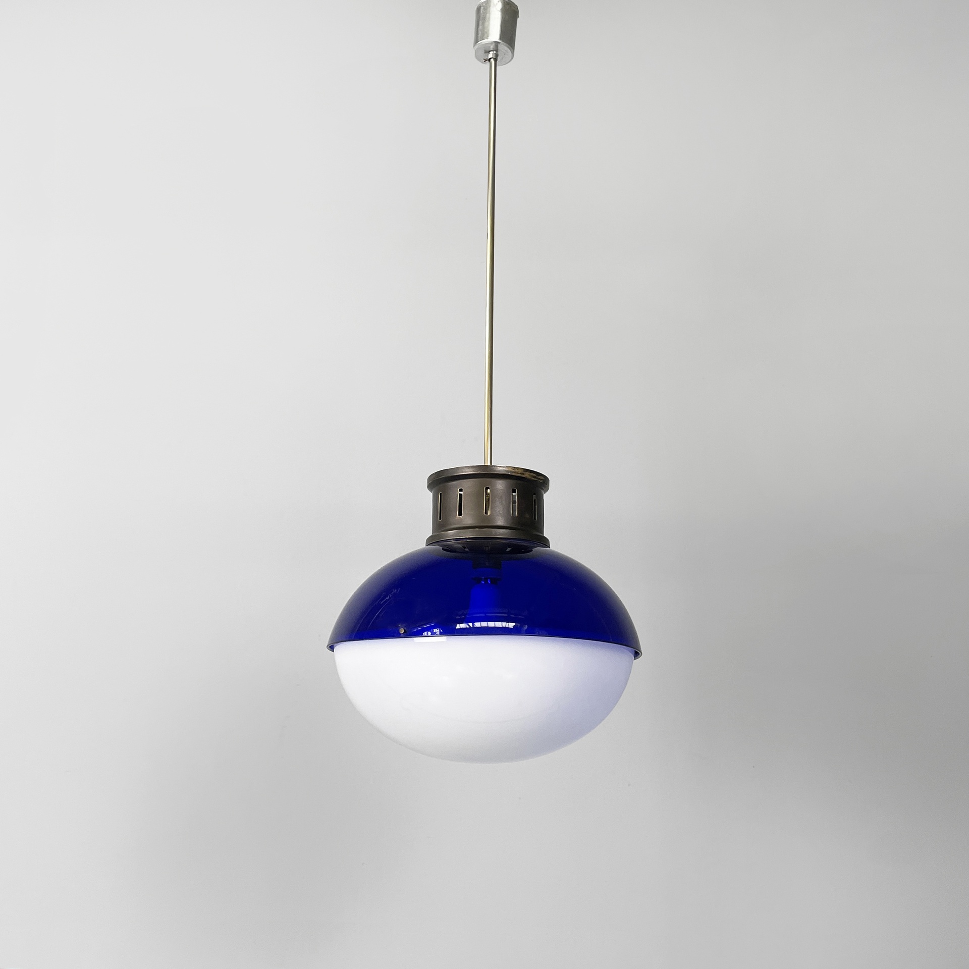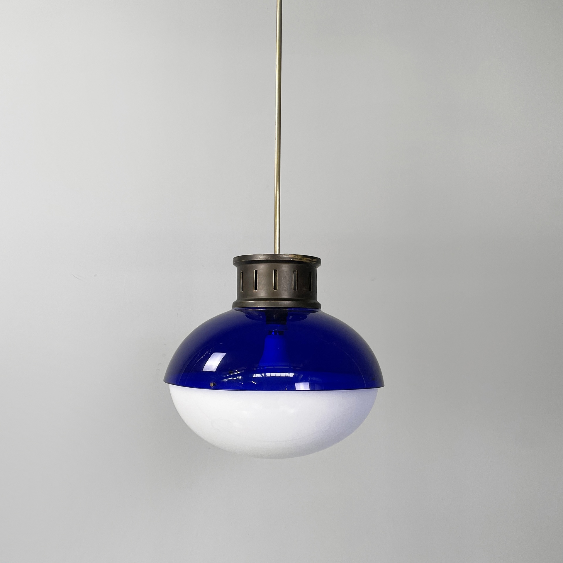 Lampadario con diffusore tondo, composto da due parti a semisfera in plexiglass blu e in plexiglass bianco. Le due parti sono unite da viti in ottone. Nella parte superiore al diffusore è presente l’attacco cilindrico alla struttura in tondino, entrambi in ottone brunito. Attacco al soffitto in plastica con finitura argentata. Appartenente al periodo Space Age.