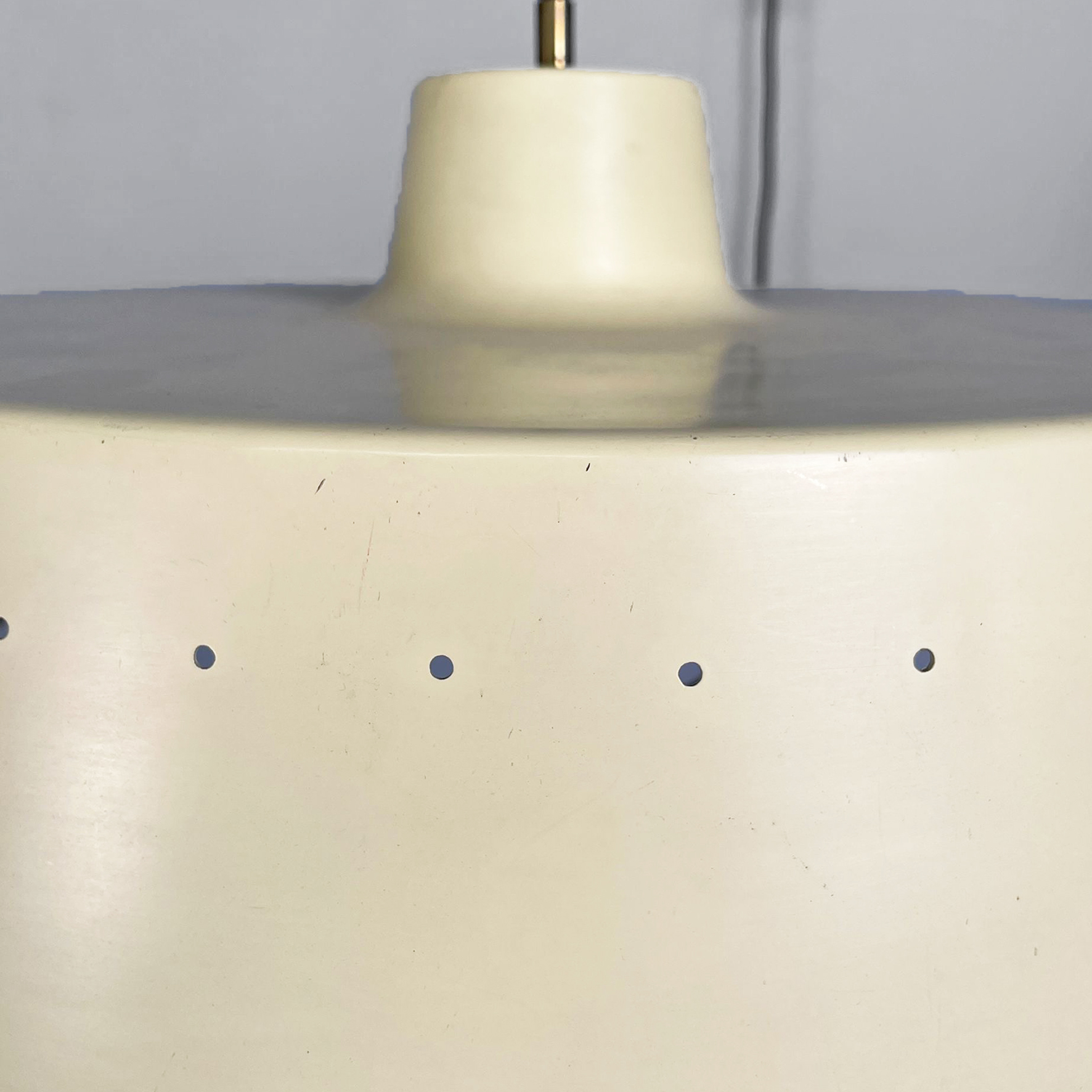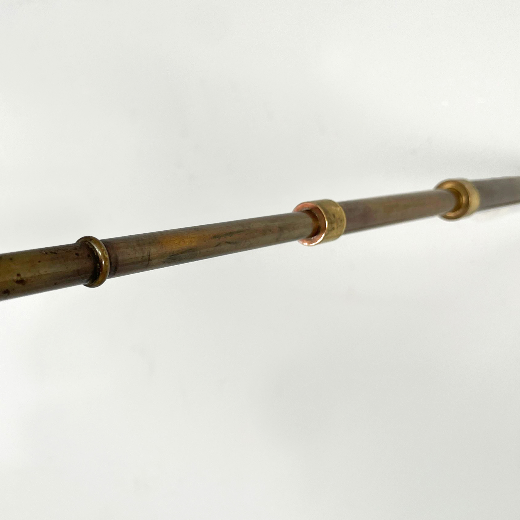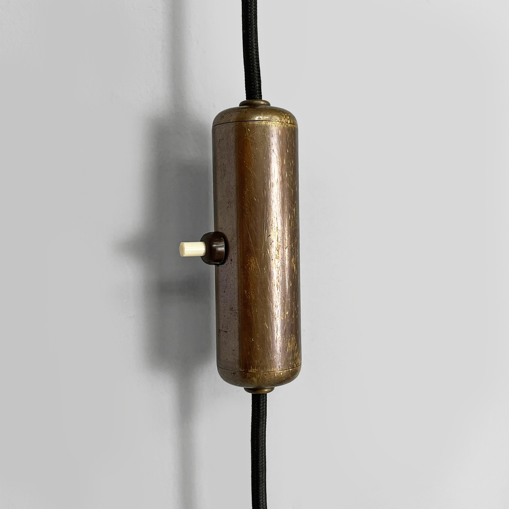 Lampada da parete a braccio orientabile, con meccanismo telescopico e saliscendi. Struttura in ottone con braccio allungabile a sezione tonda, composta da tre parti. Paralume in metallo di colore bianco internamente e giallo chiaro all’esterno, con fori lungo il perimetro che lasciano filtrare la luce, diffusa principalmente nella parte bassa e centrale del diffusore tramite un attacco E27. La struttura è provvista di un meccanismo saliscendi che permette di posizionare il diffusore più o meno alto, tramite un contrappeso in ottone su cui è posto l’interruttore e tramite lo scorrimento dello stesso cavo elettrico all’interno del braccio della lampada.