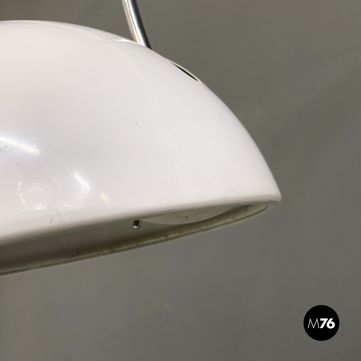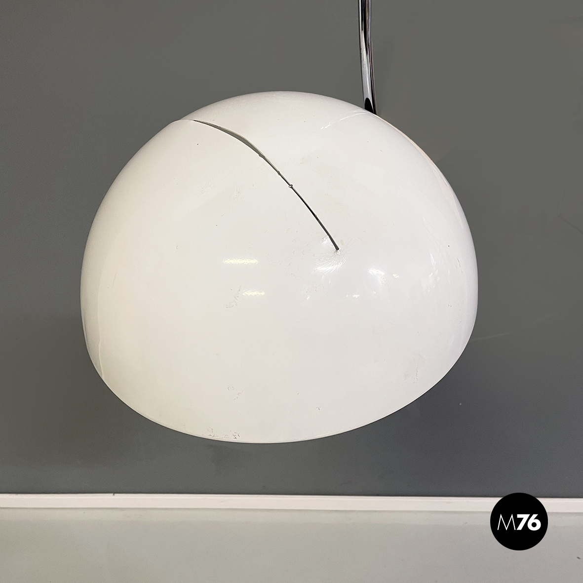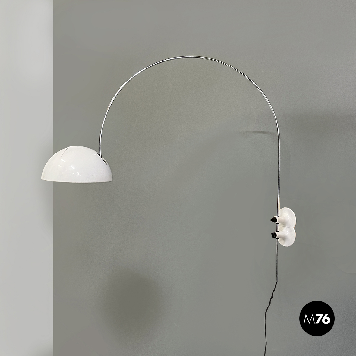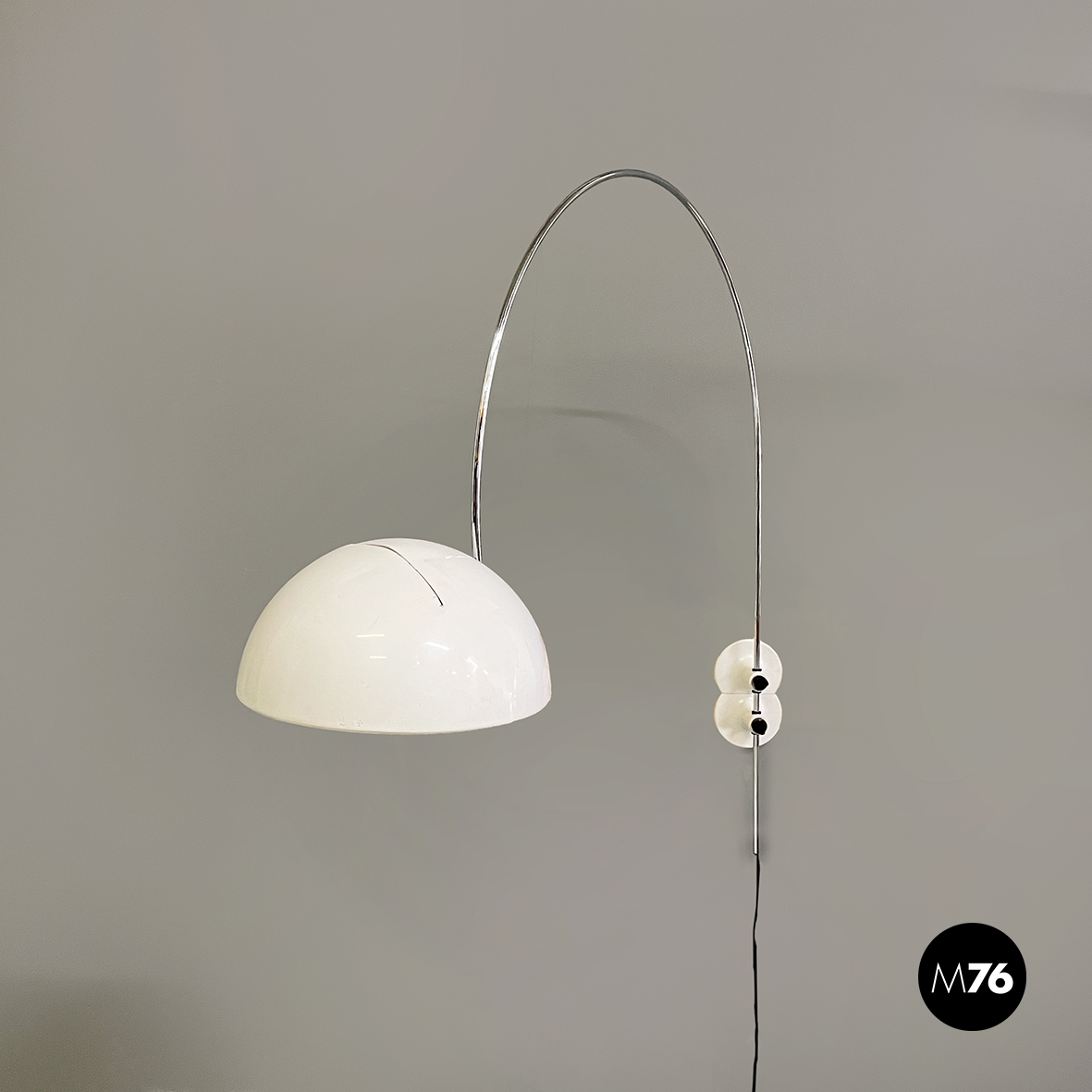 Lampada da parete modello Coupé 1159 con paralume orientabile a cupola in metallo laccato bianco. All’interno del paralume è presente l’interruttore di accensione. La struttura ad arco orientabile è in acciaio cromato, mentre la base a forma di otto è in metallo laccato bianco. Alla base sono presenti due blocchi tondi in plastica nera che, se sbloccati, permetto alla struttura di scorrere.