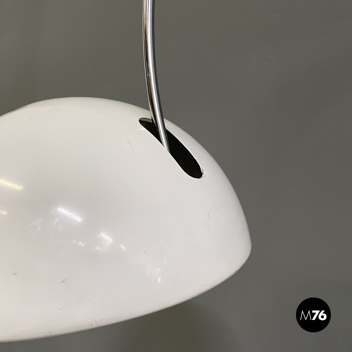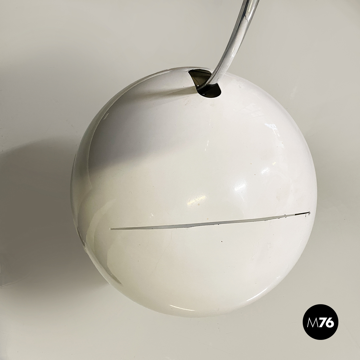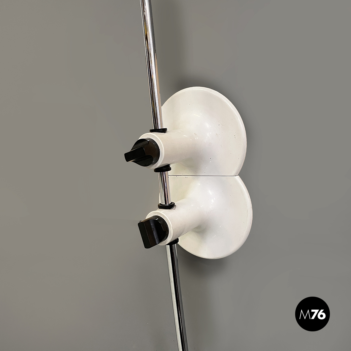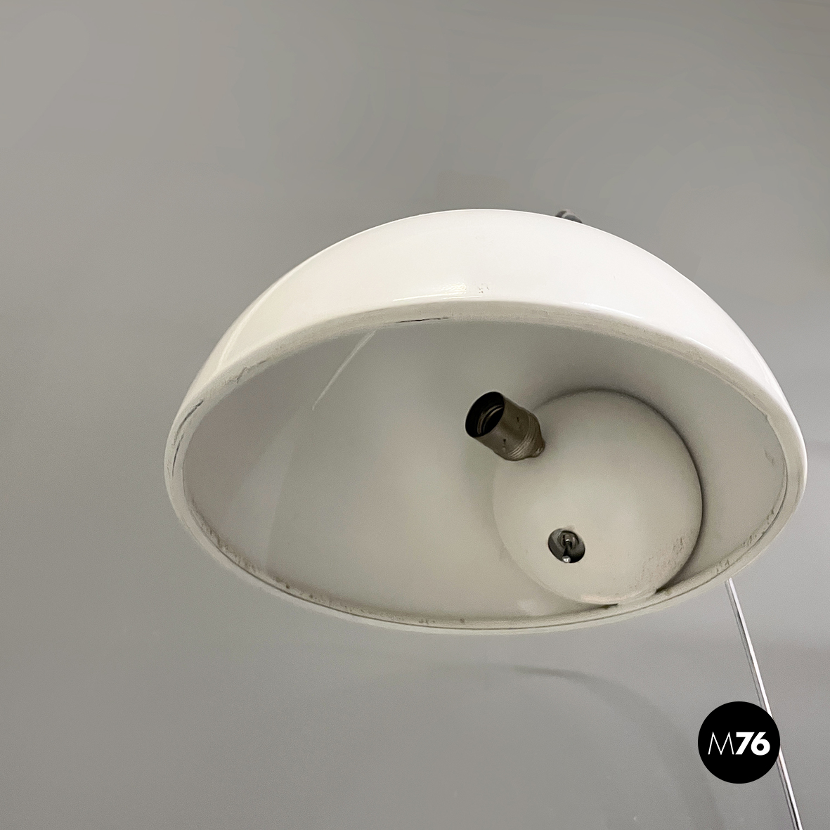 Lampada da parete modello Coupé 1159 con paralume orientabile a cupola in metallo laccato bianco. All’interno del paralume è presente l’interruttore di accensione. La struttura ad arco orientabile è in acciaio cromato, mentre la base a forma di otto è in metallo laccato bianco. Alla base sono presenti due blocchi tondi in plastica nera che, se sbloccati, permetto alla struttura di scorrere.