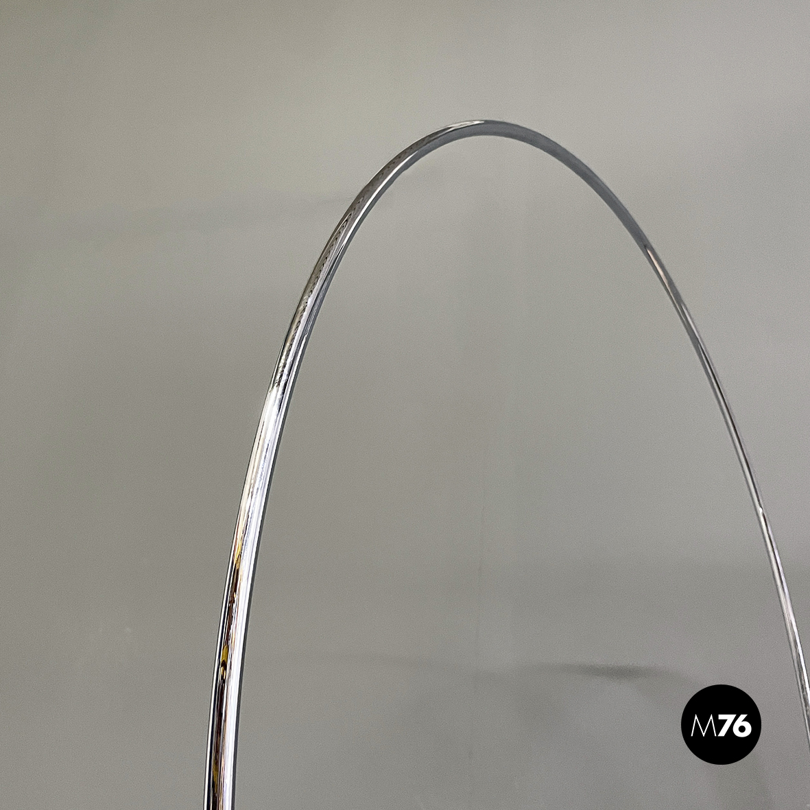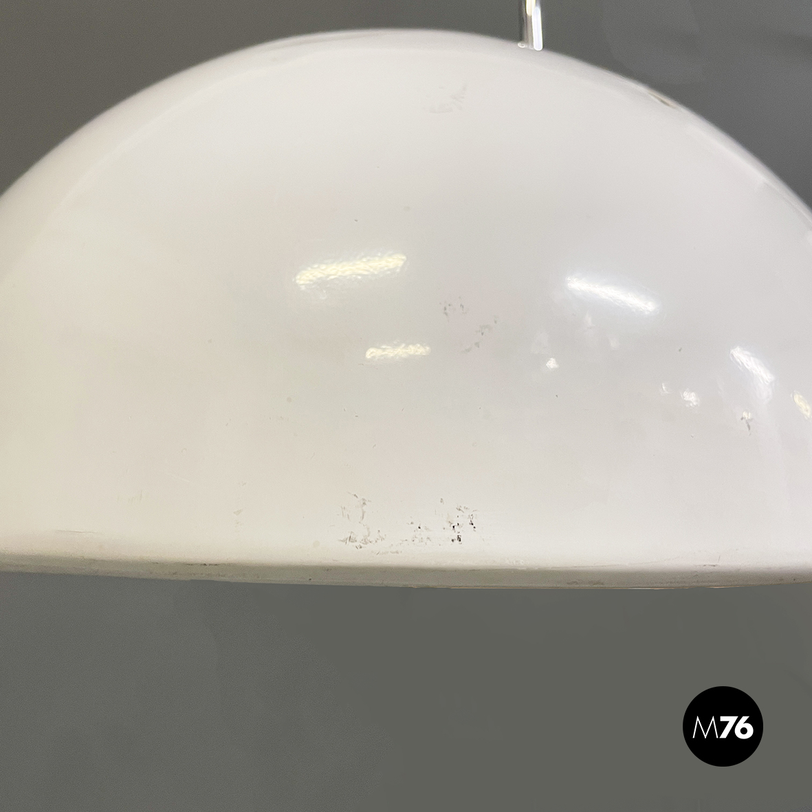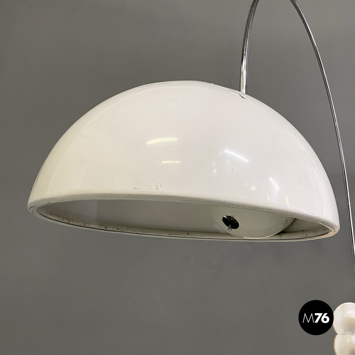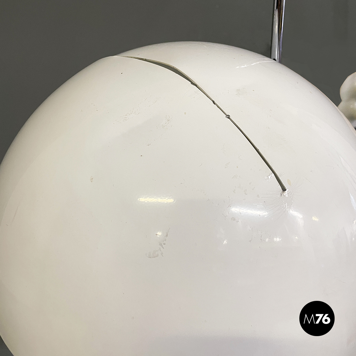 Lampada da parete modello Coupé 1159 con paralume orientabile a cupola in metallo laccato bianco. All’interno del paralume è presente l’interruttore di accensione. La struttura ad arco orientabile è in acciaio cromato, mentre la base a forma di otto è in metallo laccato bianco. Alla base sono presenti due blocchi tondi in plastica nera che, se sbloccati, permetto alla struttura di scorrere.