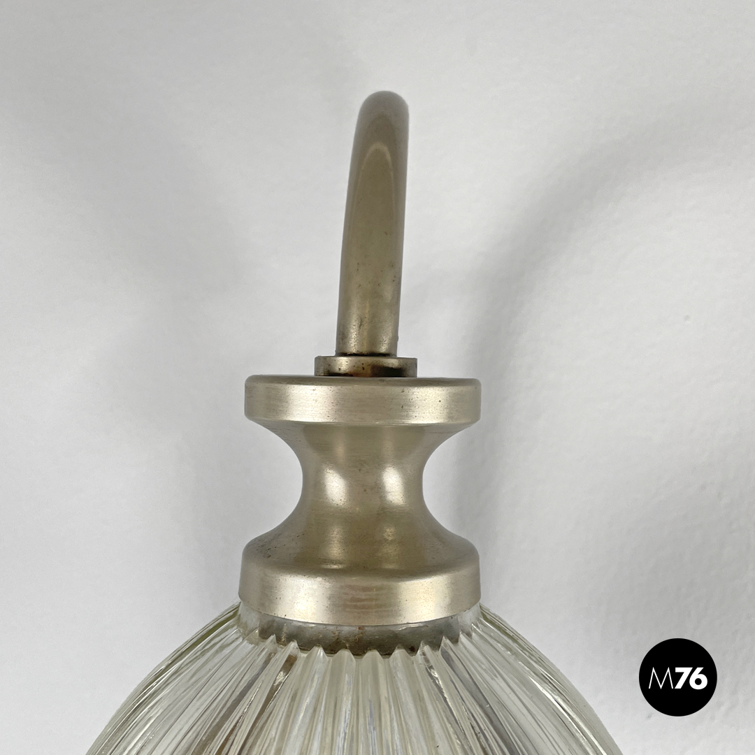 Lampada da parete o applique in metallo. Lo stelo regolabile allungato è in tubolare di metallo, nella parte alta curva verso il basso dove si trova il punto luce, con paralume in vetro stampato trasparente. L’attacco alla parete è rettangolare verticale.