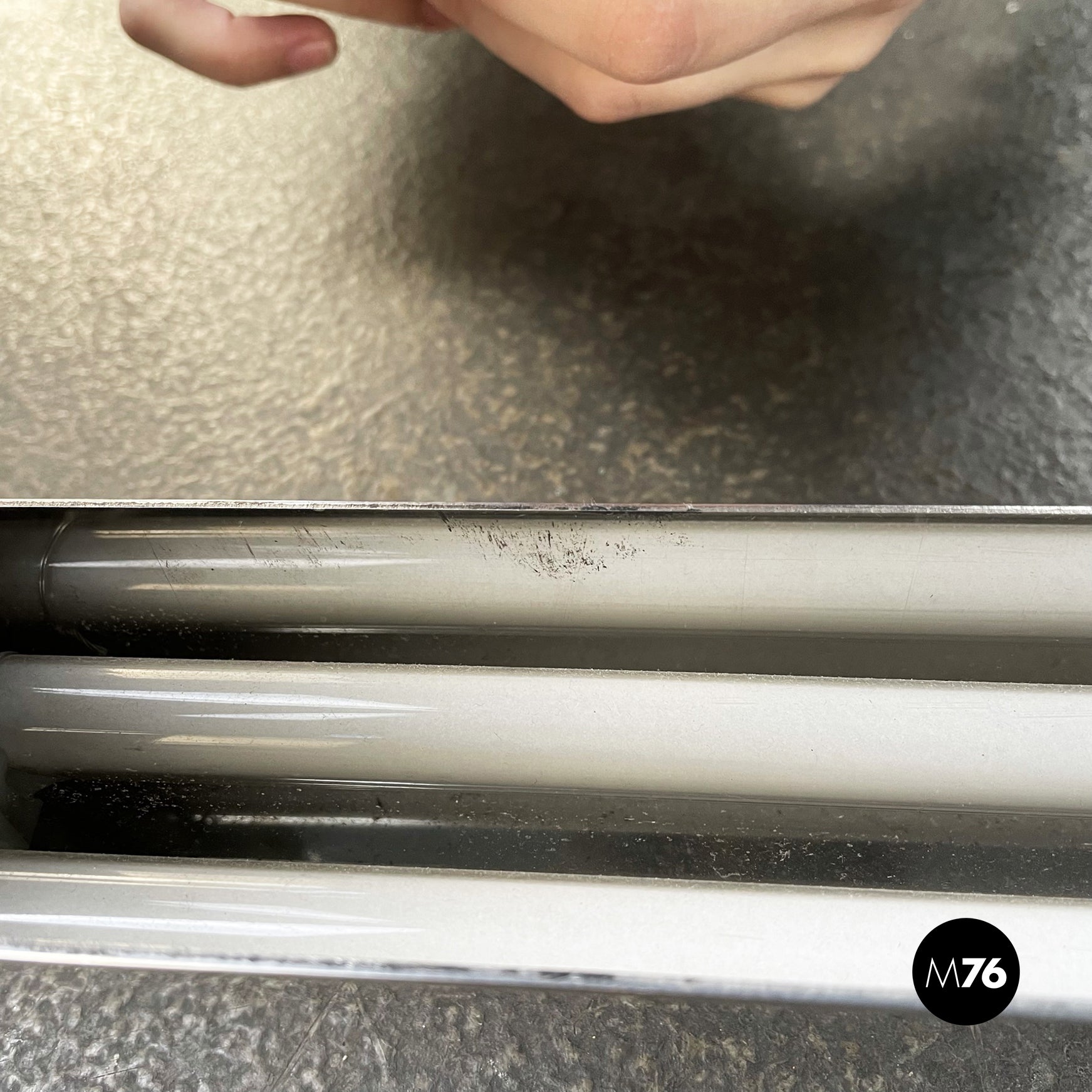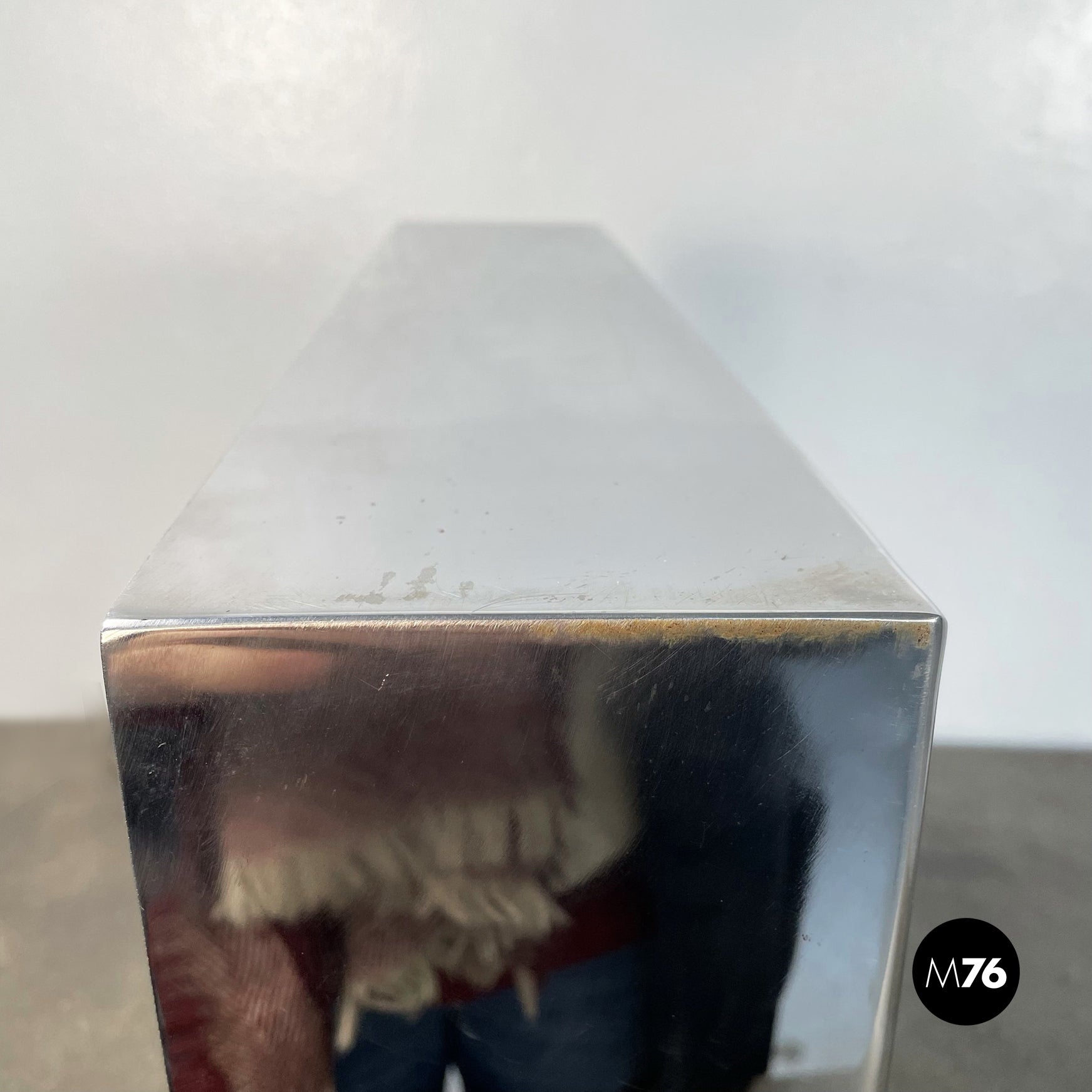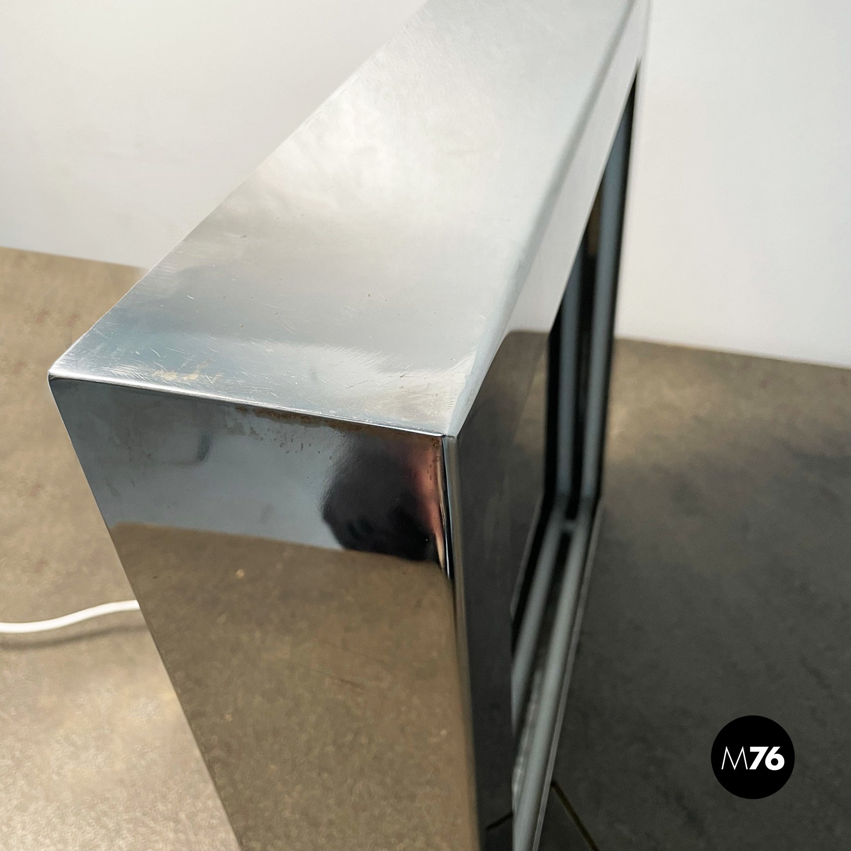 Lampada da parete o da tavolo modello Iceberg, di forma quadrata in acciaio satinato, con un neon bianco inserito nella struttura e parte frontale di forma quadrata specchiata.