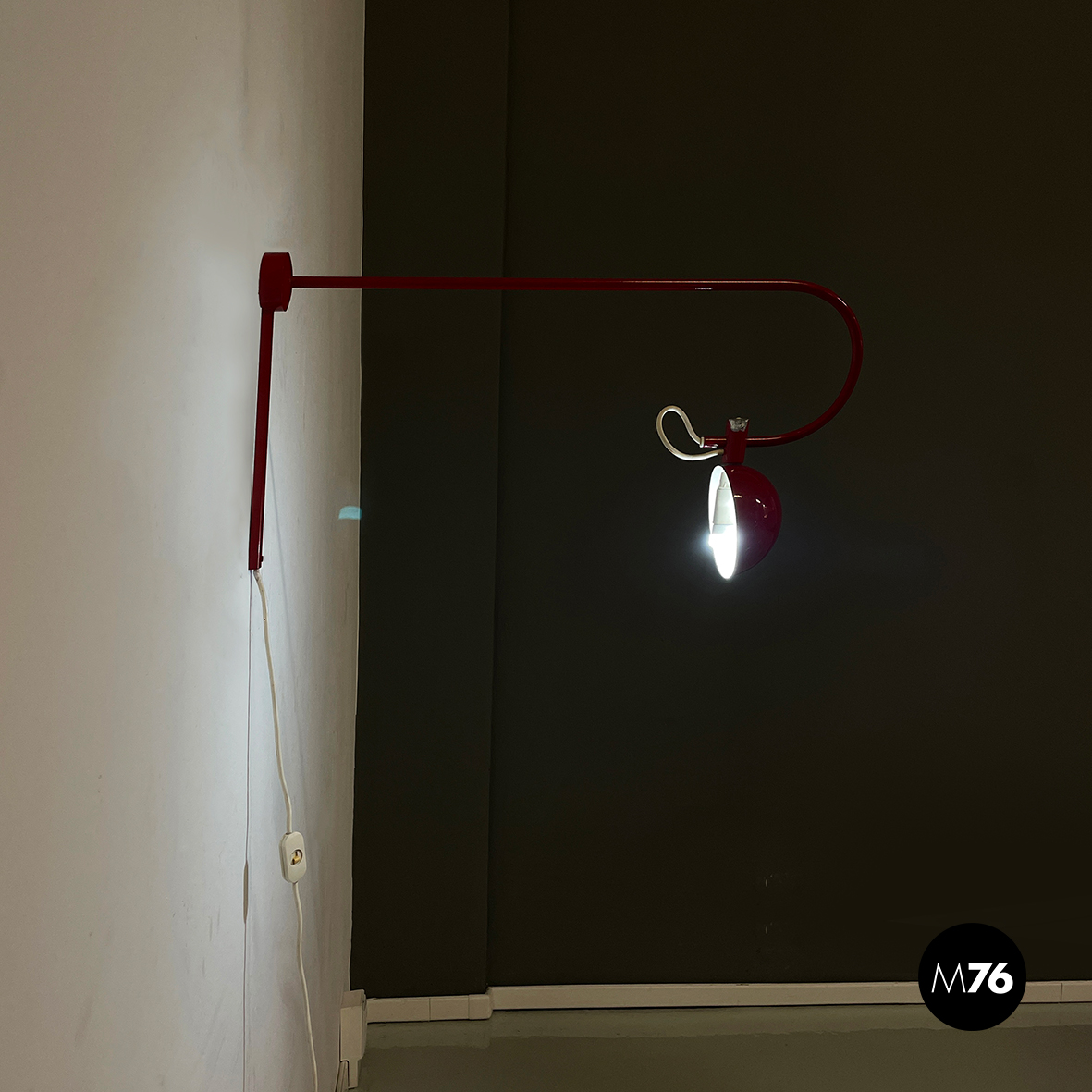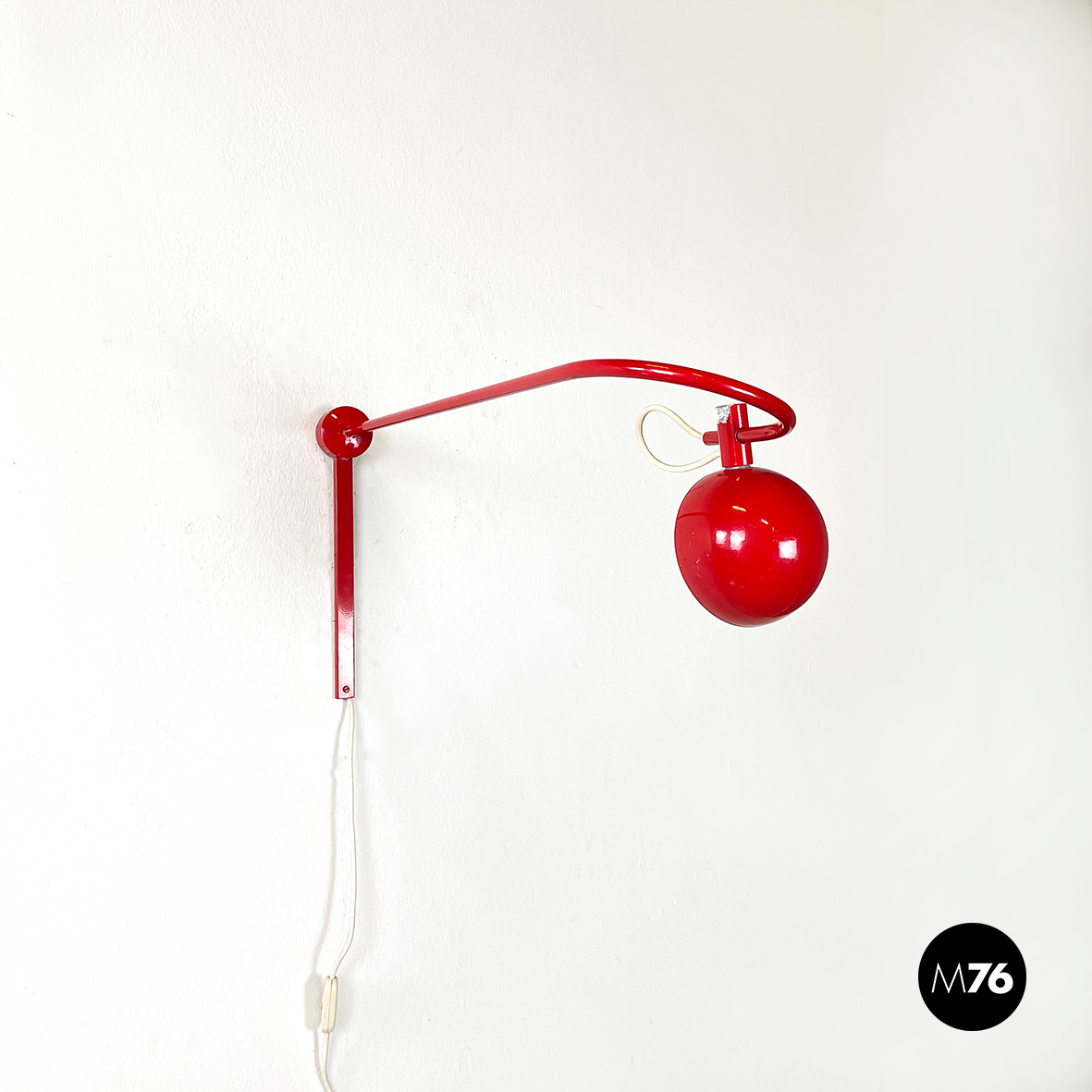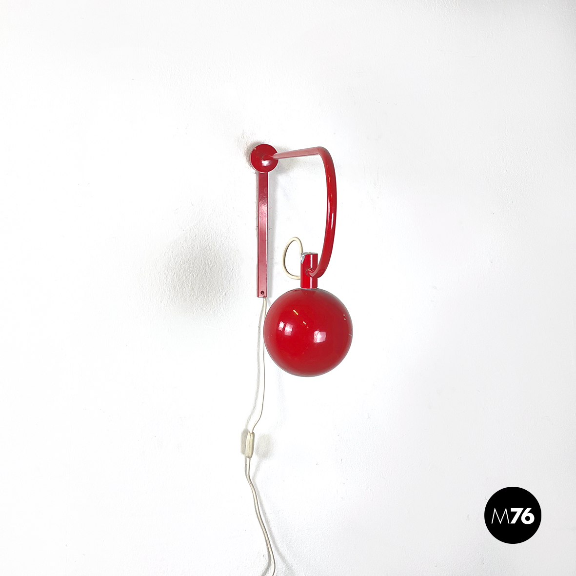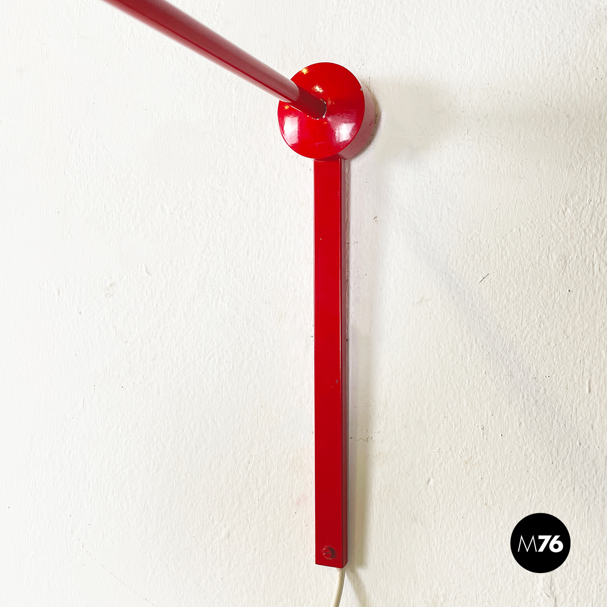 Lampada a braccio da parete in metallo verniciato rosso lucido. Il diffusore a semisfera è internamente in metallo bianco opaco ed esternamente in rosso lucido. Il braccio orientabile è in tondino di metallo rosso lucido. La base, anche essa in metallo rosso lucido, è composta da una parte cilindrica e una a parallelepipedo.