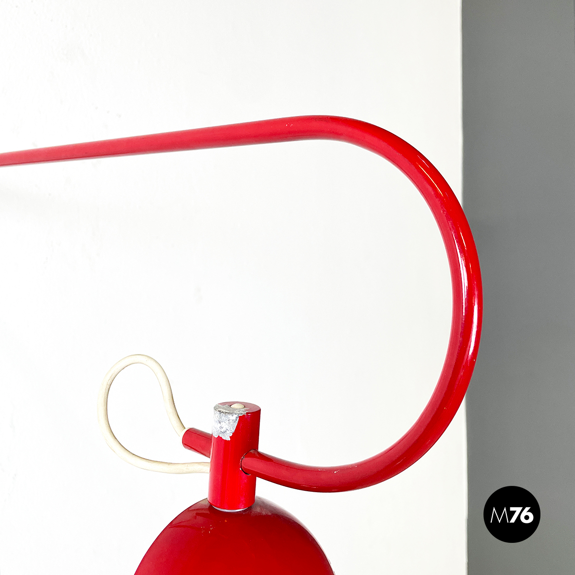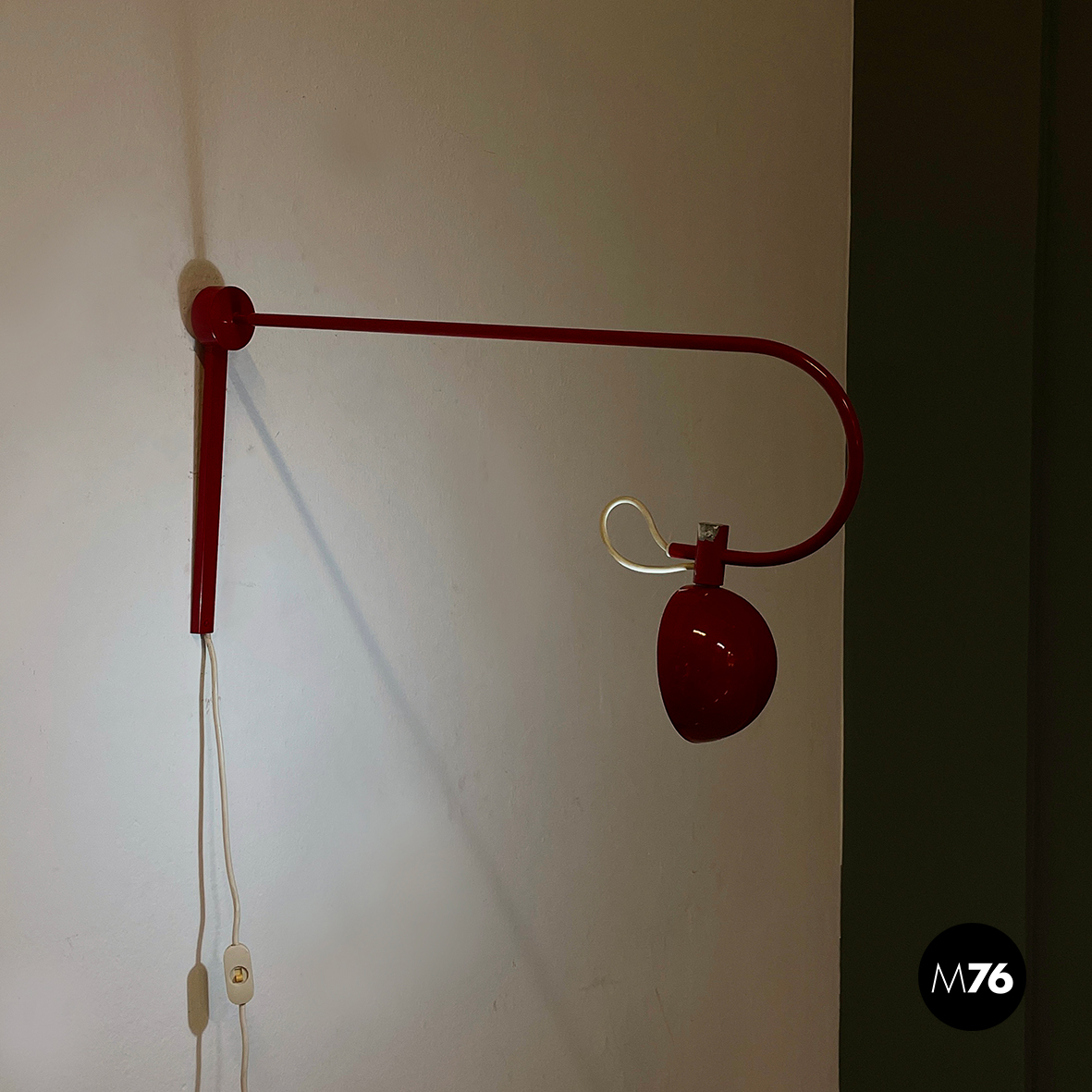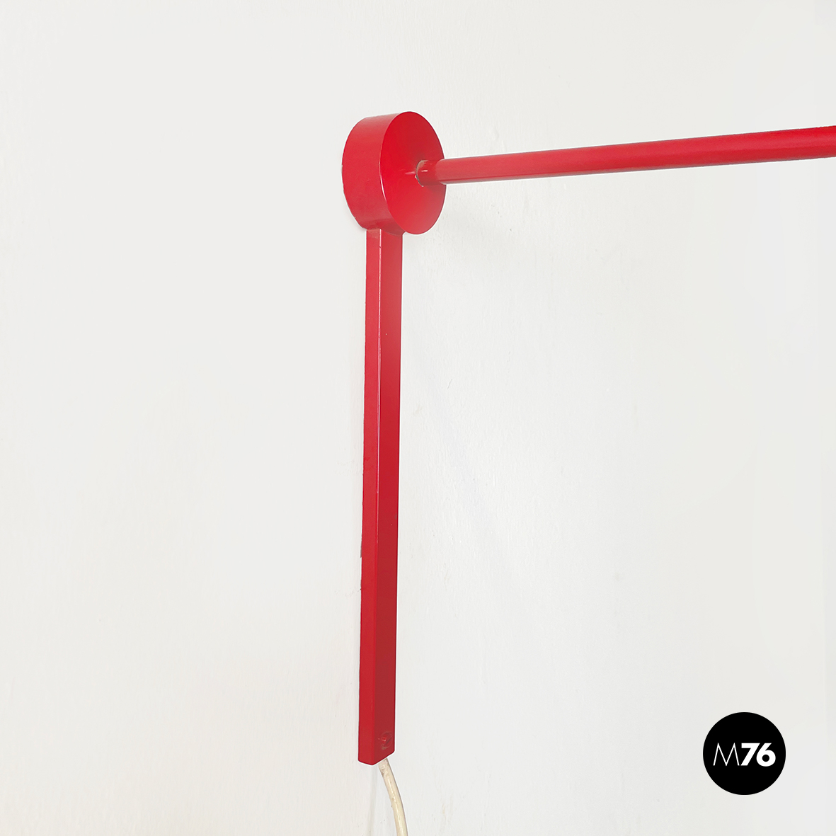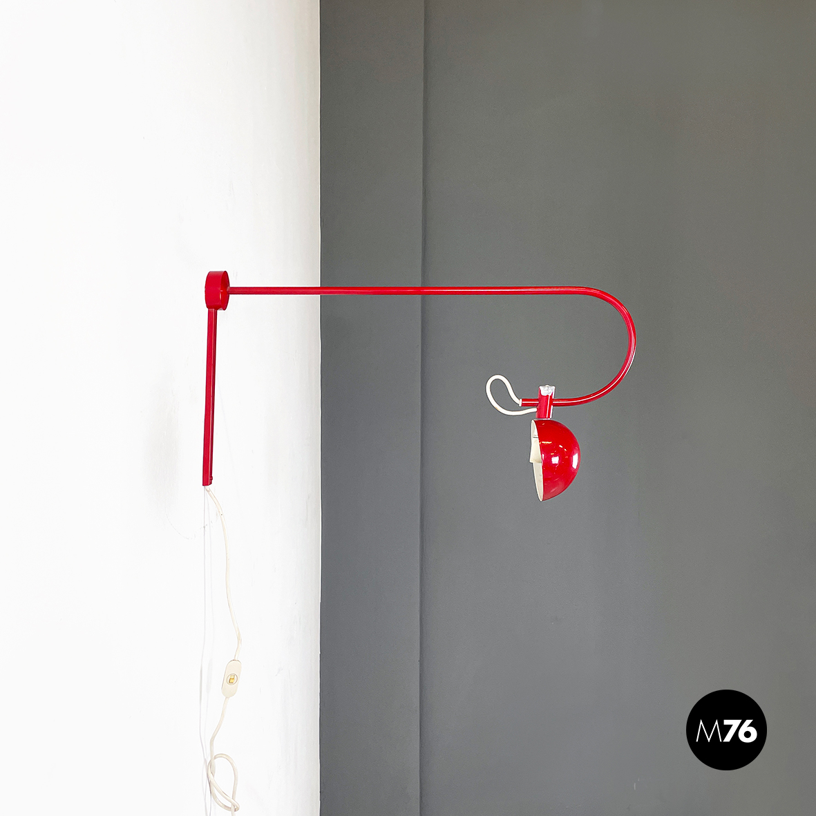 Lampada a braccio da parete in metallo verniciato rosso lucido. Il diffusore a semisfera è internamente in metallo bianco opaco ed esternamente in rosso lucido. Il braccio orientabile è in tondino di metallo rosso lucido. La base, anche essa in metallo rosso lucido, è composta da una parte cilindrica e una a parallelepipedo.