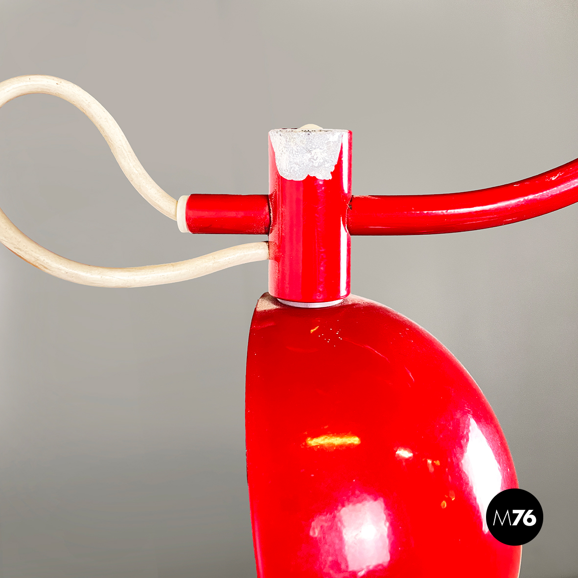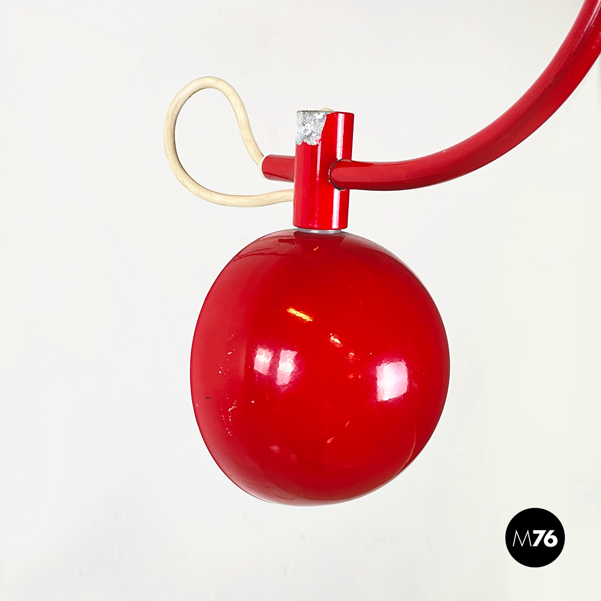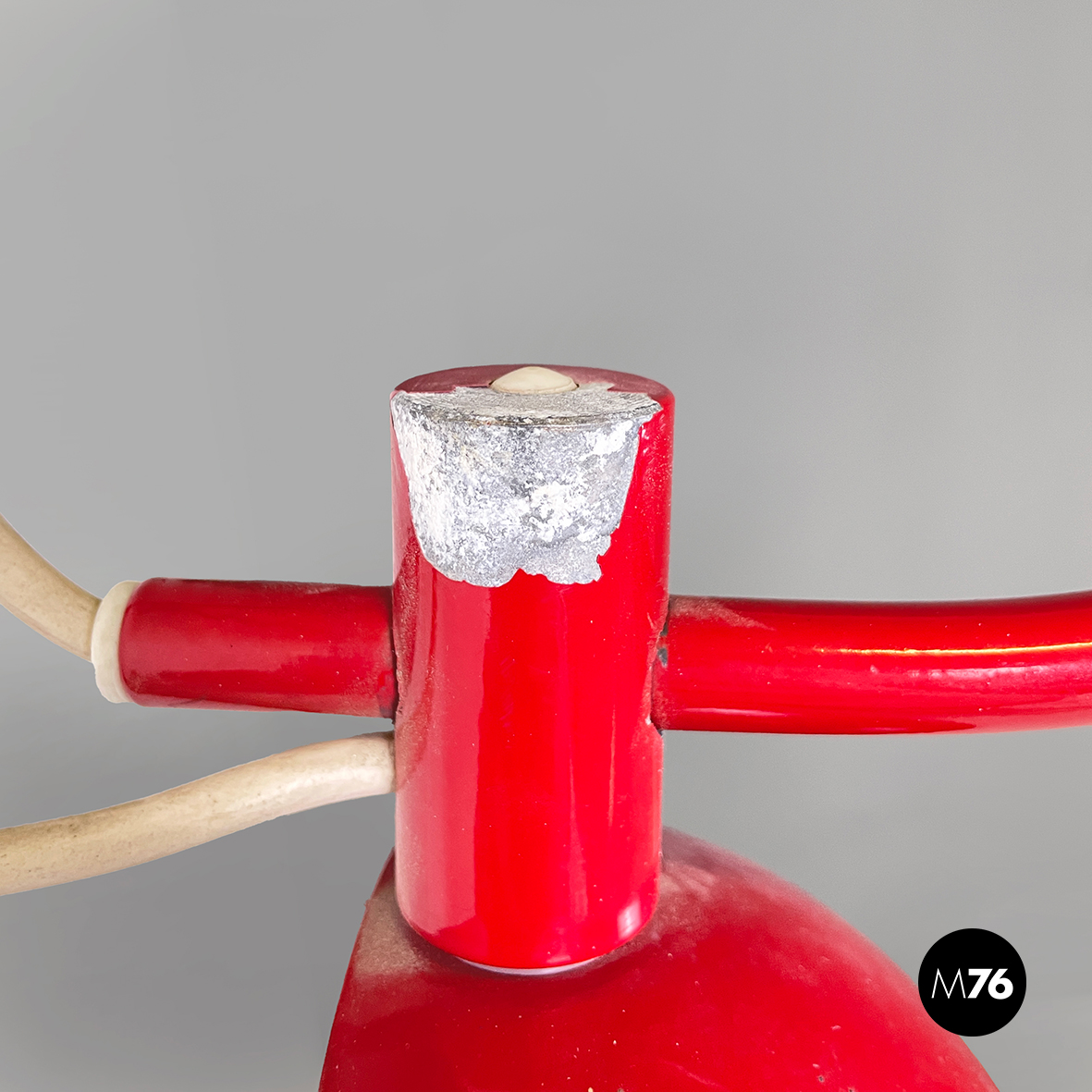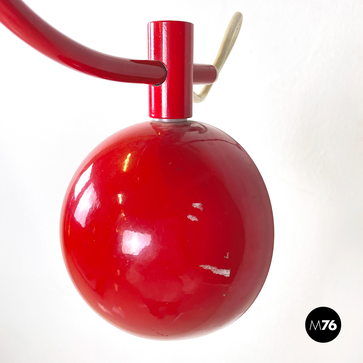 Lampada a braccio da parete in metallo verniciato rosso lucido. Il diffusore a semisfera è internamente in metallo bianco opaco ed esternamente in rosso lucido. Il braccio orientabile è in tondino di metallo rosso lucido. La base, anche essa in metallo rosso lucido, è composta da una parte cilindrica e una a parallelepipedo.
