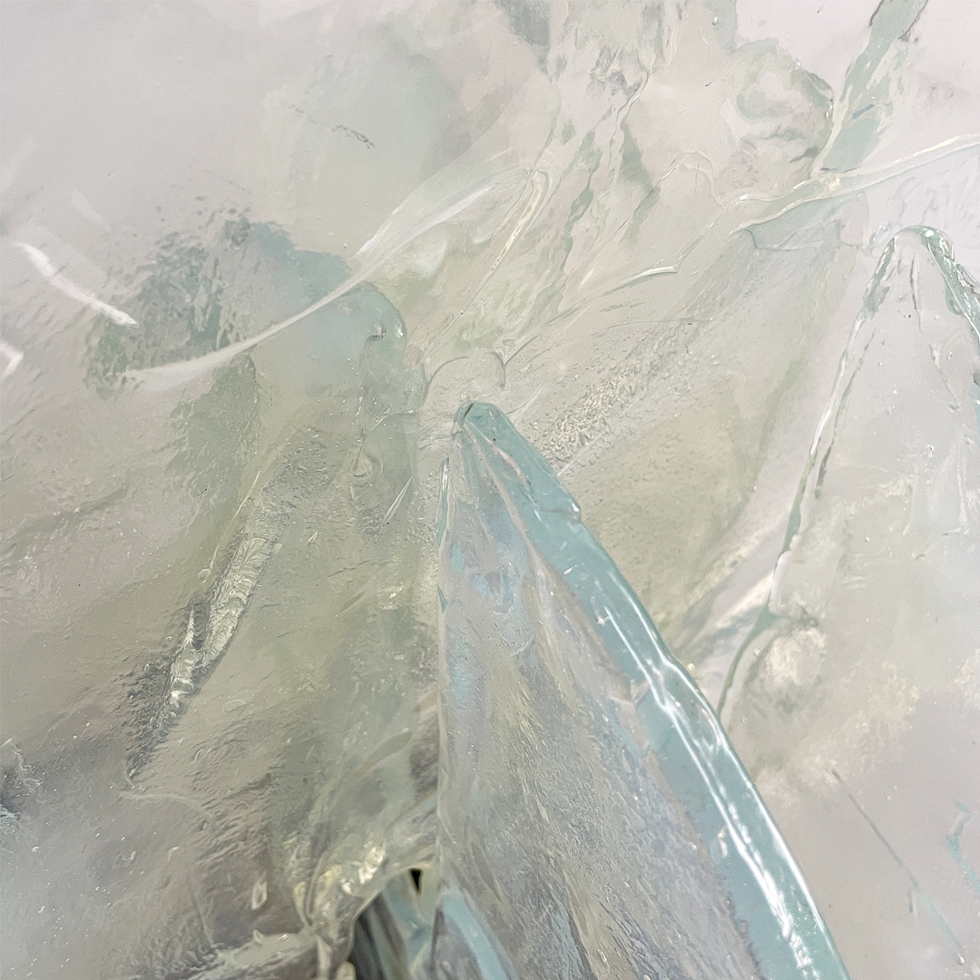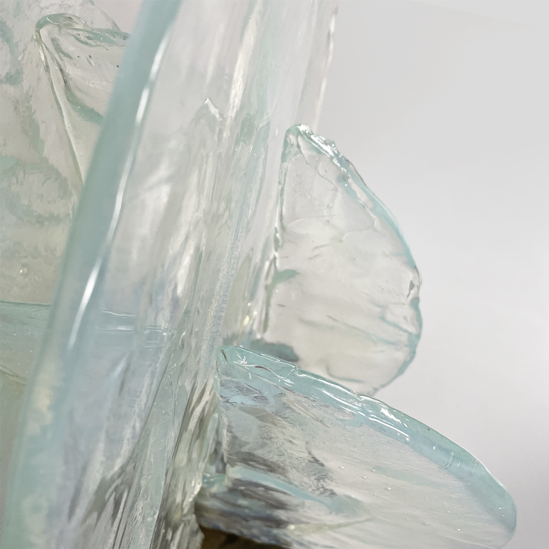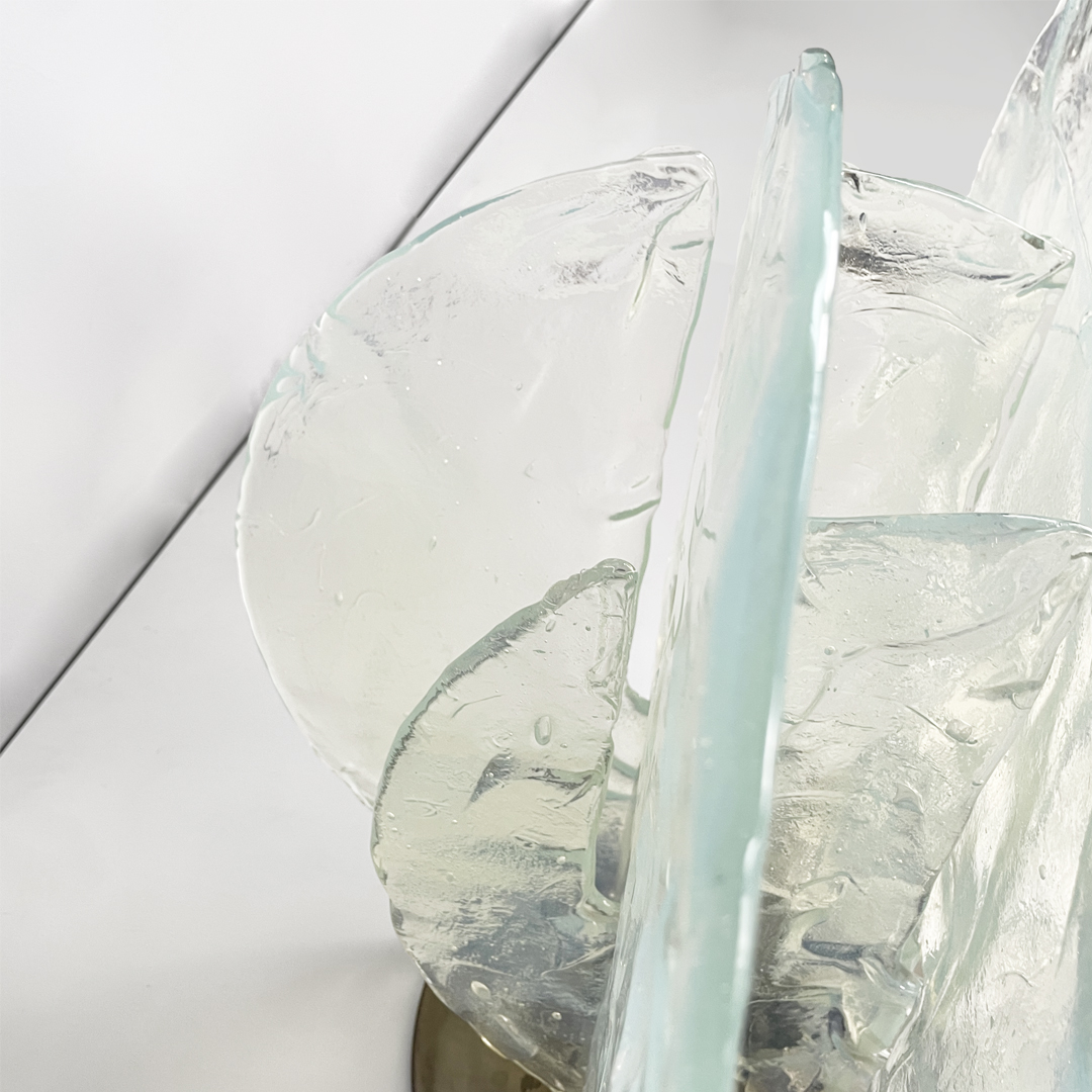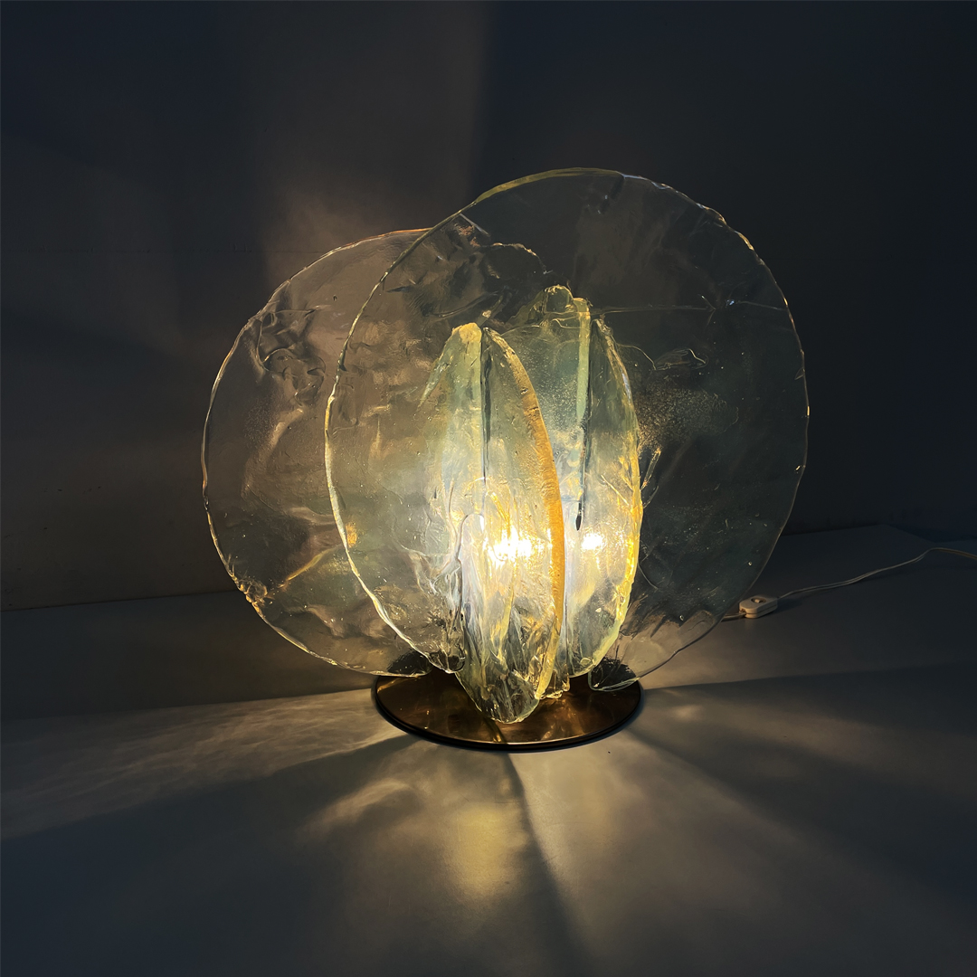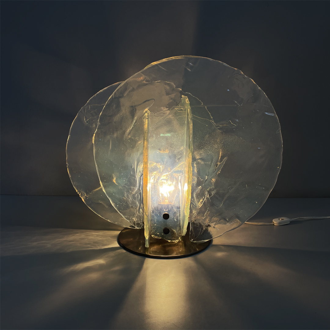 Lampada da tavolo modello 335 con base in rame spazzolato. La struttura è composta da dischi in vetro di Murano, perfettamente combinati tra loro. I vetri pulegosi si incastrano grazie alle scanalature presenti.