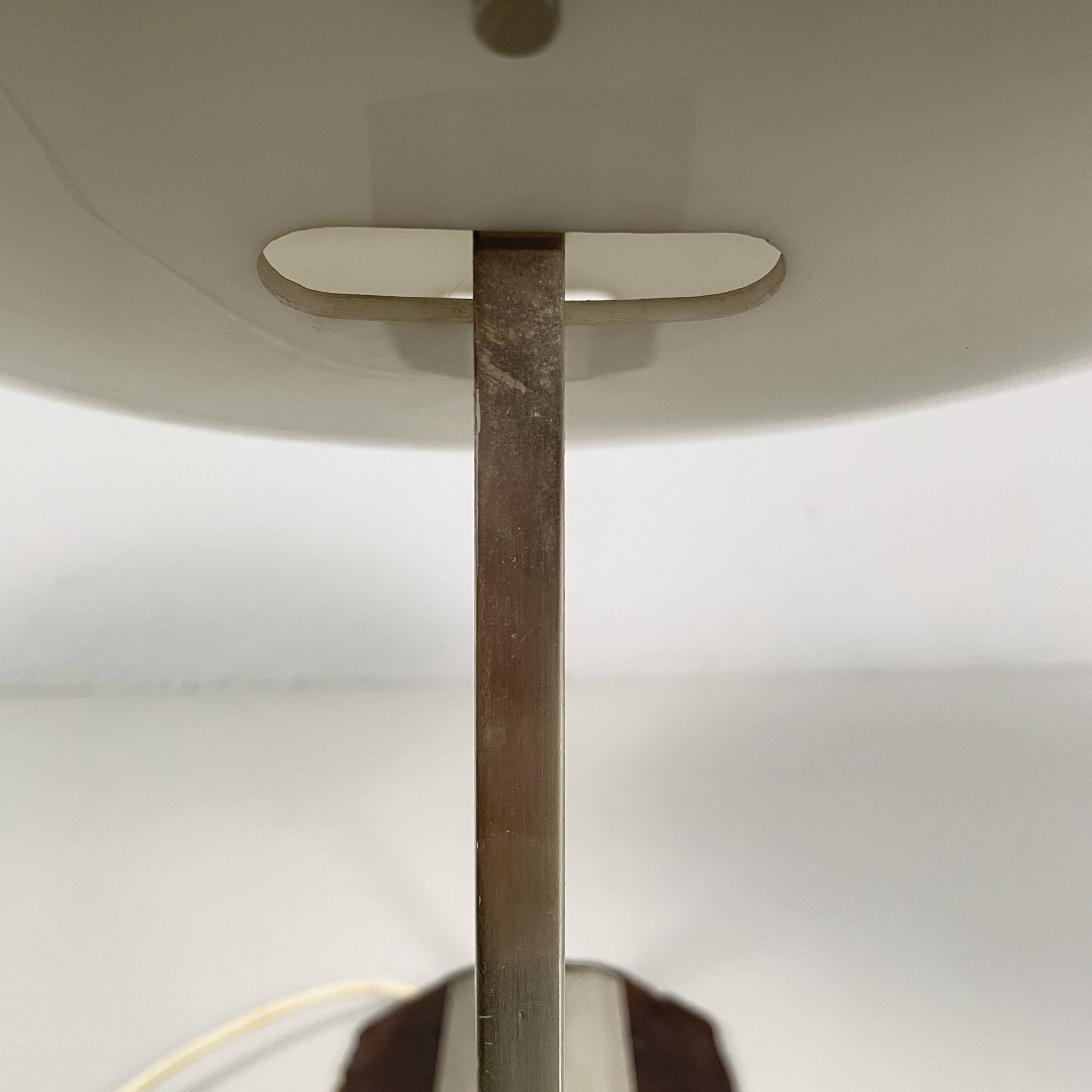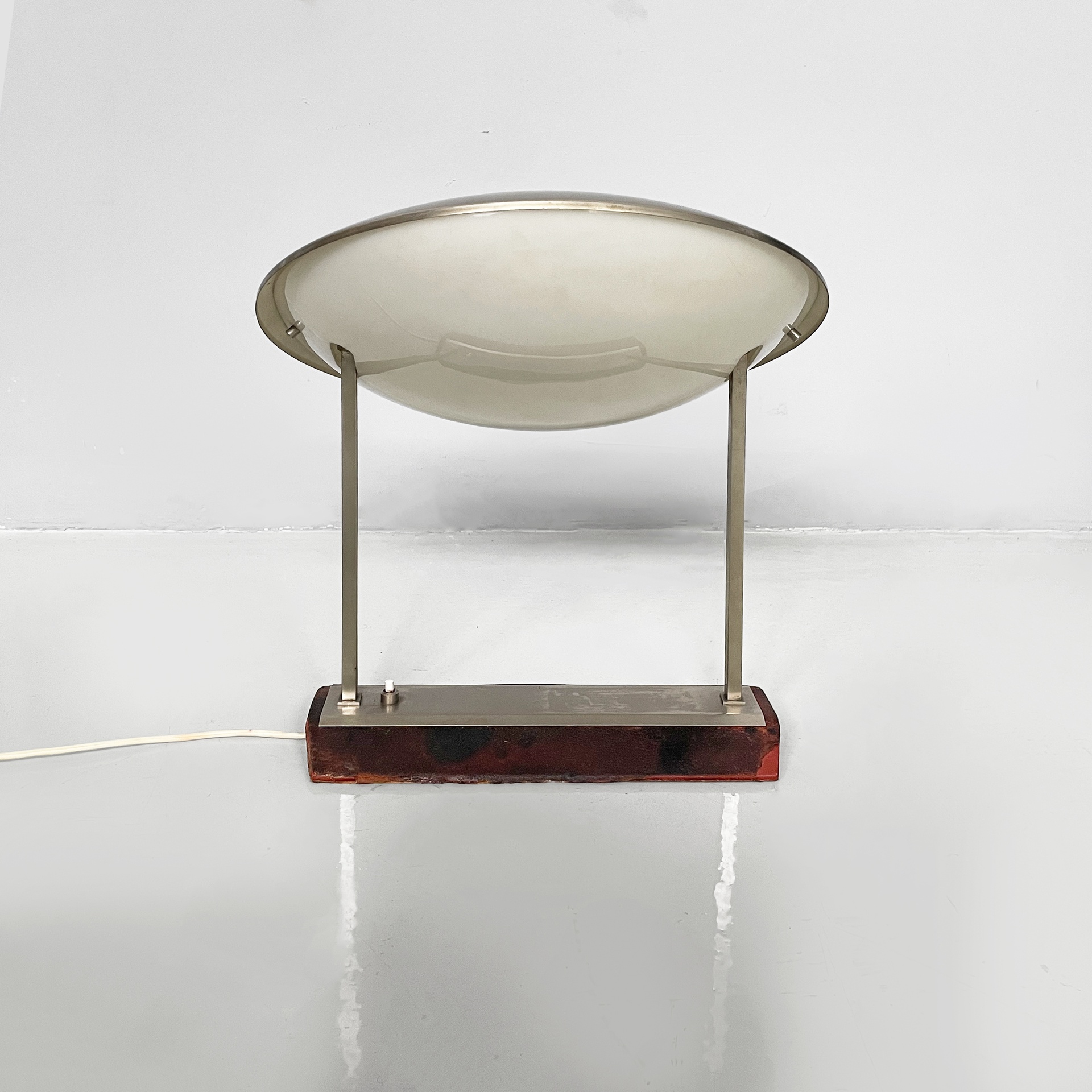 Lampada da tavolo orientabile modello 8050 con diffusore tondo in plexiglass e metallo. La struttura è composta da due listelli in metallo a sezione squadrata. Base rettangolare in metallo rivestito in pelle rosso-bordeaux.