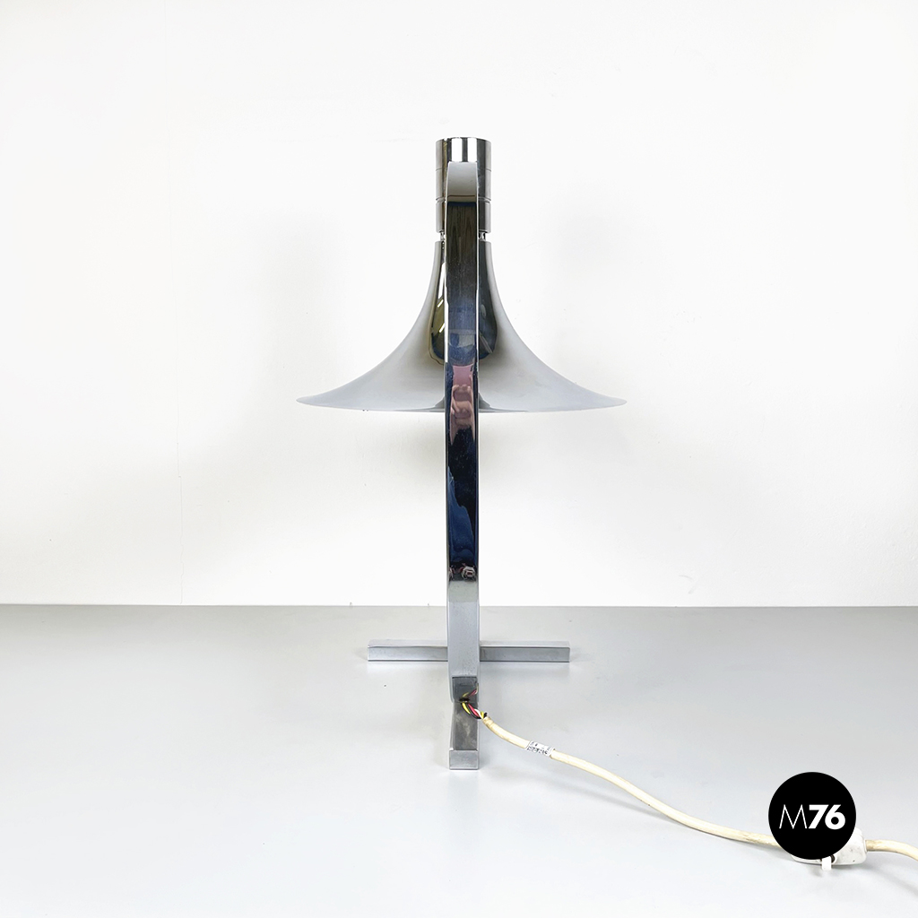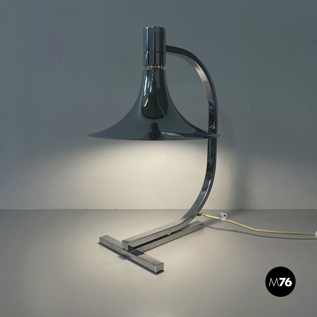 Lampada da tavolo appartenente alla serie AM/AS con struttura e paralume interamente in acciaio cromato. Il paralume a base tonda è esternamente in acciaio cromato e internamente in acciaio smaltato bianco. La struttura è composta da un braccio ricurvo a sezione quadrata. Questa serie di lampade presentano la particolarità di poter intercambiare il paralume con qualunque altro della stessa serie.
