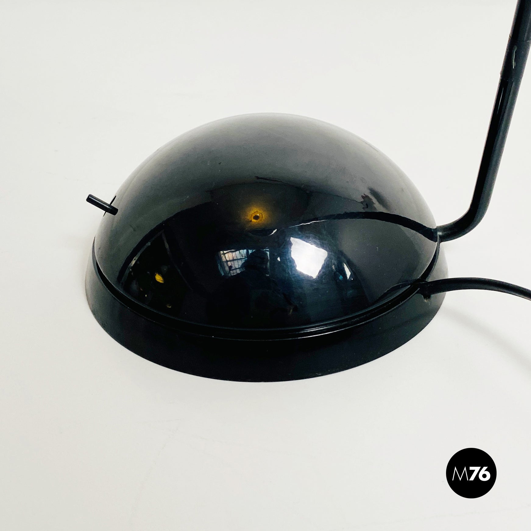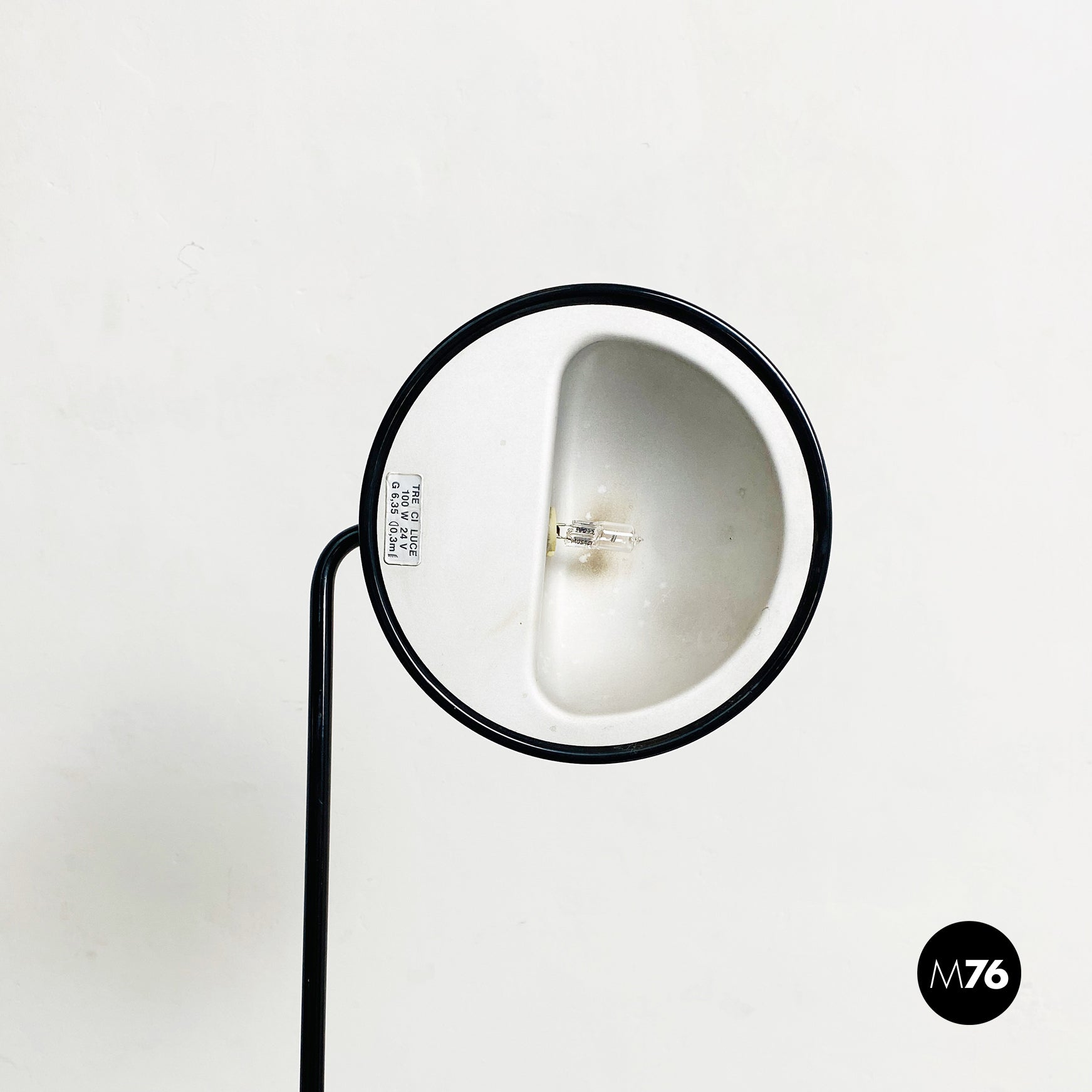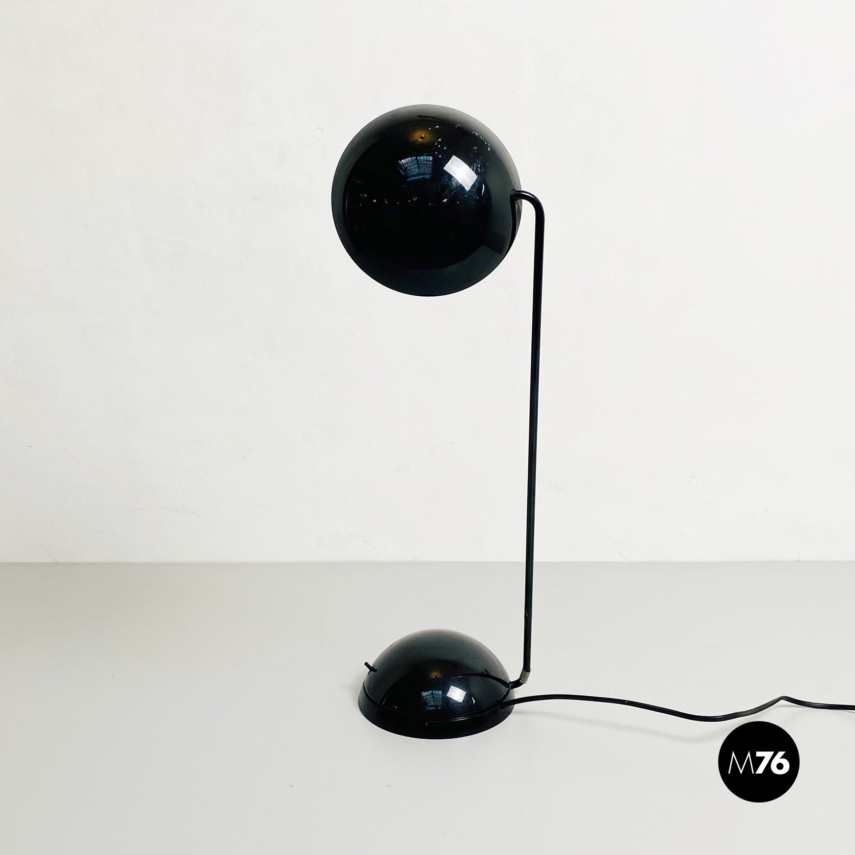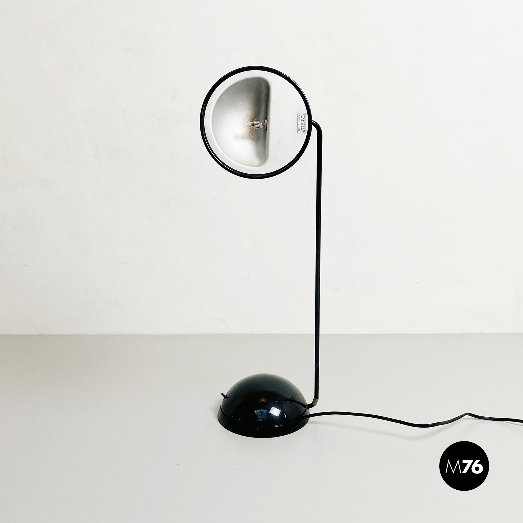 Lampada da tavolo modello Bikini a base tonda, in plastica e metallo verniciato nero. Orientabile verso tutte le direzioni e con lampadina alogena.