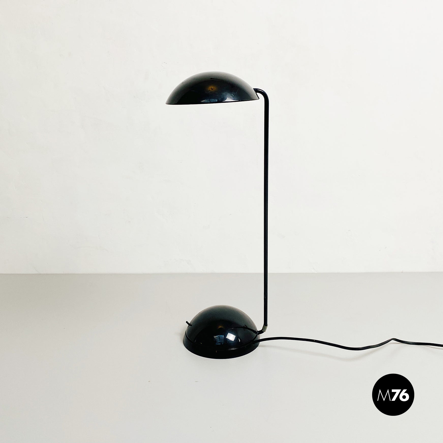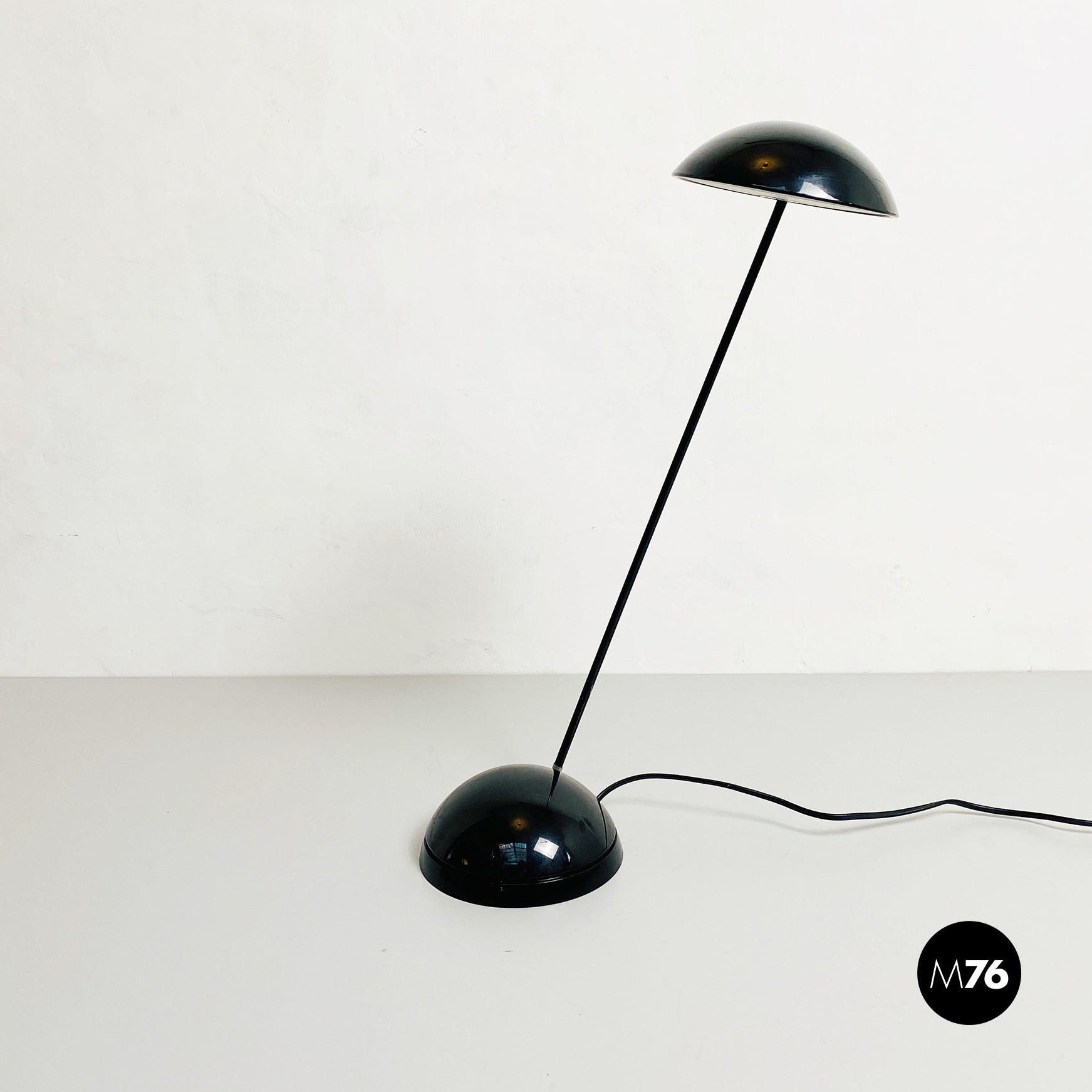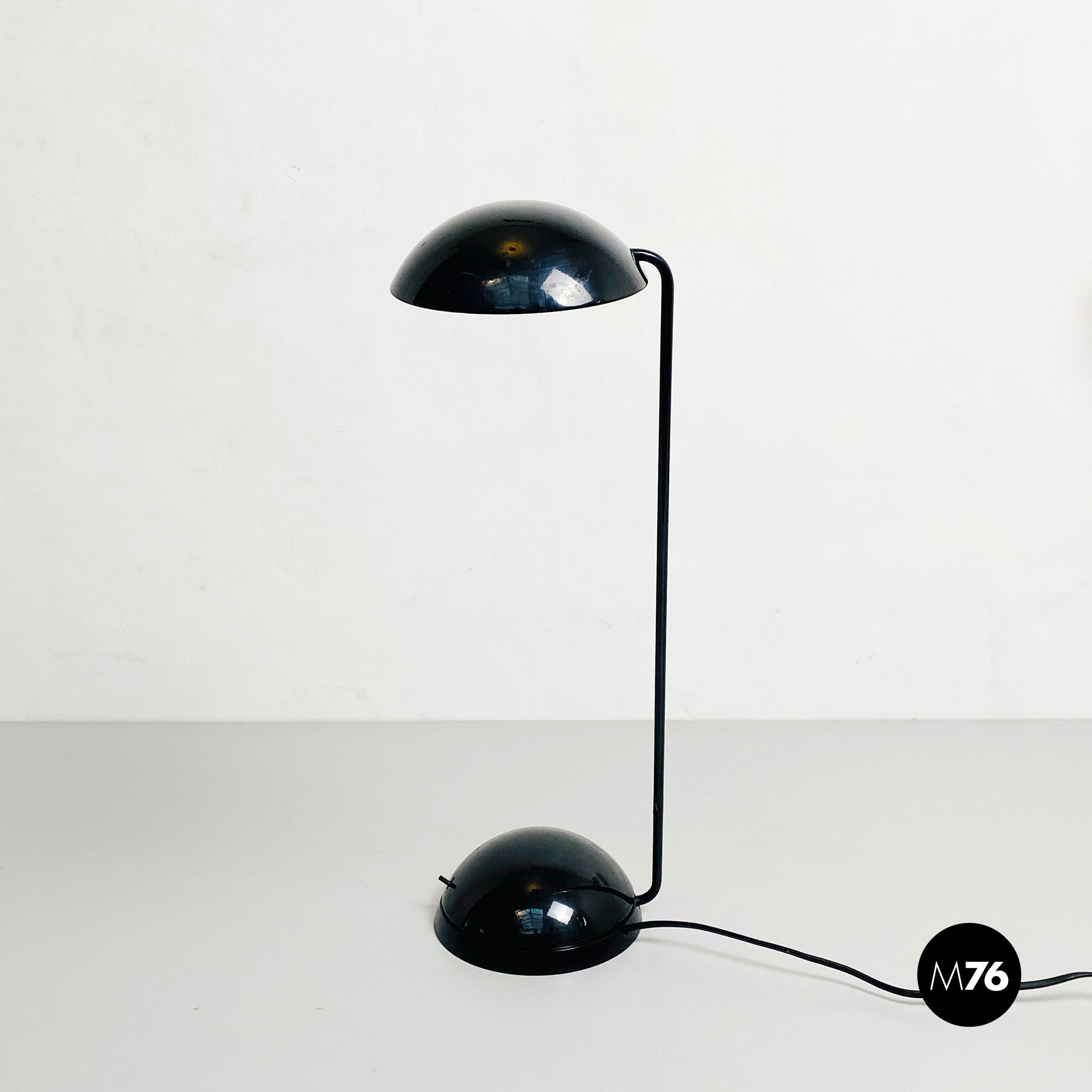 Lampada da tavolo modello Bikini a base tonda, in plastica e metallo verniciato nero. Orientabile verso tutte le direzioni e con lampadina alogena.