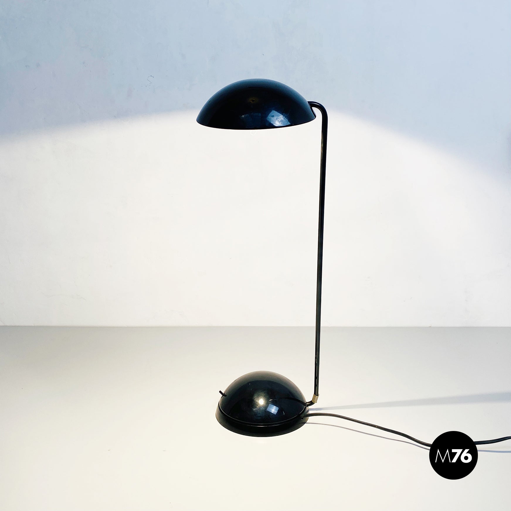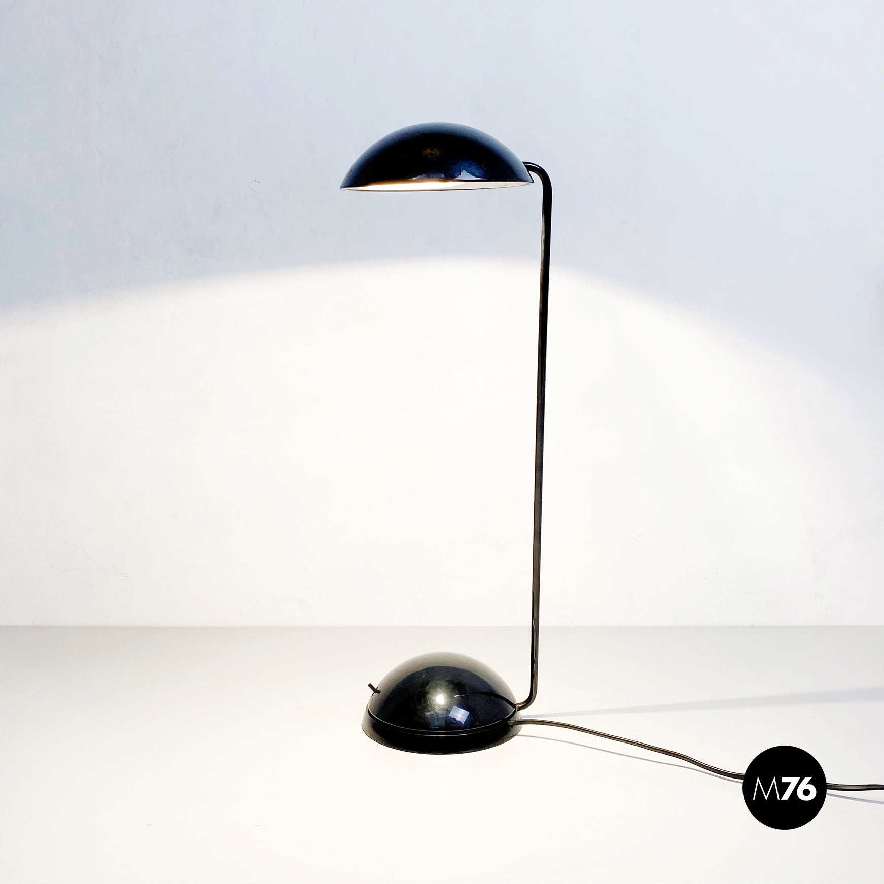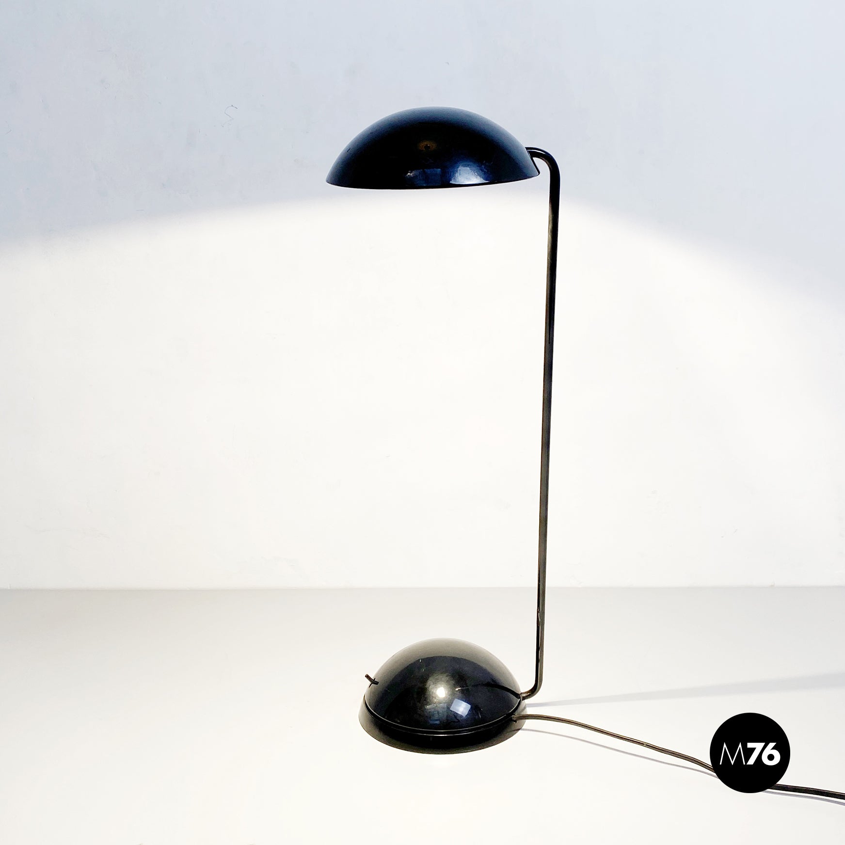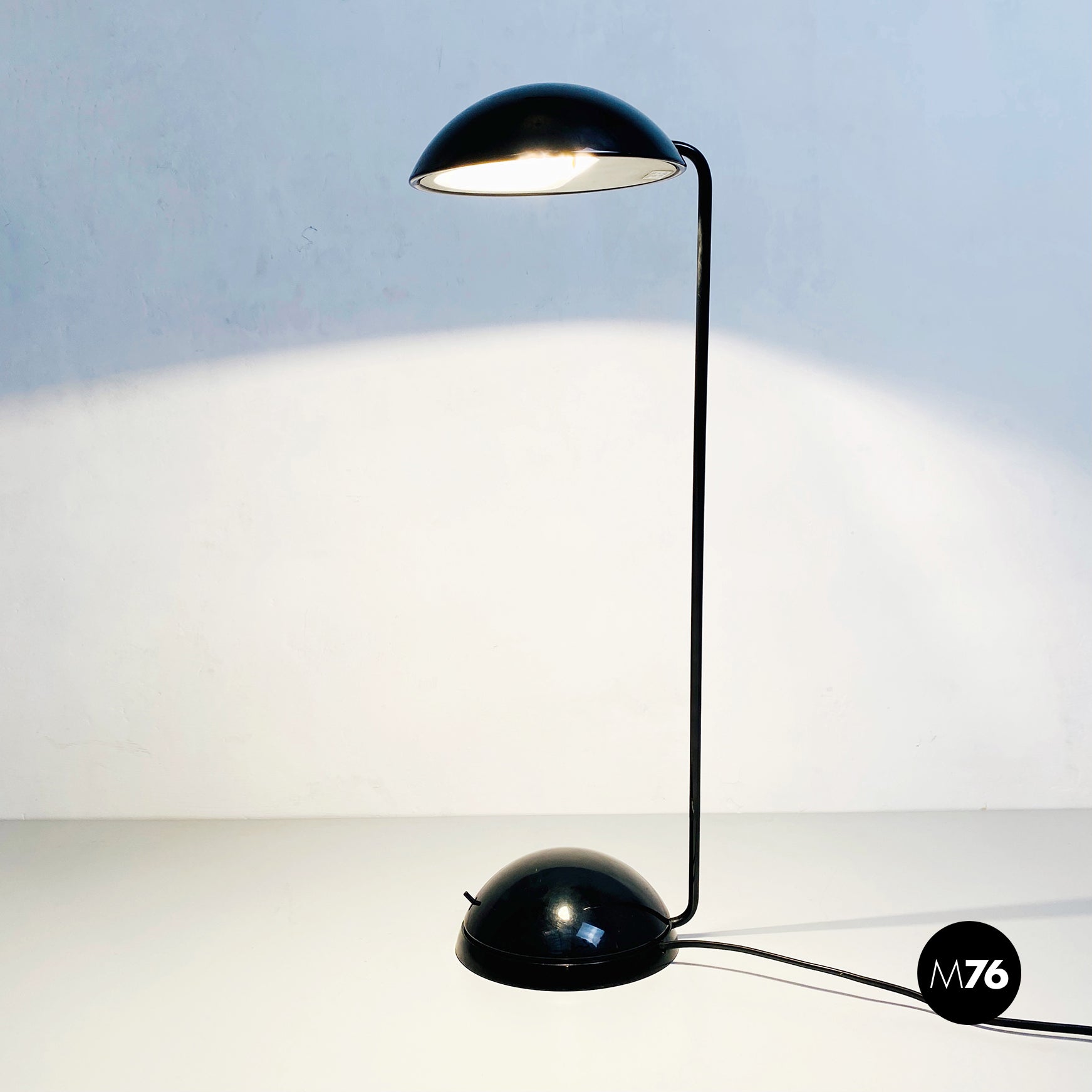 Lampada da tavolo modello Bikini a base tonda, in plastica e metallo verniciato nero. Orientabile verso tutte le direzioni e con lampadina alogena.