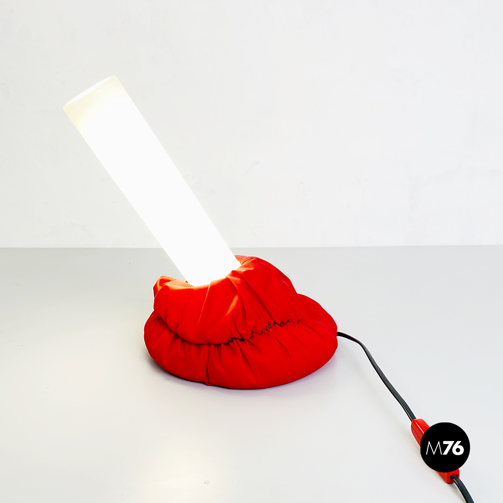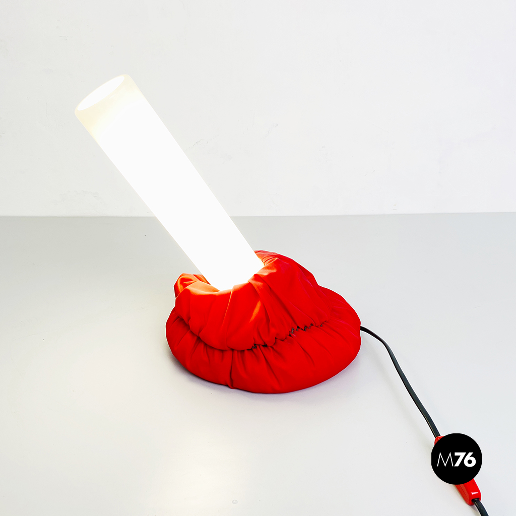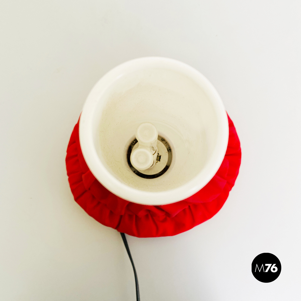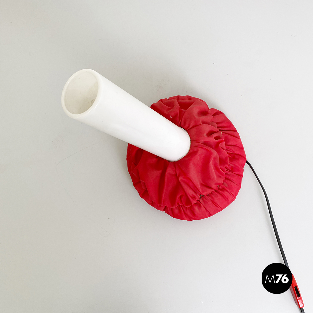 Lampada da tavolo modello Cloche con diffusore in plastica orientabile e base in tessuto rosso.