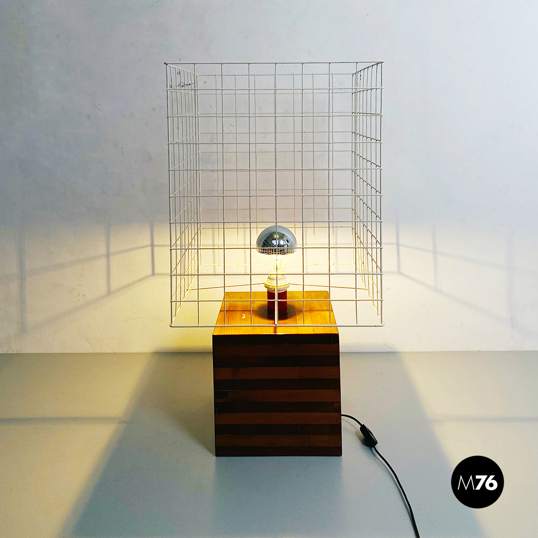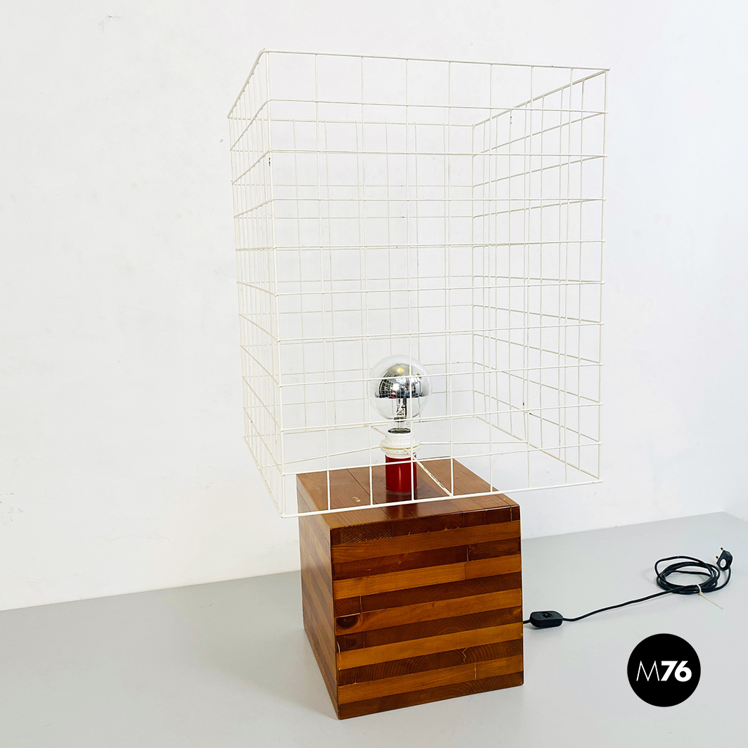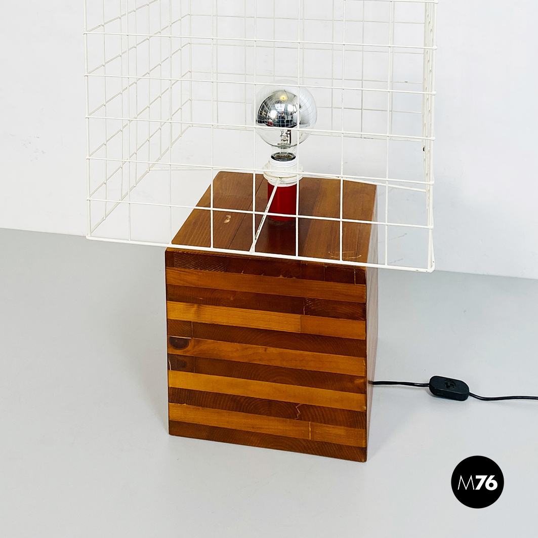 Lampada da tavolo con base quadrata in legno e paralume a griglia rettangolare in metallo verniciato bianco.