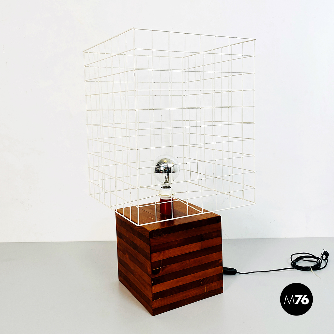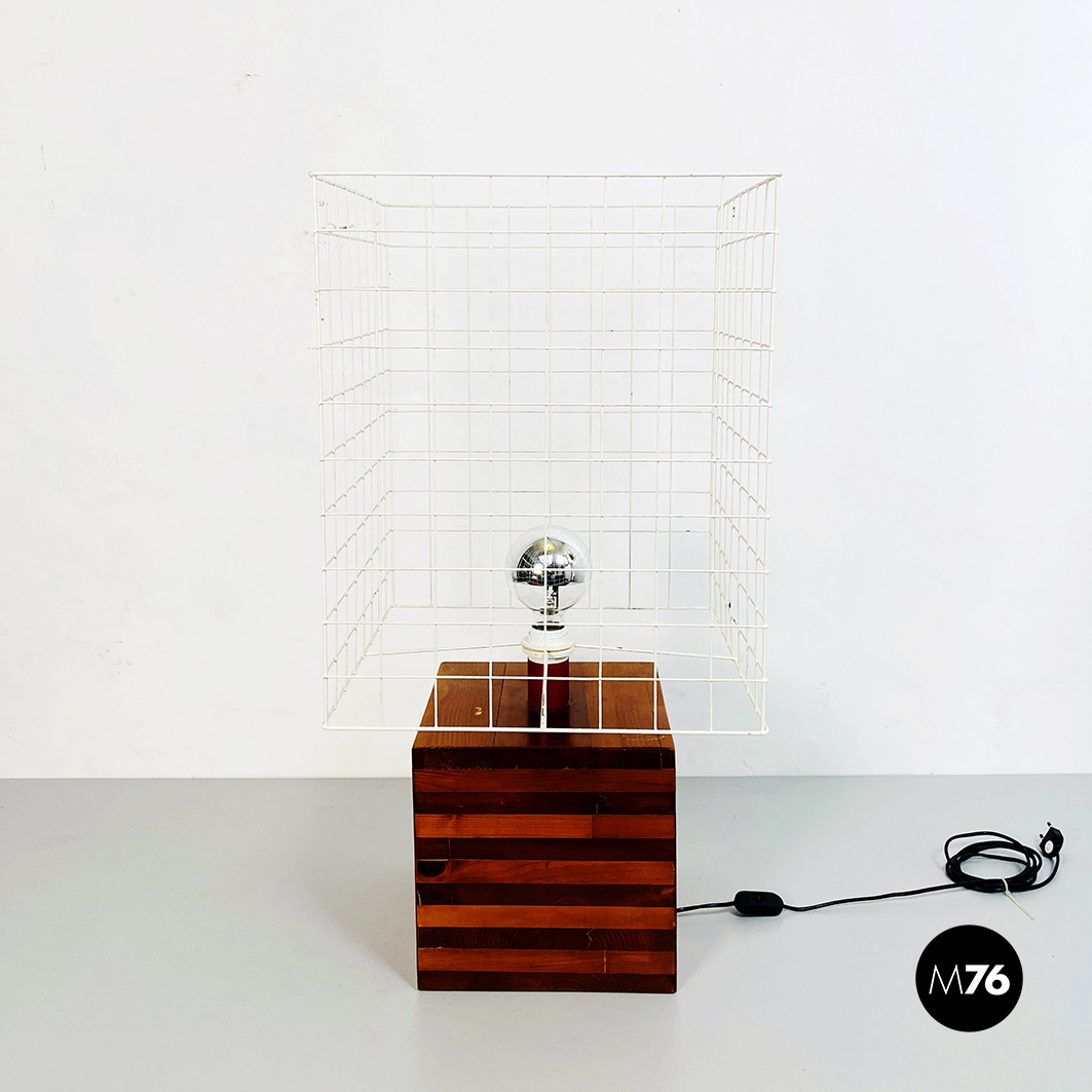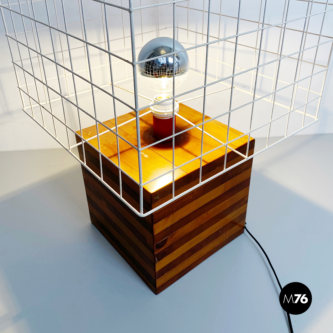 Lampada da tavolo con base quadrata in legno e paralume a griglia rettangolare in metallo verniciato bianco.