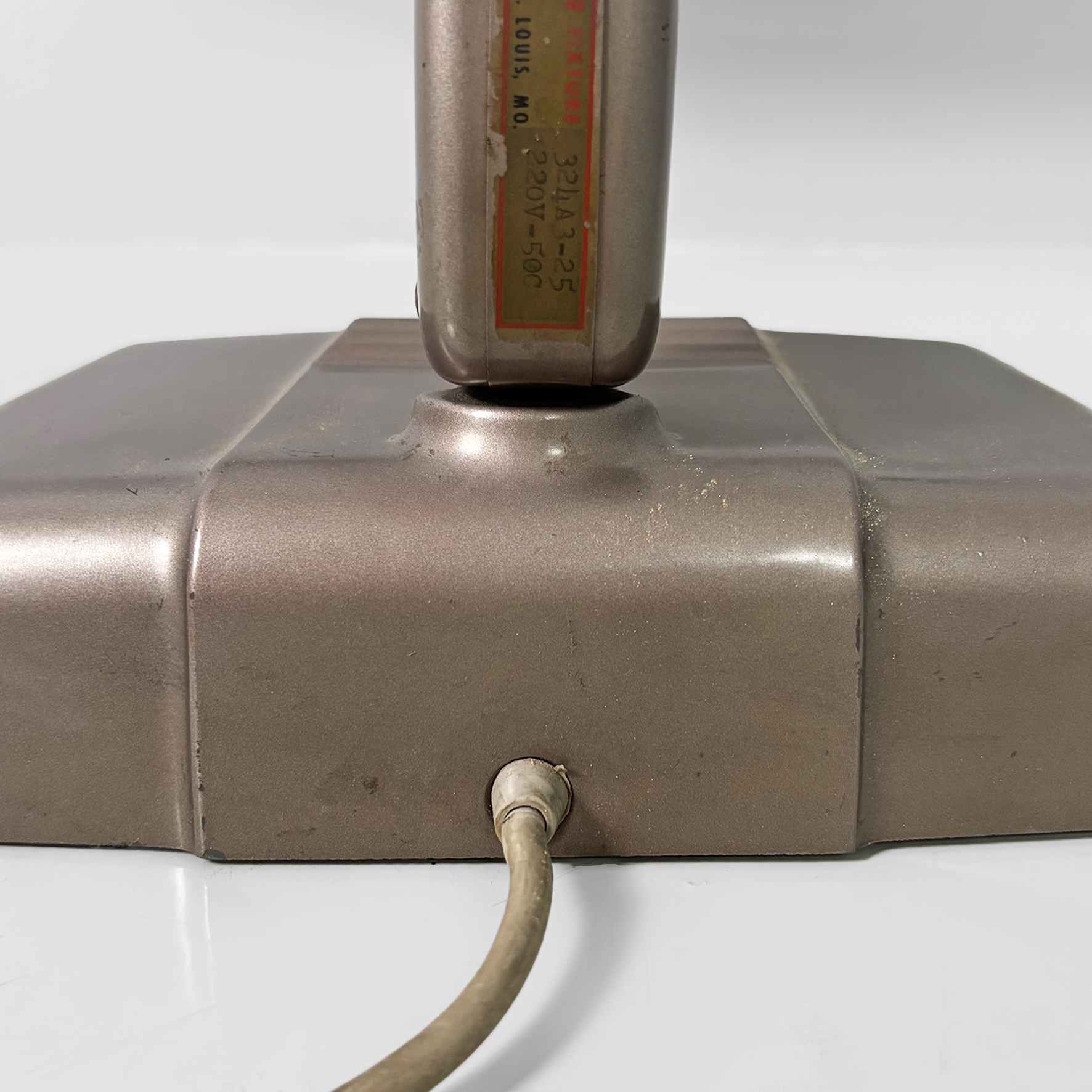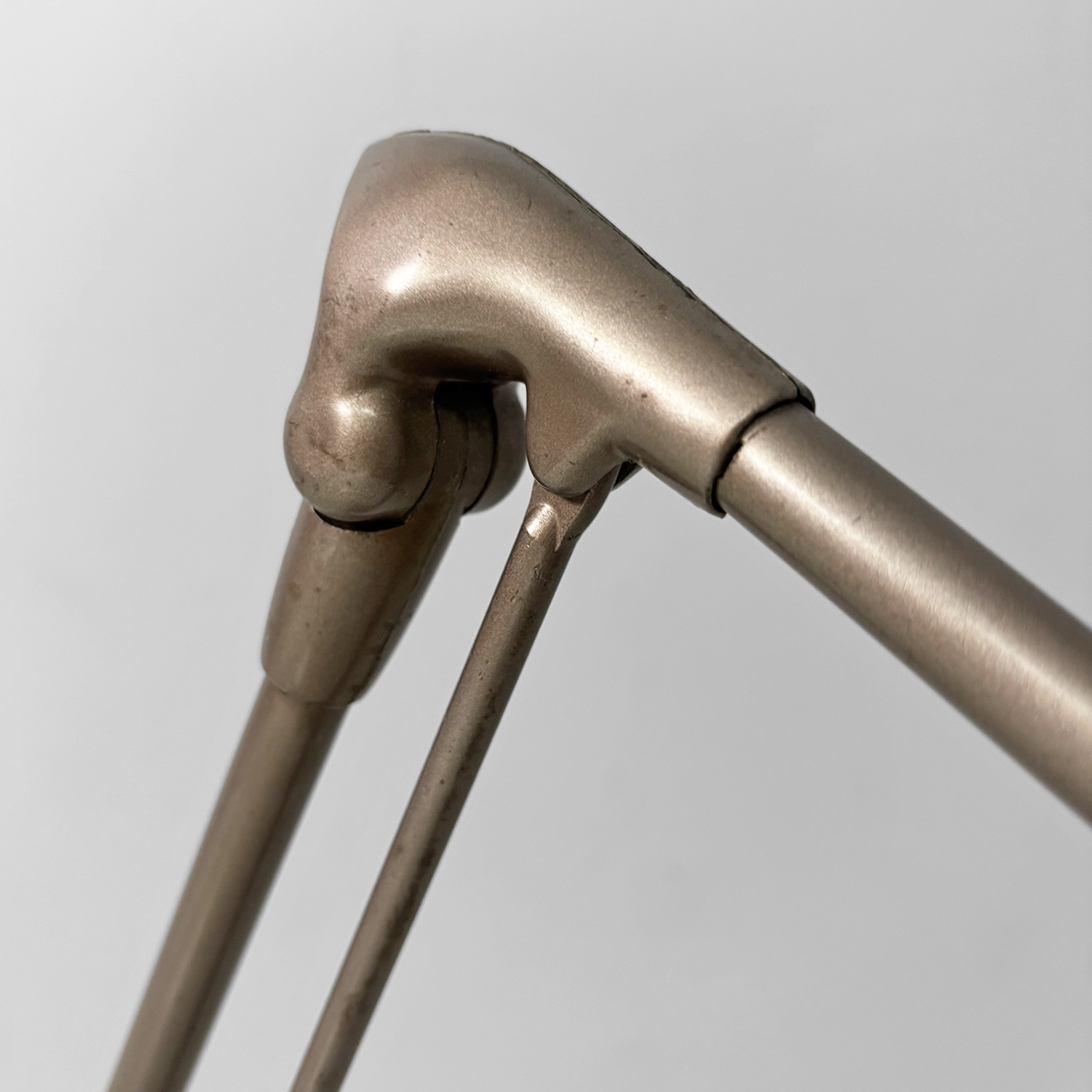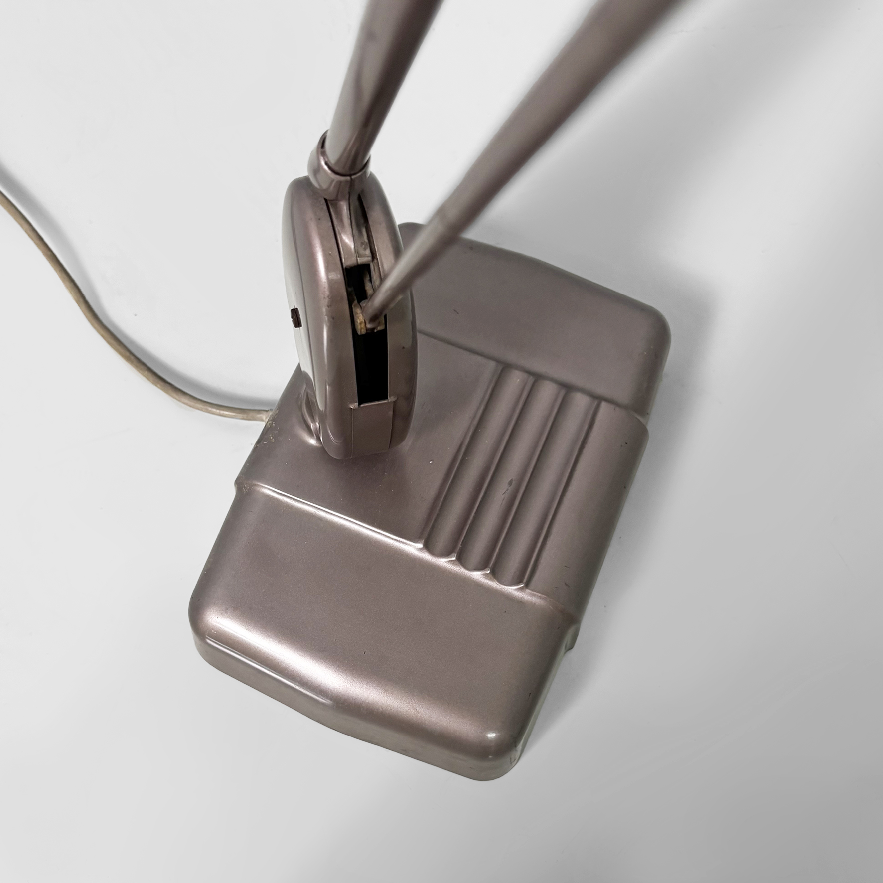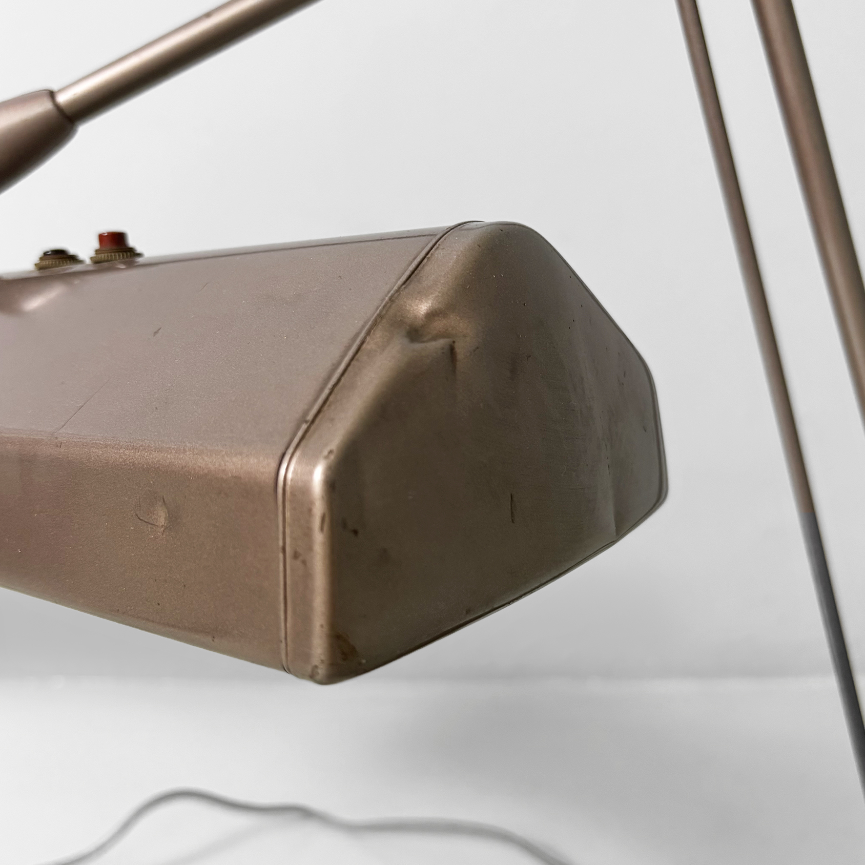 Lampada da tavolo industriale galleggiante o da scrivania, rientrante nella categoria delle “floating fixtures” utilizzate in laboratorio. La struttura è interamente in metallo, di colore viola chiaro tendente al grigio, ed è provvista di un braccio diviso in due parti, la cui parte bassa ruota sulla sua base rettangolare per orientarla in ogni posizione. La parte alta del braccio a sua volta permette il posizionamento del diffusore in alto e in basso a seconda dell’utilizzo. Diffusore contenente tre neon, e sul quale sono posti due interruttori on e off, di cui uno rosso e uno nero. Due dei tre neon emettono luce bianca, mentre quello centrale emette una luce rosata più flebile, probabilmente dovuta all’usura dello stesso supporto, che non rovina il complessivo effetto e utilizzo della lampada.