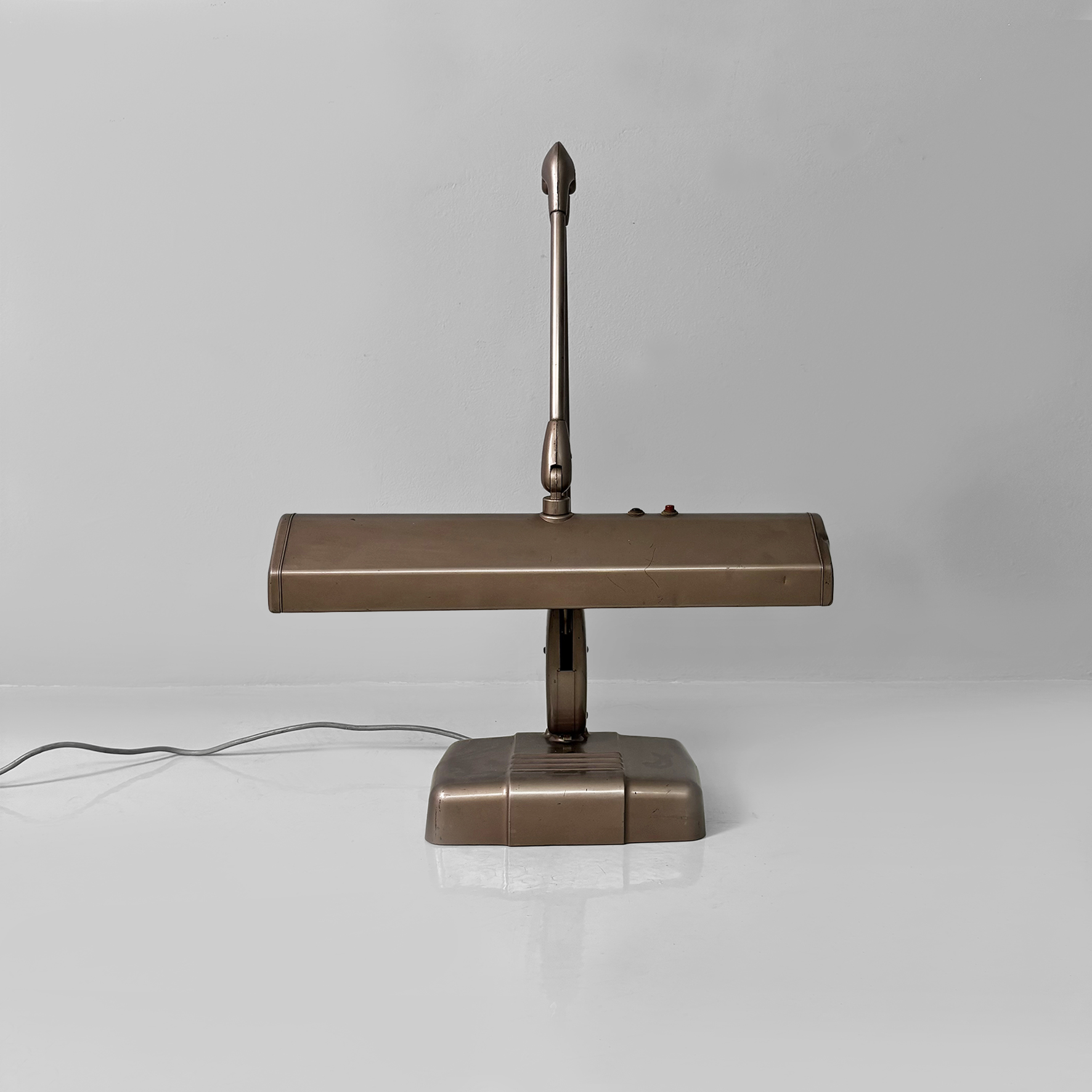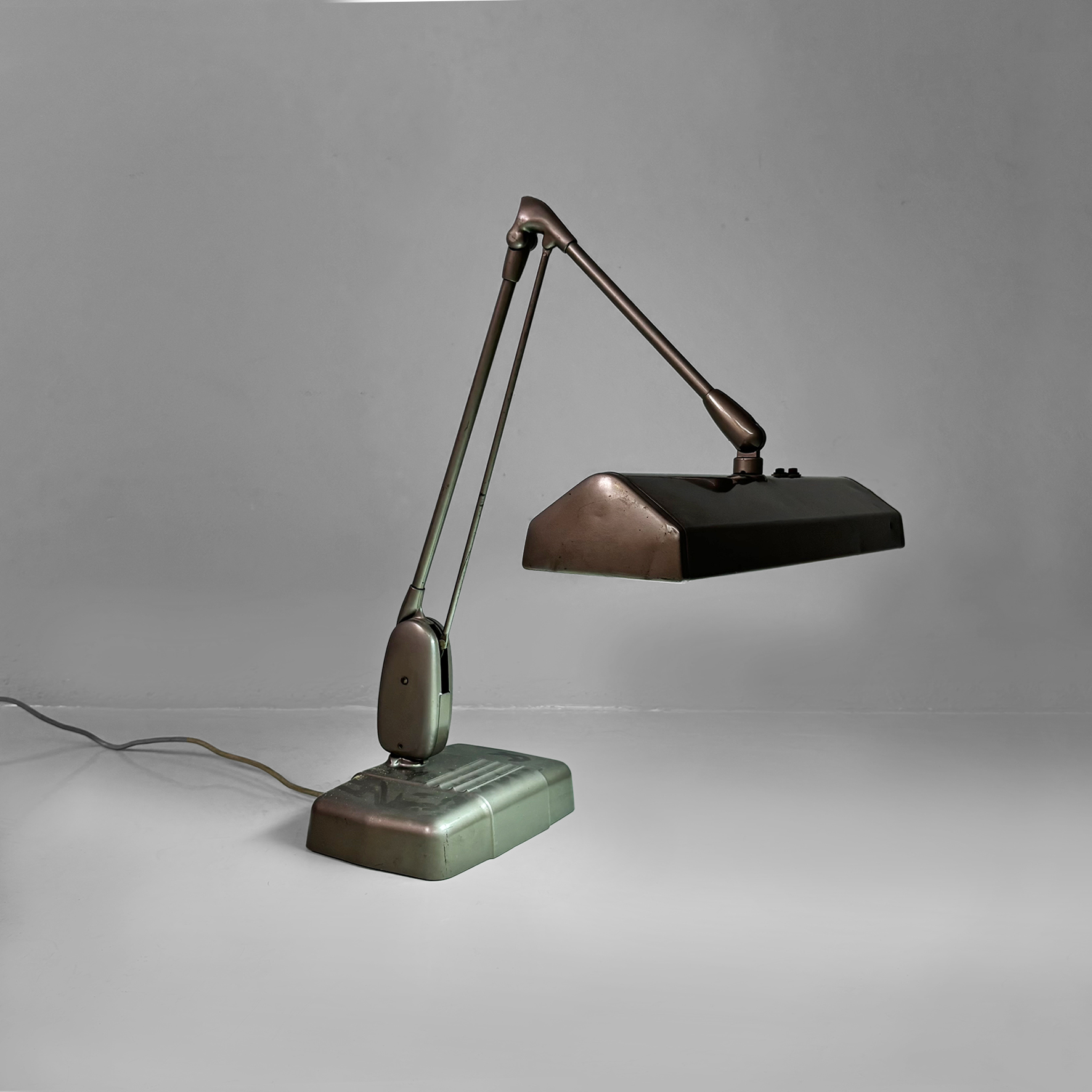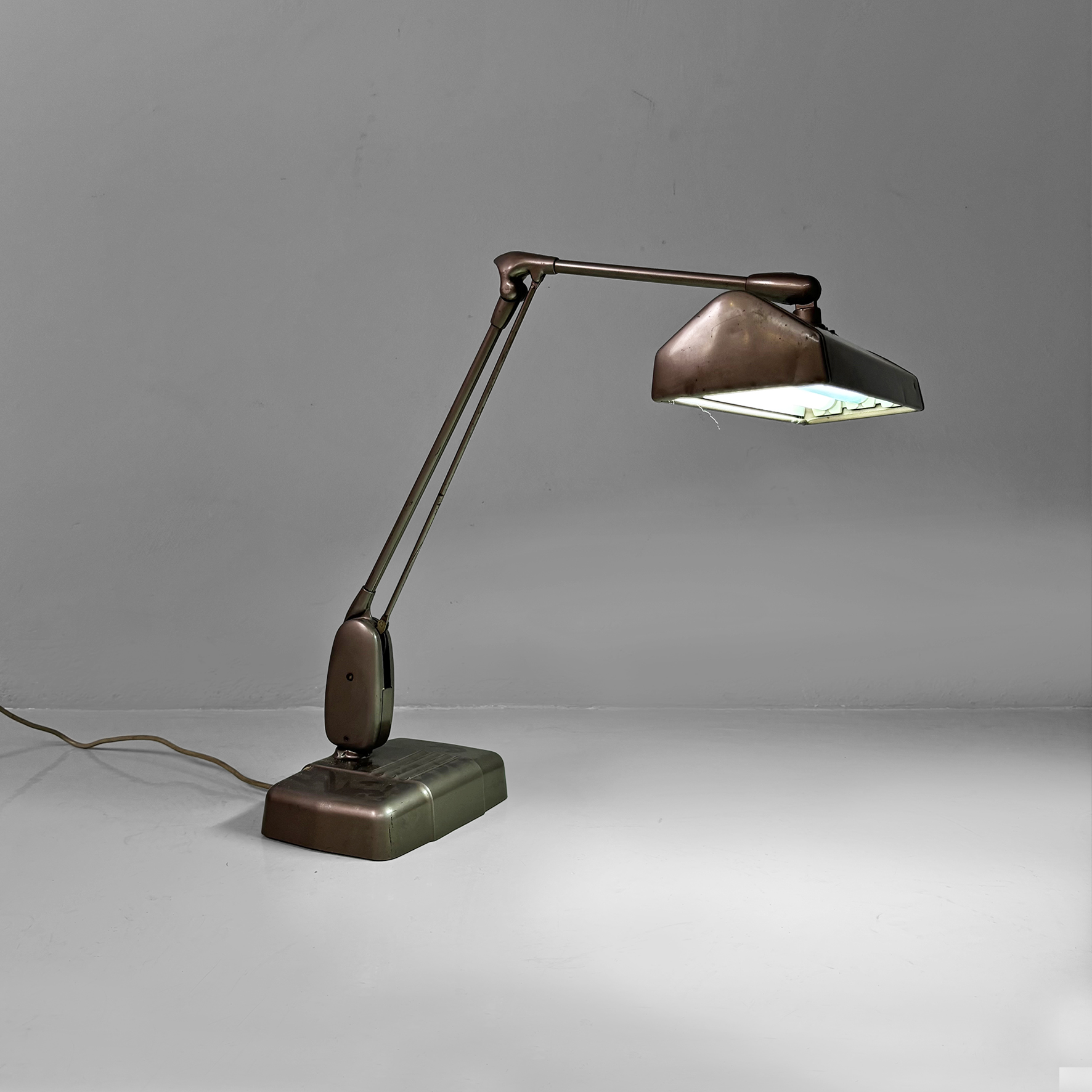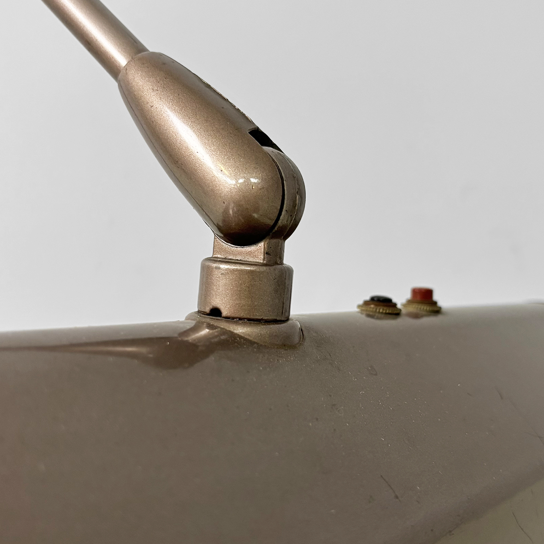 Lampada da tavolo industriale galleggiante o da scrivania, rientrante nella categoria delle “floating fixtures” utilizzate in laboratorio. La struttura è interamente in metallo, di colore viola chiaro tendente al grigio, ed è provvista di un braccio diviso in due parti, la cui parte bassa ruota sulla sua base rettangolare per orientarla in ogni posizione. La parte alta del braccio a sua volta permette il posizionamento del diffusore in alto e in basso a seconda dell’utilizzo. Diffusore contenente tre neon, e sul quale sono posti due interruttori on e off, di cui uno rosso e uno nero. Due dei tre neon emettono luce bianca, mentre quello centrale emette una luce rosata più flebile, probabilmente dovuta all’usura dello stesso supporto, che non rovina il complessivo effetto e utilizzo della lampada.