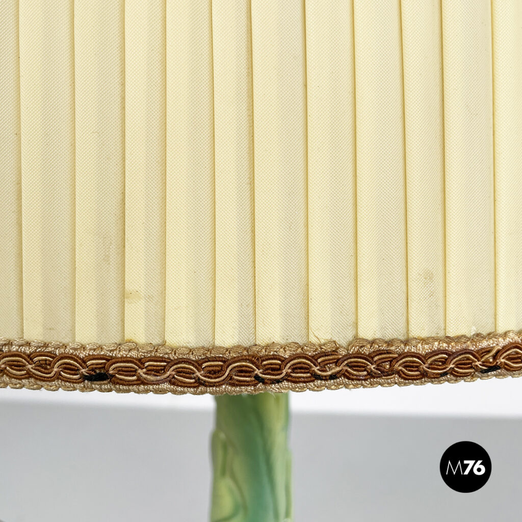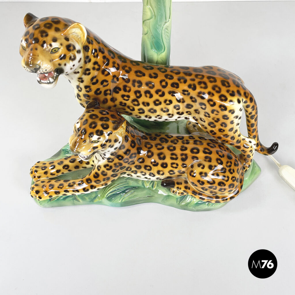 Lampada da tavolo con paralume ovale in tessuto plissettato beige e rifinito con passamaneria marrone. La base in ceramica dipinta è composta da due giaguari a bocca aperta, uno seduto e uno sulle quattro zampe, su dell’erba e del fogliame verde.