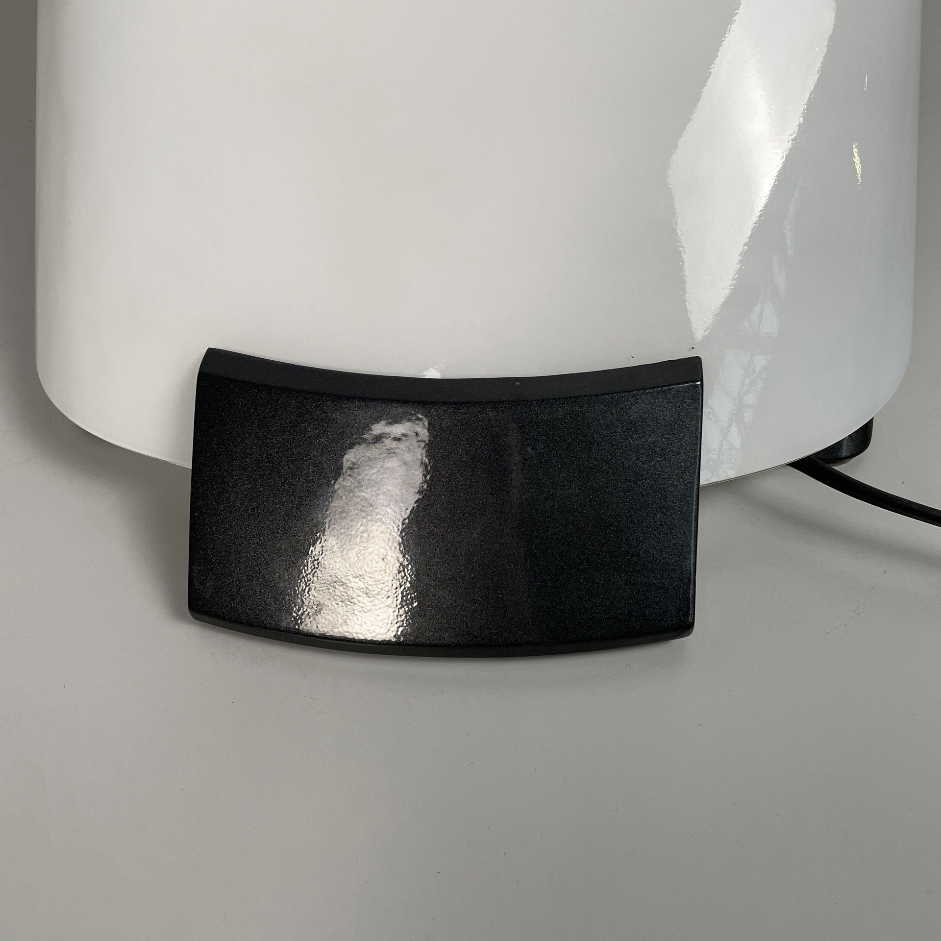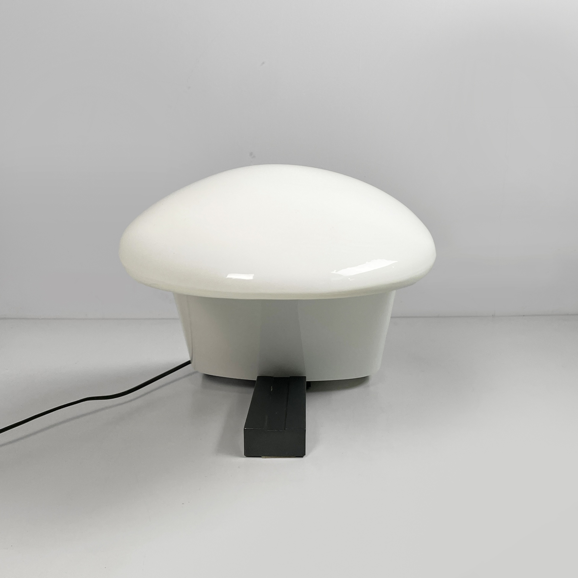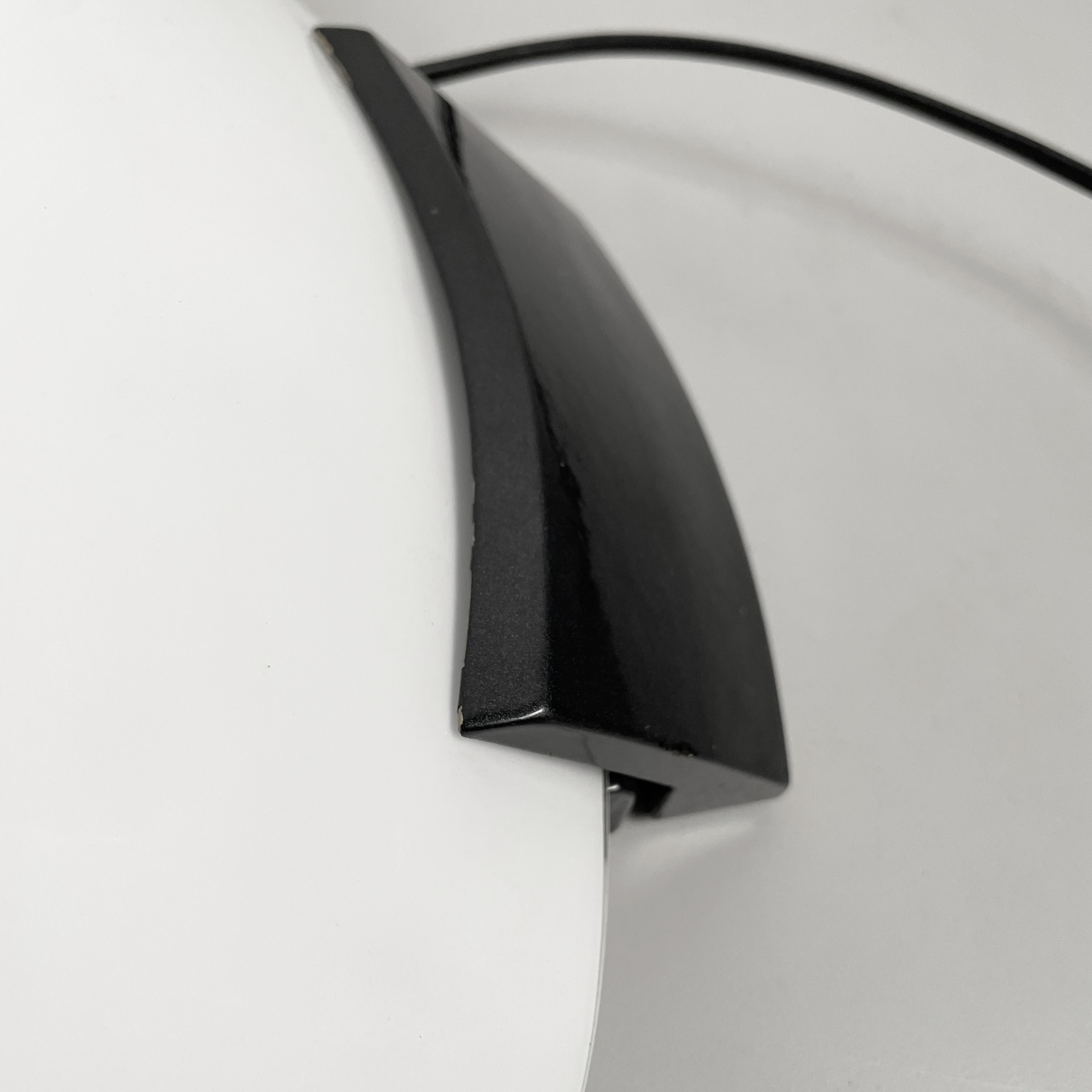 Lampada da tavolo con diffusore dalle forme tonde in vetro opalino. La base è in metallo verniciato nero.
