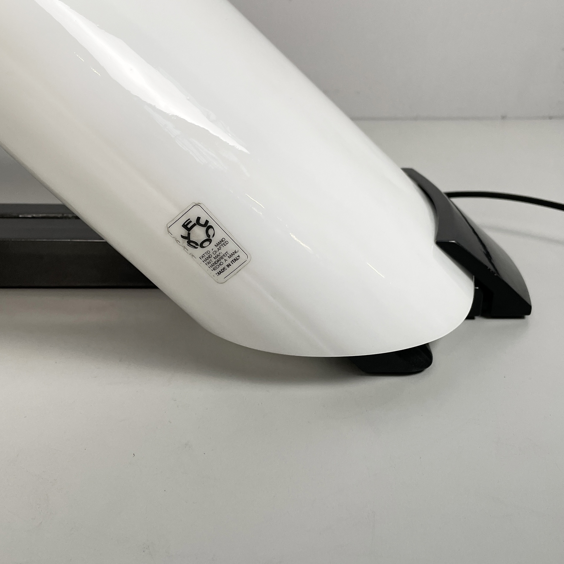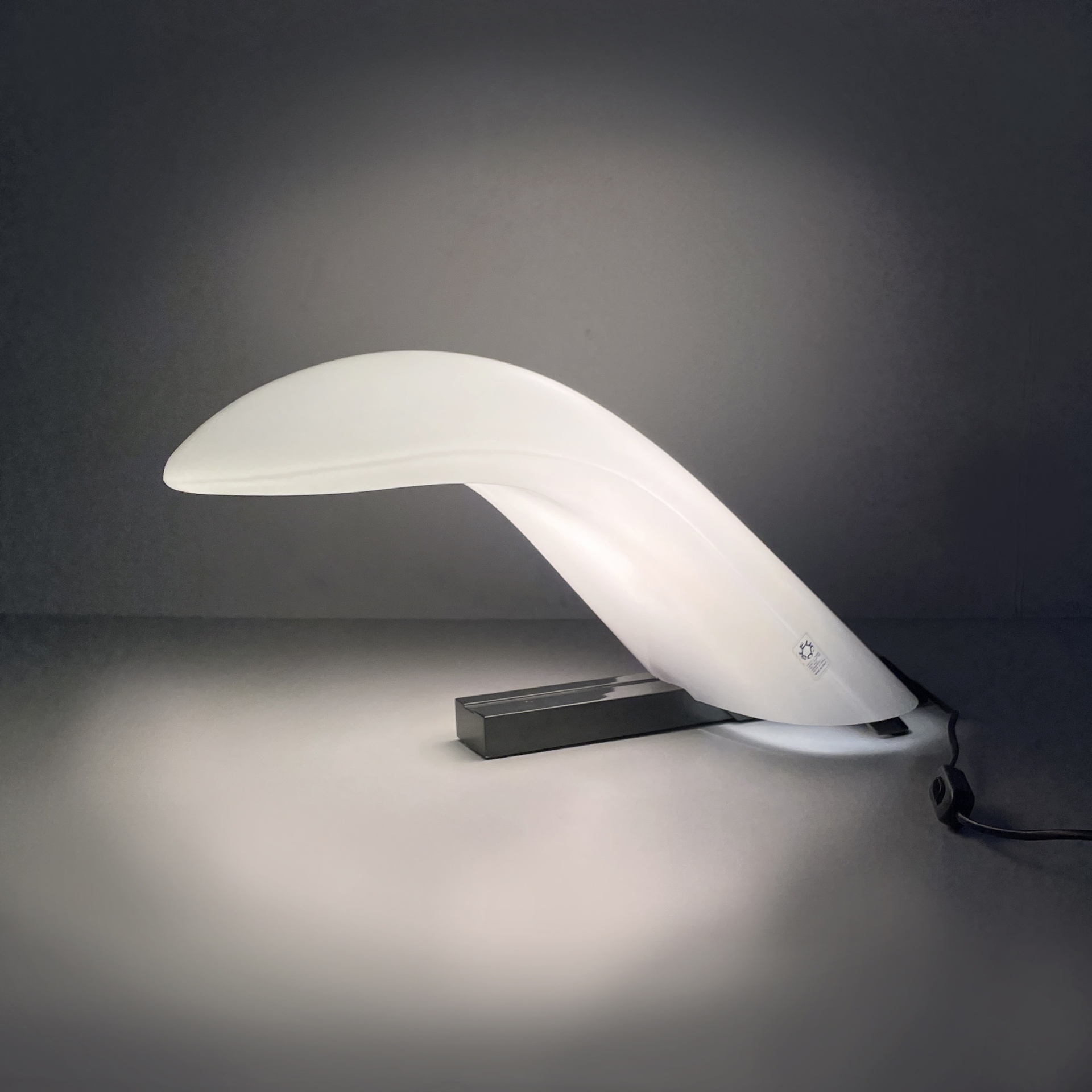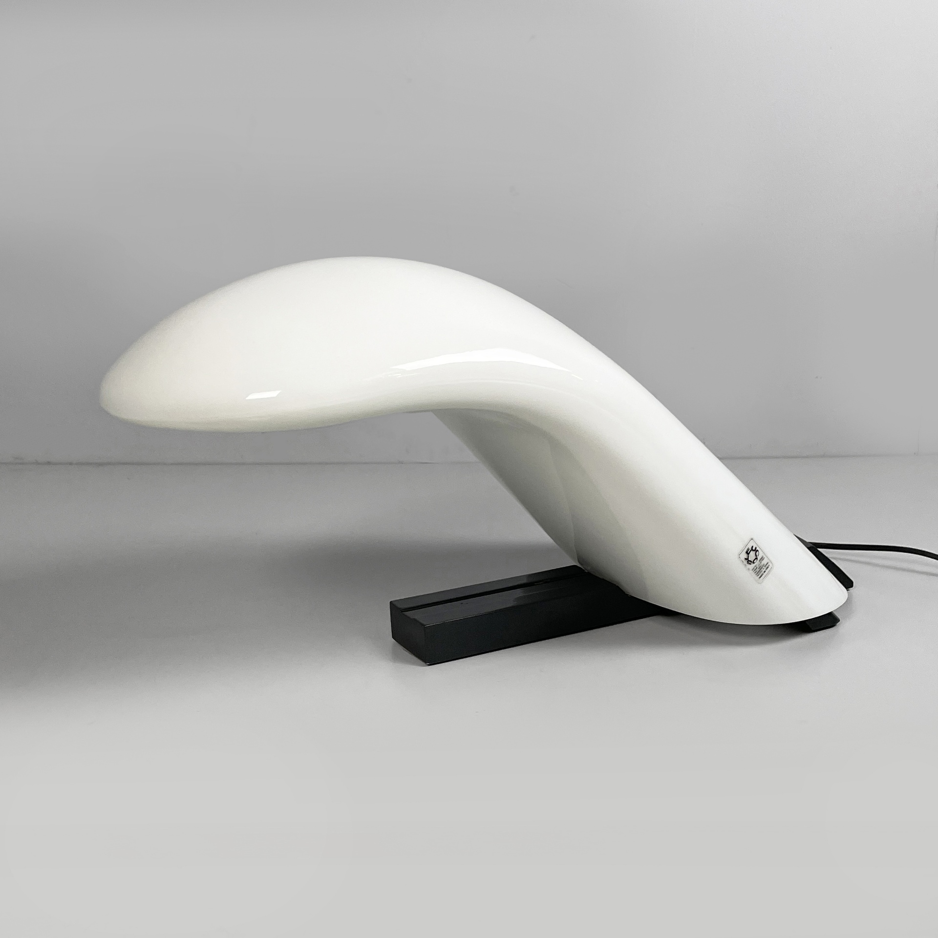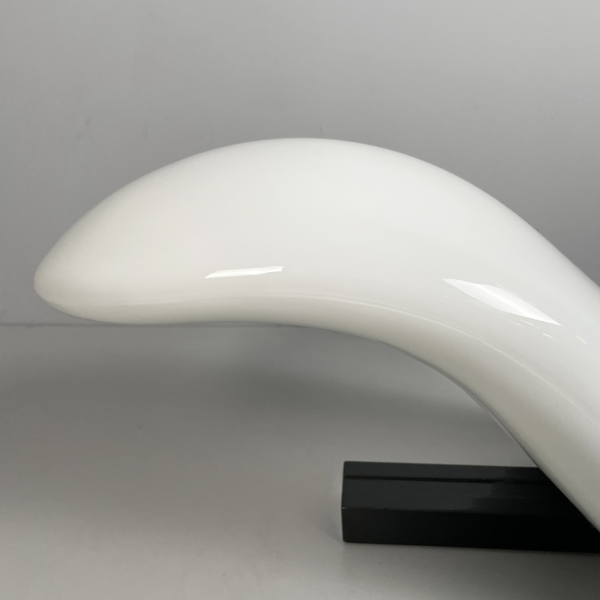 Lampada da tavolo con diffusore dalle forme tonde in vetro opalino. La base è in metallo verniciato nero.