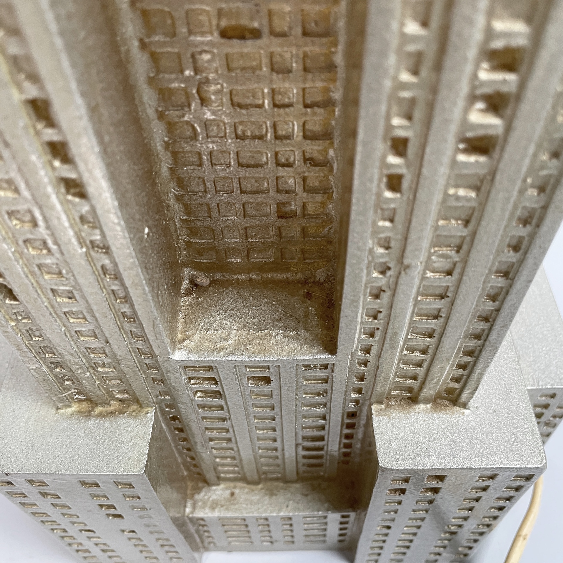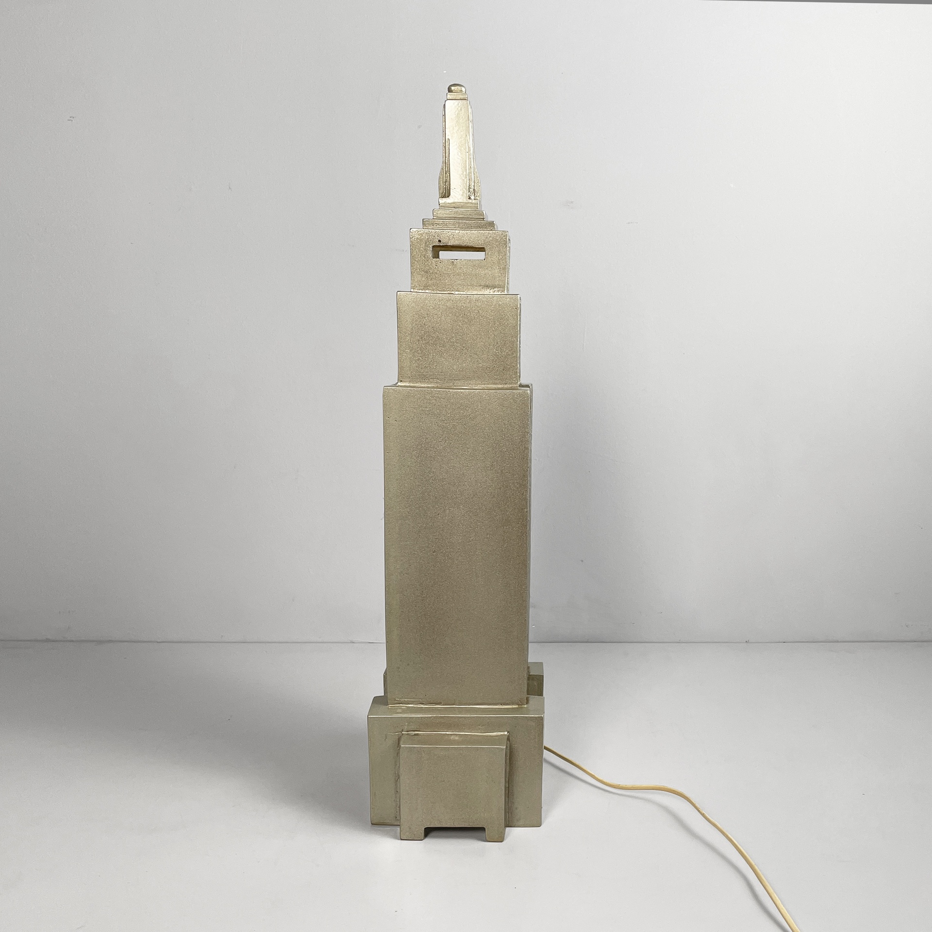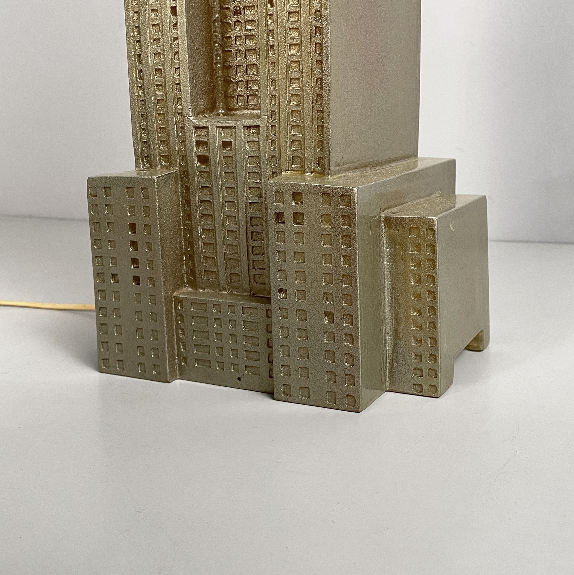 Lampada da tavolo a forma di grattacielo, interamente in plastica oro-argento.