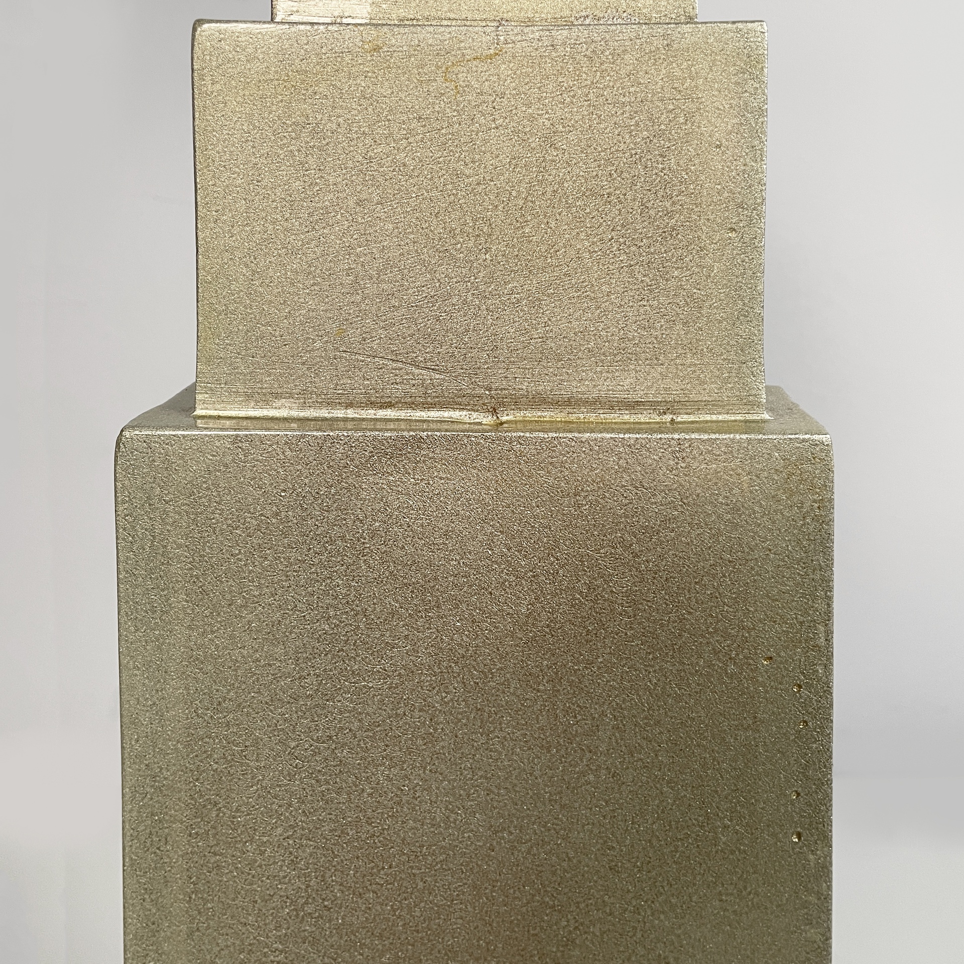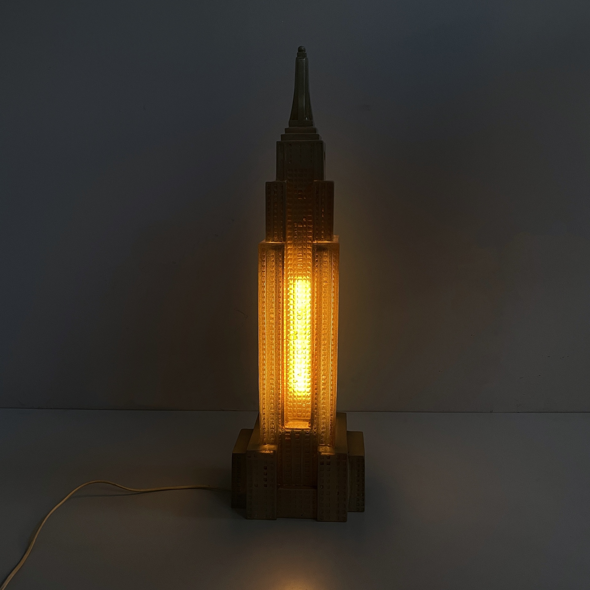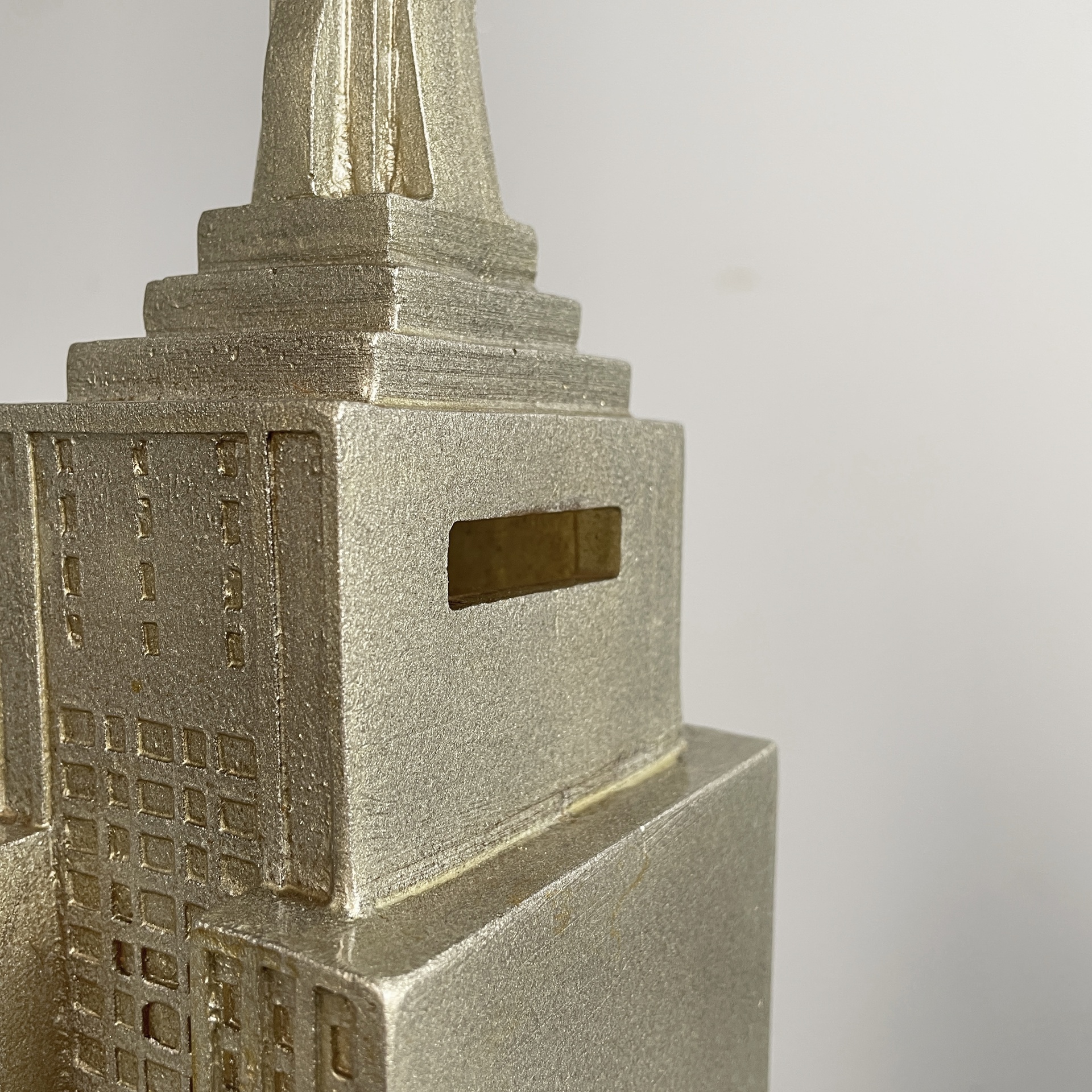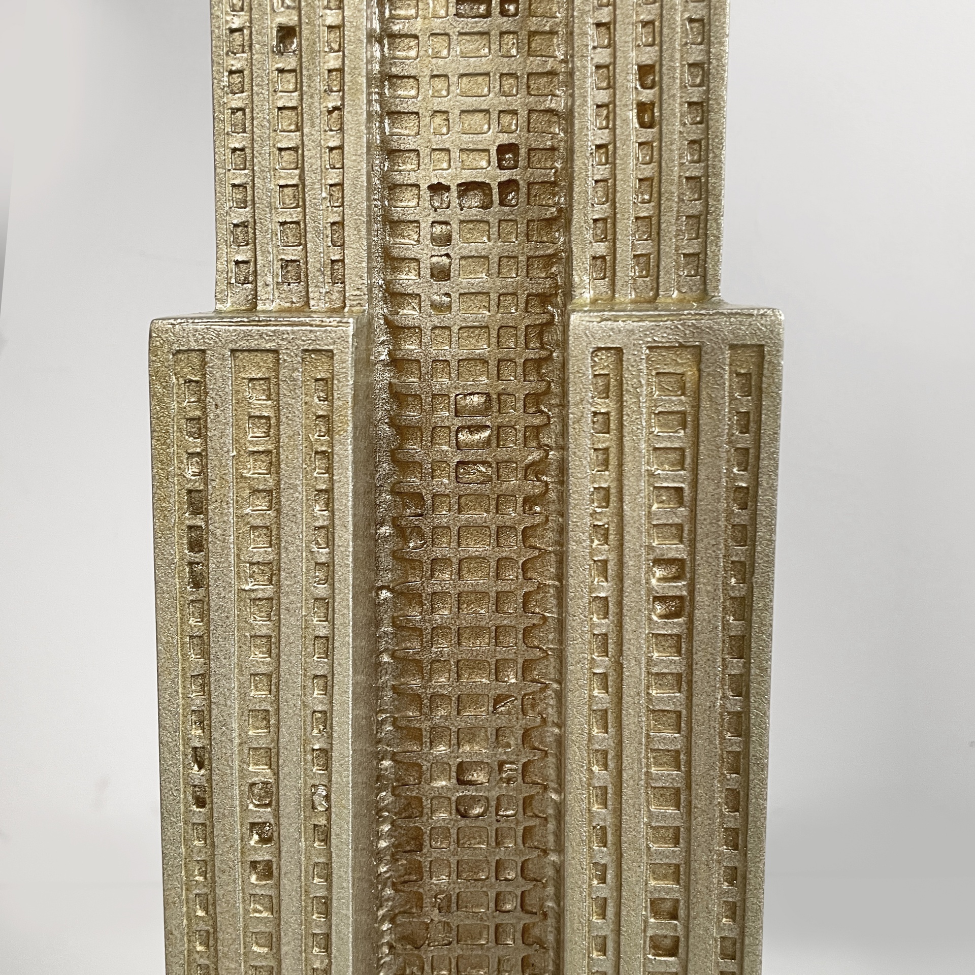 Lampada da tavolo a forma di grattacielo, interamente in plastica oro-argento.