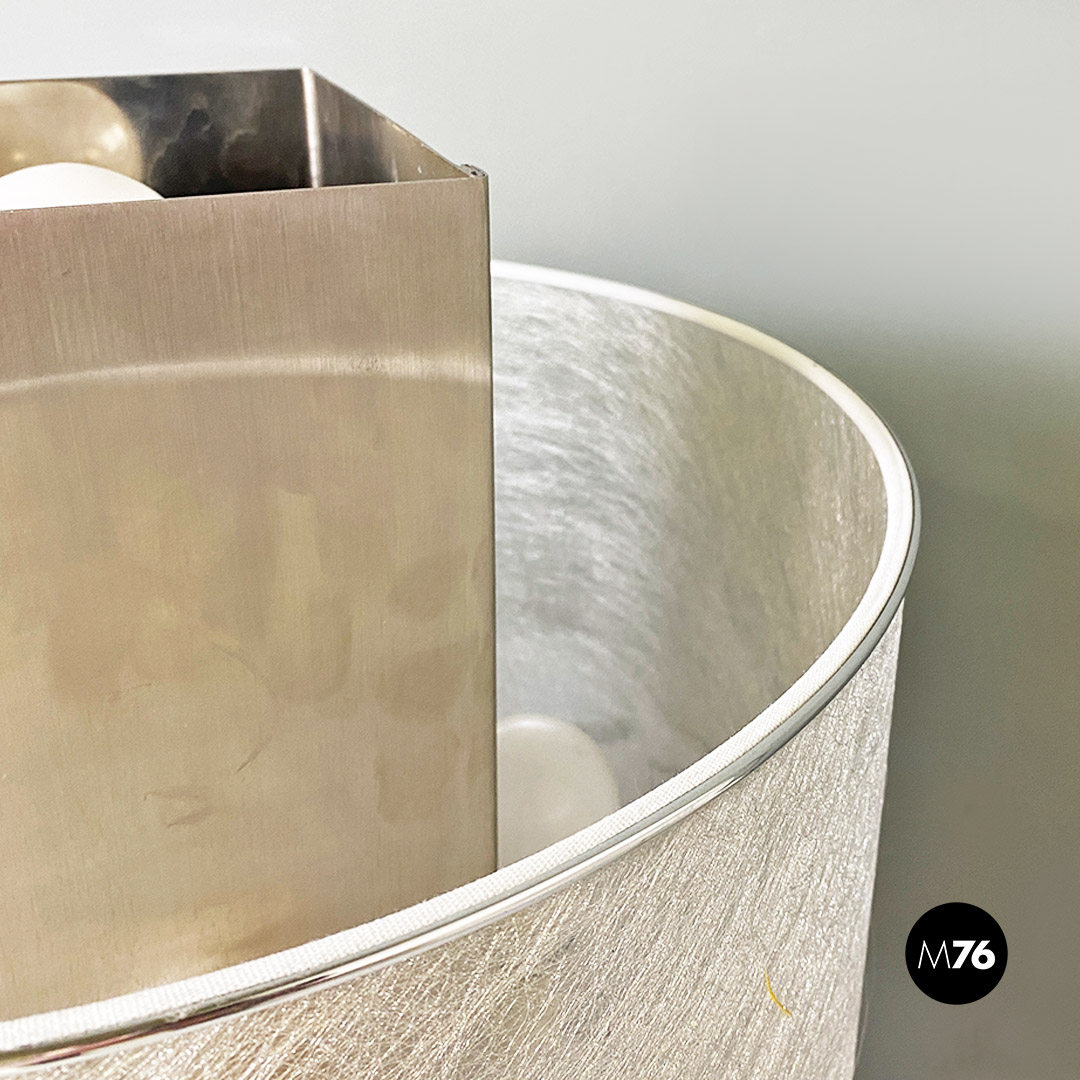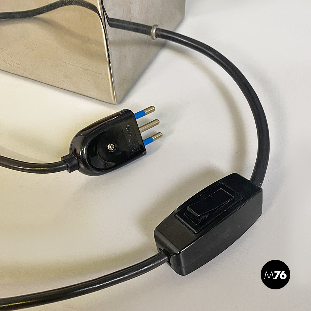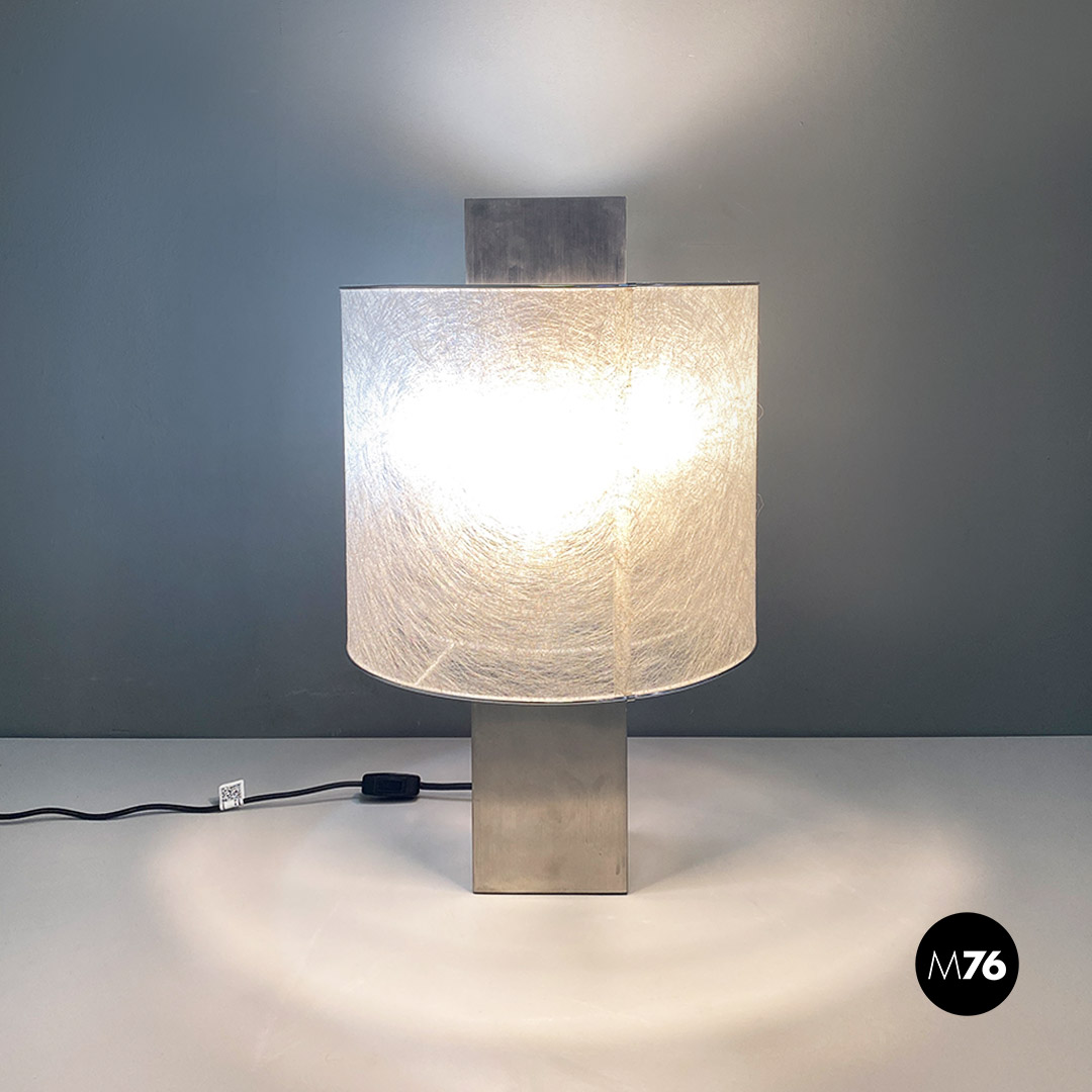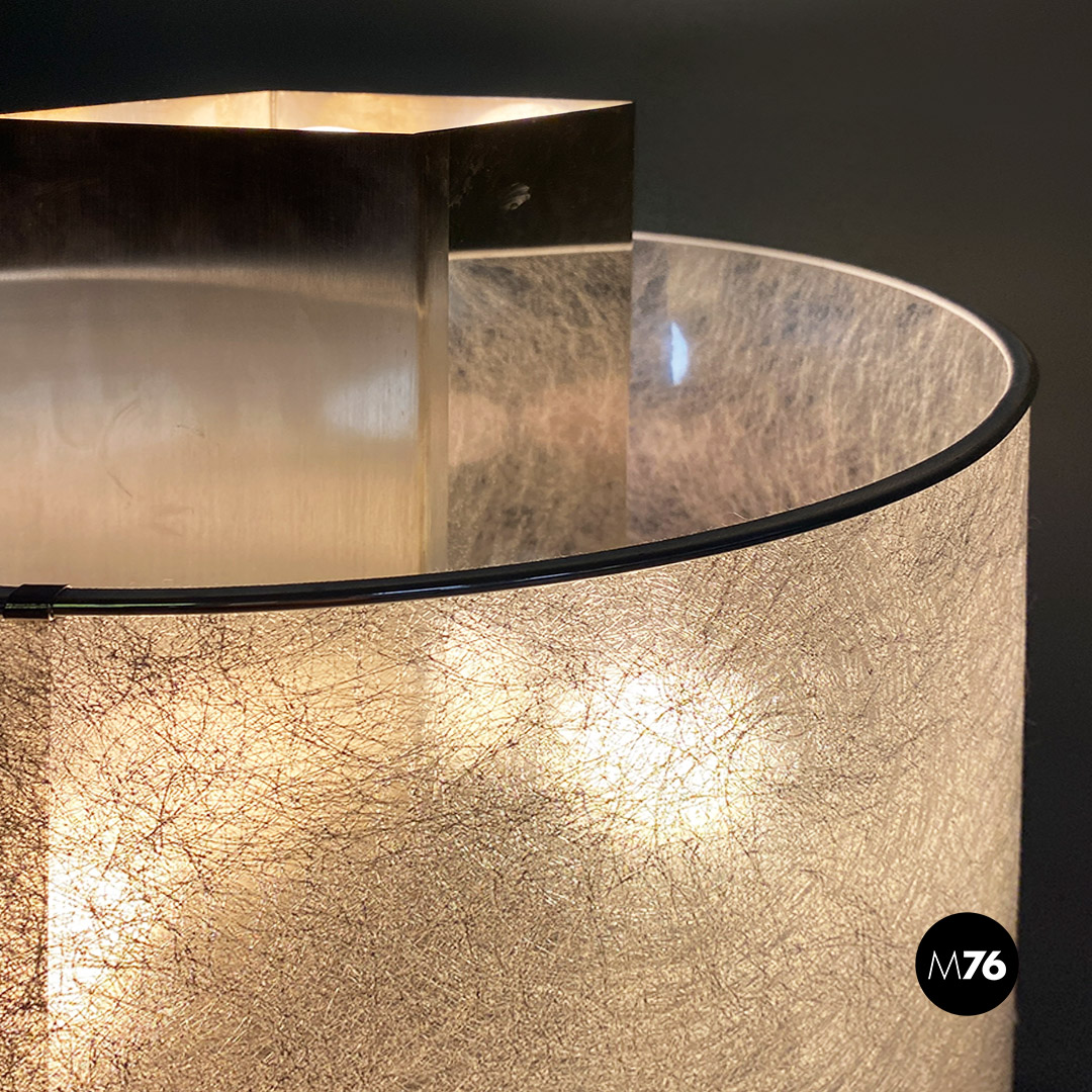 Lampada da tavolo o abat-jour con base quadrata in acciaio cromato Il paralume cilindrico ha finitura semi trasparente con filamenti e bordini in alluminio, che richiamano l’acciaio che ne costituisce la struttura di base. Presenta delle E27 per ogni lato ed un quinto ed ultimo supporto E27 posto nella parte superiore ed interna al parallelepipedo centrale.